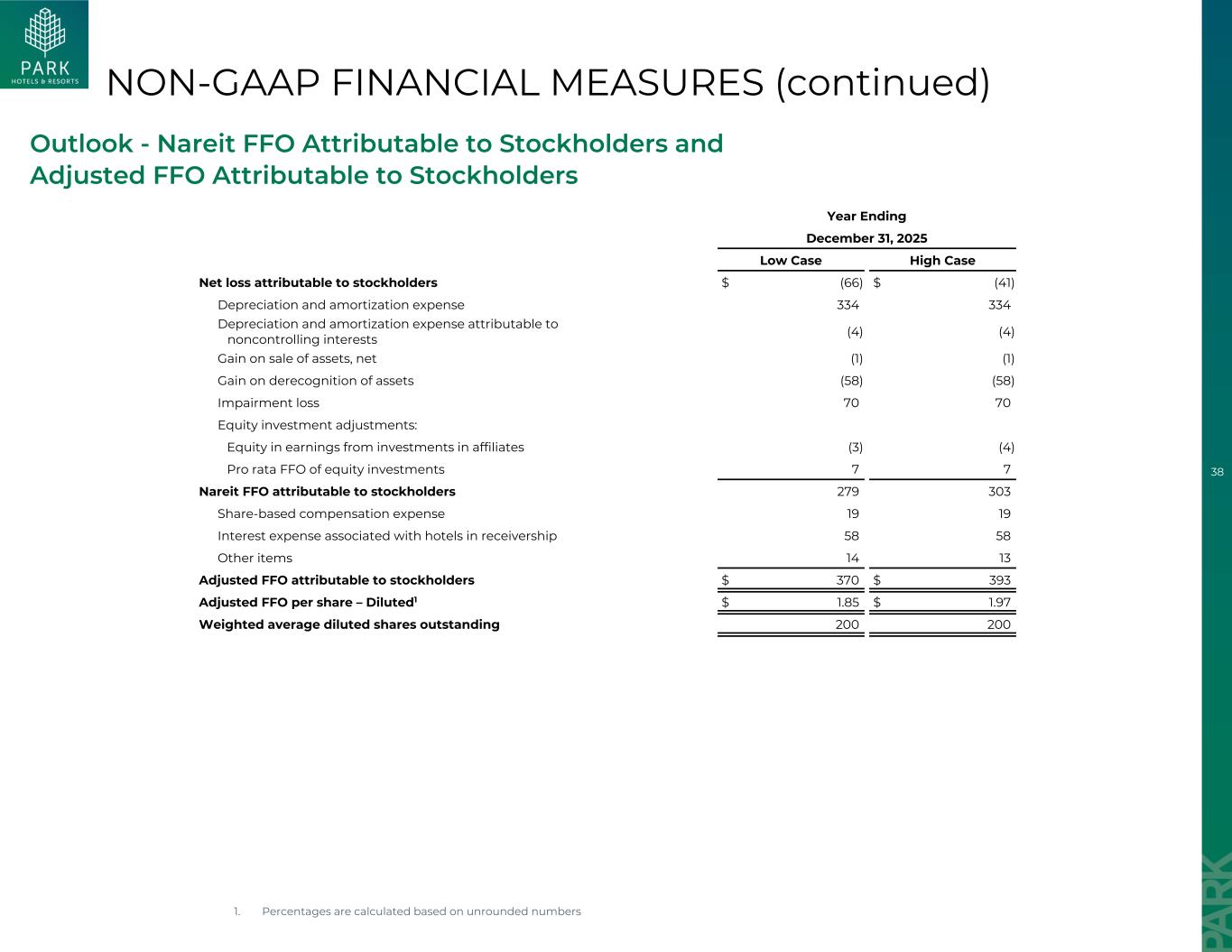 37 NON-GAAP FINANCIAL MEASURES (continued) Outlook - Comparable Hotel Adjusted EBITDA, Comparable Hotel Revenues and Comparable Hotel Adjusted EBITDA Margin Year Ending December 31, 2025 Low Case High Case Net loss $ (60) $ (35) Depreciation and amortization expense 334 334 Interest income (9) (9) Interest expense 209 209 Interest expense associated with hotels in receivership 58 58 Income tax expense 11 11 Interest expense, income tax and depreciation and amortization included in equity in earnings from investments in affiliates 8 8 EBITDA 551 576 Gain on sale of assets, net (1) (1) Gain on derecognition of assets (58) (58) Share-based compensation expense 19 19 Impairment loss 70 70 Other items 14 14 Adjusted EBITDA 595 620 Less: Adjusted EBITDA from investments in affiliates (18) (20) Add: All other 57 57 Comparable Hotel Adjusted EBITDA $ 634 $ 657 Year Ending December 31, 2025 Low Case High Case Total Revenues $ 2,521 $ 2,549 Less: Other revenue (93) (93) Hotel Revenues 2,428 2,456 Less: Revenues from hotels disposed of (15) (15) Comparable Hotel Revenues $ 2,413 $ 2,441 Year Ending December 31, 2025 Low Case High Case Total Revenues $ 2,521 $ 2,549 Operating income $ 206 $ 231 Operating income margin1 8.2 % 9.1 % Comparable Hotel Revenues $ 2,413 $ 2,441 Comparable Hotel Adjusted EBITDA $ 634 $ 657 Comparable Hotel Adjusted EBITDA margin1 26.3 % 26.9 % 1. Percentages are calculated based on unrounded numbers