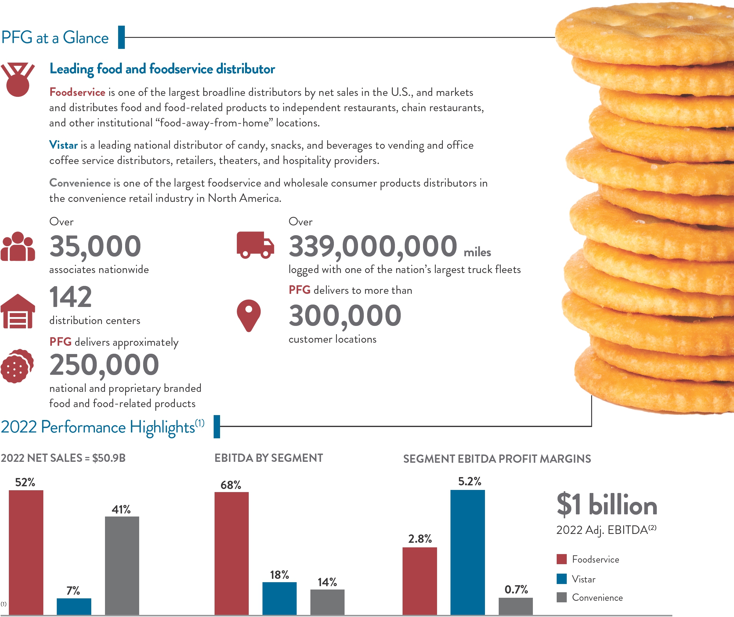The past several years have certainly presented unique challenges for our industry, customers and associates. The past 12 months have seen a disrupted supply chain, high food-cost inflation and rising fuel prices. Throughout it all, the dedication of PFG’s associates has allowed our company to manage the challenges and build a stronger, more resilient organization. We believe this will serve us well for the years ahead. I see a bright future for PFG and thank our entire organization for making that possible.