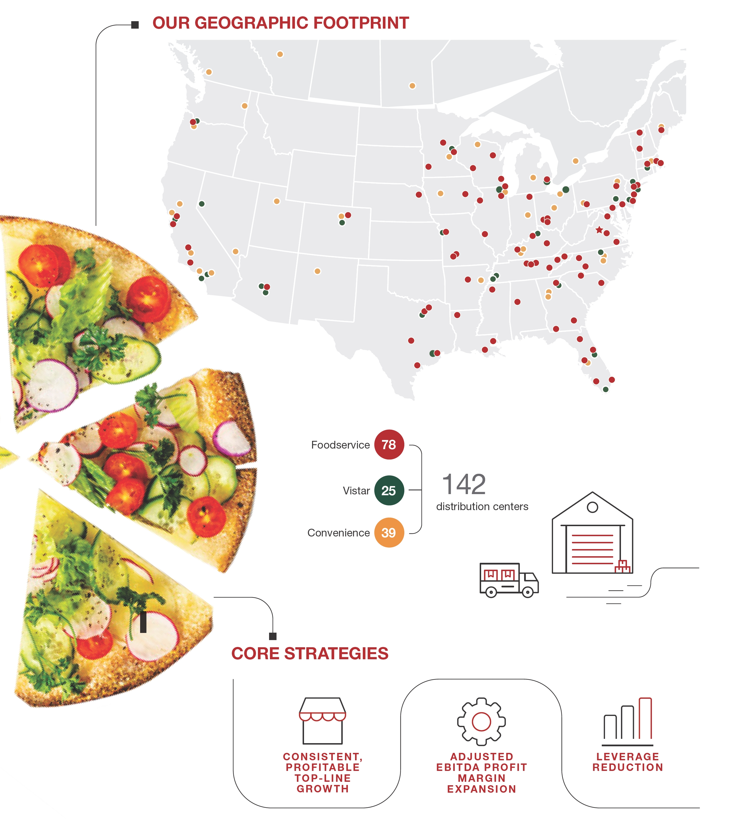 EXECUTING OUR STRATEGIC PRIORITIES Our business is focused on three key strategic priorities that guide how our organization executes every day: 1) consistent, profitable top-line growth 2) Adjusted EBITDA profit margin expansion and 3) leverage reduction. I am pleased to report that we made great progress in all three areas during fiscal 2023. Our revenue, which increased 13% in the fiscal year, was the result of strong sales growth across our business segments and was achieved despite lower inflation as we exited the fiscal year. This is a testament to our company’s ability to drive case growth by adding business in key accounts, gaining market share and expanding into new lines of business. We have invested behind technology and resources to support our 35,000+ associates to help make their work more efficient. We have introduced our new online ordering platform, Customer First, to the marketplace. We believe this new tool will make our team more efficient and produce increased cross-selling revenue opportunities across all three business segments. Our growth is focused on highly profitable channels, which is one of the key drivers for our second goal—Adjusted EBITDA profit margin expansion. During the fiscal year, we built upon profitable revenue growth by being more efficient as an organization and disciplined on our cost line. The result was 34% Adjusted EBITDA growth, representing 38 bps of Adjusted EBITDA profit margin expansion improvement over fiscal 2022. This strong bottom-line result produced $832 million of operating cash flow during the fiscal year. Our strong cash flow profile enabled us |
