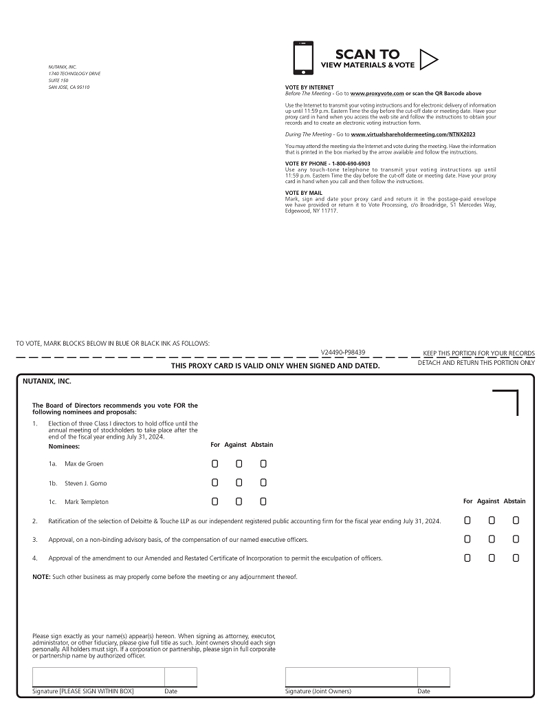 On behalf of our Board of Directors, it is our pleasure to invite you to attend the 2023 annual meeting of stockholders (including any adjournment or postponement thereof, the “Annual Meeting”) of Nutanix, Inc. The Annual Meeting will be held virtually via live webcast at www.virtualshareholdermeeting.com/NTNX2023 on Friday, December 8, 2023, at 9:00 a.m., Pacific Time.