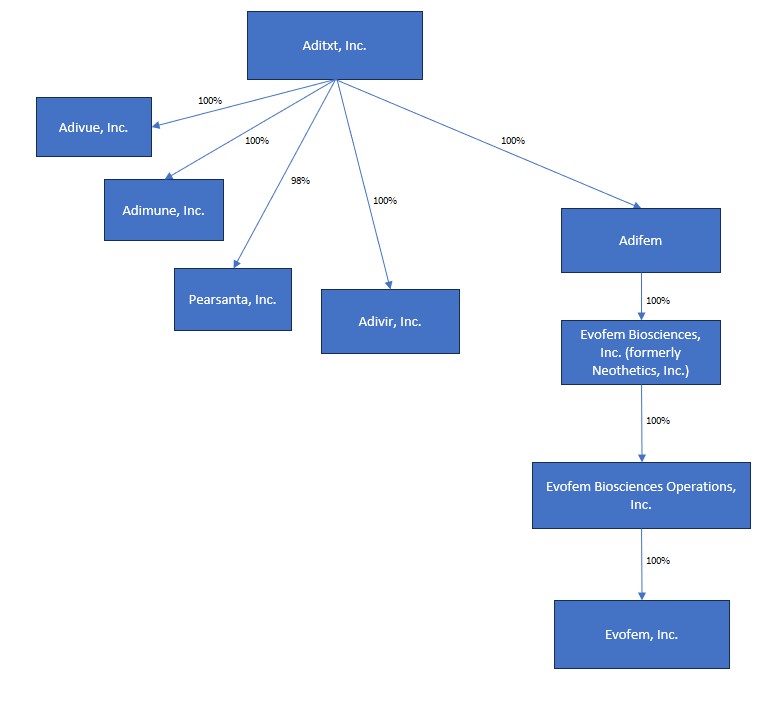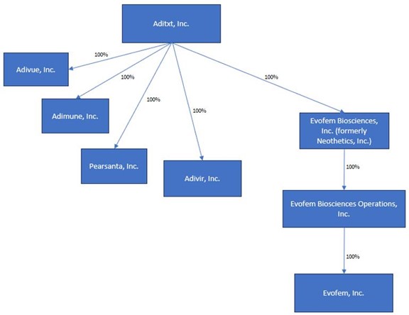 Examples of forward-looking statements include, among others, statements made in this proxy statement regarding the proposed transactions contemplated by the Merger Agreement, including the benefits of the Merger, integration plans, expected synergies and revenue opportunities, anticipated future financial and operating performance and results, including estimates for growth, other performance metrics, projections of market opportunity, expected management and governance of the Surviving Company, and expected timing of the Merger. Forward-looking statements are neither historical facts nor assurances of future performance. Instead, these statements are based on various assumptions, whether or not identified in this proxy statement, and on the current expectations of Evofem’s and Aditxt’s respective management and are not predictions of actual performance. These forward-looking statements are provided for illustrative purposes only and are not intended to serve, and must not be relied on by any investor, as a guarantee, an assurance, a prediction or a definitive statement of fact or probability. Actual events and circumstances are difficult or impossible to predict and will differ from assumptions. Many actual events and circumstances are beyond the control of the Company and/or Aditxt. Some important factors that could cause actual results to differ materially from those in any forward-looking statements could include changes in domestic and foreign business, market, financial, political and legal conditions.