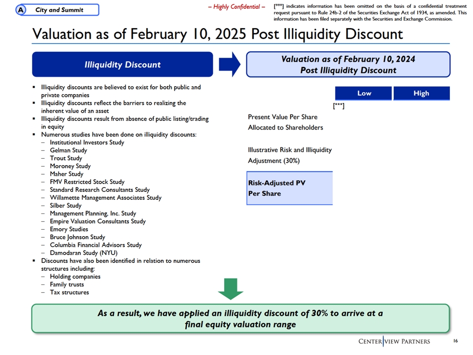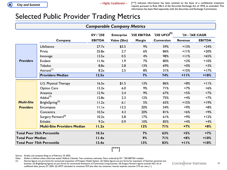 [***] indicates information has been omitted on the basis of a confidential treatment -- Highly Confidential -- A City and Summit request pursuant to Rule 24b-2 of the Securities Exchange Act of 1934, as amended. This information has been filed separately with the Securities and Exchange Commission. Selected Public Provider Trading Metrics Comparable Company Metrics (5) EV / '25E Enterprise '25E EBITDA '25E UFCF '24 - '26E CAGR Company EBITDA Value ($bn) Margin Conversion Revenue EBITDA LifeStance 27.7x $3.5 9% 59% +13% +24% Privia 25.8x 2.7 6% 86% +11% +20% Innovage 13.5x 0.5 4% 98% +11% +65% Providers Evolent 11.4x 1.9 7% 80% +2% +10% Teladoc 8.8x 2.8 13% 69% +0% +3% (1) Astrana 8.2x 2.5 8% 31% +15% +17% Providers Median 12.5x 7% 74% +11% +18% U.S. Physical Therapy 16.5x $1.5 13% 86% +8% +11% Option Care 13.3x 6.0 9% 71% +7% +6% Aveanna 12.9x 2.4 9% 67% +5% +7% (2) Addus 12.8x 2.3 12% 75% +4% +7% (3) Multi-Site BrightSpring 11.2x 6.1 5% 65% +15% +19% Providers Encompass 11.1x 13.2 20% 54% +9% +8% Concentra 10.5x 4.3 20% 81% +6% +9% (4) Surgery Partners 10.2x 5.8 17% 61% +9% +12% Enhabit 9.2x 0.9 10% 85% +4% +4% Multi-Site Providers Median 11.2x 12% 71% +7% +8% Total Peer 25th Percentile 10.3x 7% 63% +5% +7% Total Peer Median 11.4x 9% 71% +8% +10% Total Peer 75th Percentile 13.4x 13% 83% +11% +18% [***] Source: FactSet and company filings as of February 10, 2025. Note: Dollars in billions unless otherwise stated. Reflects Calendar Year consensus estimates. Peers ordered by EV / ’25E EBITDA multiple. (1) Astrana figures are pro forma for announced acquisition of Prospect Health System. (2) Addus figures are pro forma for acquisition of Gentiva’s personal care 12 business. (3) BrightSpring figures are pro forma for announced divestiture of Community Living business. (4) Surgery Partners figures exclude NCI. As of unaffected date, January 27, 2025. (5) UFCF calculated as consensus FCF plus after-tax consensus interest expense; assumes 21% tax rate. [***]