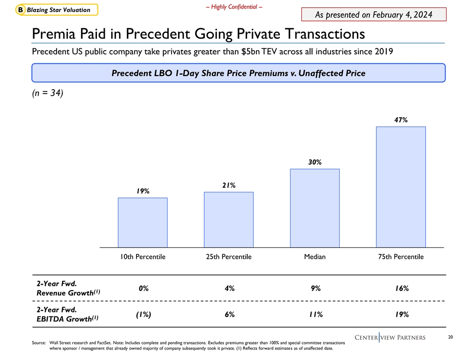 -- Highly Confidential -- B Blazing Star Valuation As presented on February 4, 2024 Premia Paid in Precedent Going Private Transactions Precedent US public company take privates greater than $5bn TEV across all industries since 2019 Precedent LBO 1-Day Share Price Premiums v. Unaffected Price (n = 34) 47% 30% 21% 19% 10th Percentile 25th Percentile Median 75th Percentile 2-Year Fwd. 0% 4% 9% 16% (1) Revenue Growth 2-Year Fwd. (1%) 6% 11% 19% (1) EBITDA Growth 20 Source: Wall Street research and FactSet. Note: Includes complete and pending transactions. Excludes premiums greater than 100% and special committee transactions where sponsor / management that already owned majority of company subsequently took it private. (1) Reflects forward estimates as of unaffected date.