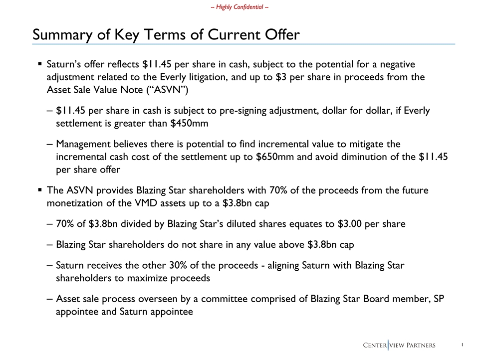 -- Highly Confidential -- Summary of Key Terms of Current Offer ▪ Saturn’s offer reflects $11.45 per share in cash, subject to the potential for a negative adjustment related to the Everly litigation, and up to $3 per share in proceeds from the Asset Sale Value Note (“ASVN”) – $11.45 per share in cash is subject to pre-signing adjustment, dollar for dollar, if Everly settlement is greater than $450mm – Management believes there is potential to find incremental value to mitigate the incremental cash cost of the settlement up to $650mm and avoid diminution of the $11.45 per share offer ▪ The ASVN provides Blazing Star shareholders with 70% of the proceeds from the future monetization of the VMD assets up to a $3.8bn cap – 70% of $3.8bn divided by Blazing Star’s diluted shares equates to $3.00 per share – Blazing Star shareholders do not share in any value above $3.8bn cap – Saturn receives the other 30% of the proceeds - aligning Saturn with Blazing Star shareholders to maximize proceeds – Asset sale process overseen by a committee comprised of Blazing Star Board member, SP appointee and Saturn appointee 1