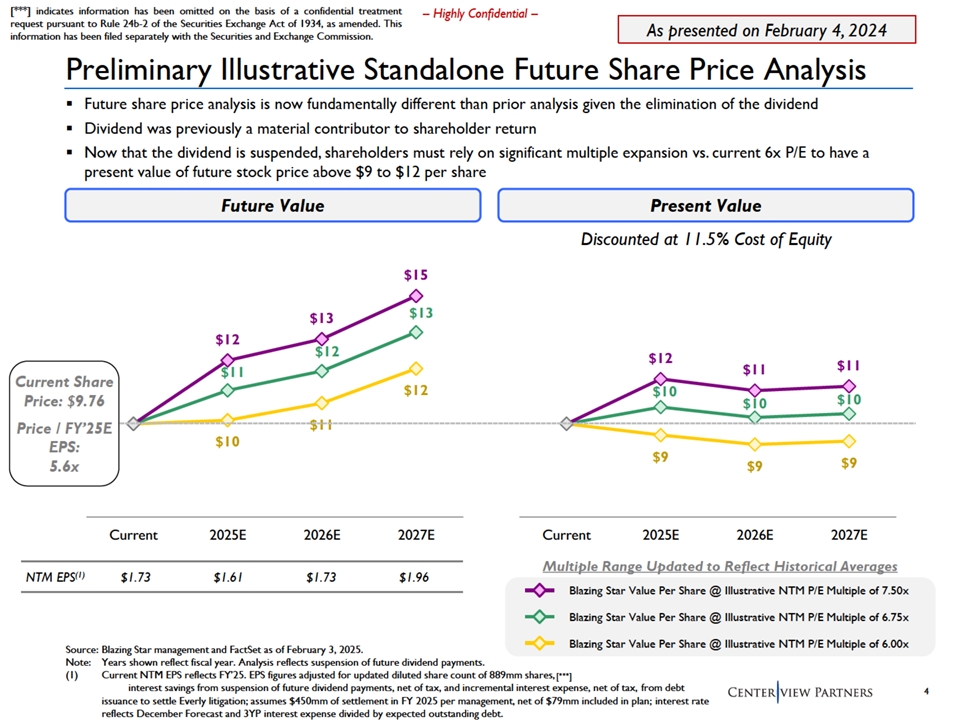 -- Highly Confidential -- th Financial Analyses Discussed with Board on February 4 Analyses presented were preliminary and illustrative ▪ Analyst Price Targets: Sell-Side analyst 12-month forward price targets have a median of $11 (low of $7 and high of $15) - 12 of 14 analysts at $12 or lower ▪ Future Share Price: Yields present value of future share price of ~$9 to ~$12 per (1) share, assuming 6.0-7.5x NTM P/E (vs. unaffected of 5.1x) ▪ Discounted Cash Flow: Implies value of ~$9.75 to ~$18.00 per share, with two-thirds of value being driven by the terminal value and expectations for enduring stability in performance ▪ Sum-of-the-Parts: Implies value of ~$8 to ~$14 per share; uncertainties around USRP and VMD contribute to the width of the range ▪ Precedent Transaction Premiums: Premiums in comparably sized public company go-private transactions have a median of 30% and for companies with comparable financial characteristics (revenue and EBITDA growth), the premiums are ~20% 3 th Note: Valuation summary reflects valuation presented to the Blazing Star Board on February 4 , 2025. th (1) Based on unaffected share price of $8.85 as of December 9 , 2024; represents FY’25E P/E.