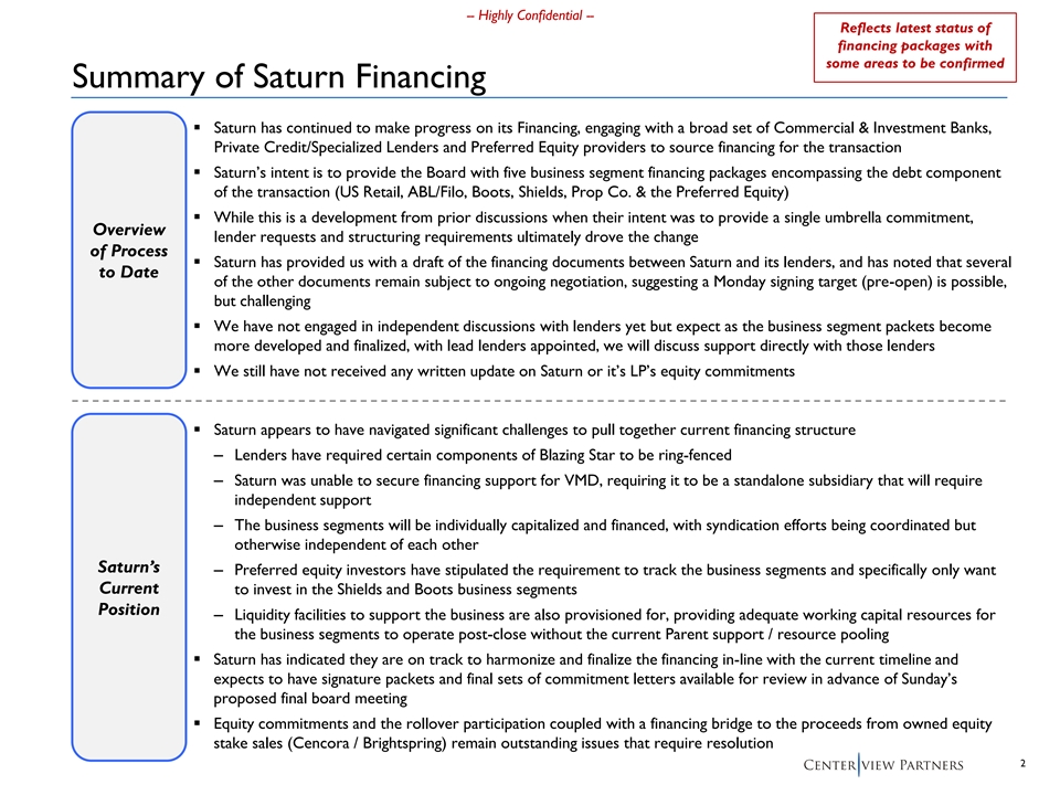 -- Highly Confidential -- Reflects latest status of financing packages with some areas to be confirmed Summary of Saturn Financing ▪ Saturn has continued to make progress on its Financing, engaging with a broad set of Commercial & Investment Banks, Private Credit/Specialized Lenders and Preferred Equity providers to source financing for the transaction ▪ Saturn’s intent is to provide the Board with five business segment financing packages encompassing the debt component of the transaction (US Retail, ABL/Filo, Boots, Shields, Prop Co. & the Preferred Equity) ▪ While this is a development from prior discussions when their intent was to provide a single umbrella commitment, Overview lender requests and structuring requirements ultimately drove the change of Process ▪ Saturn has provided us with a draft of the financing documents between Saturn and its lenders, and has noted that several to Date of the other documents remain subject to ongoing negotiation, suggesting a Monday signing target (pre-open) is possible, but challenging ▪ We have not engaged in independent discussions with lenders yet but expect as the business segment packets become more developed and finalized, with lead lenders appointed, we will discuss support directly with those lenders ▪ We still have not received any written update on Saturn or it’s LP’s equity commitments ▪ Saturn appears to have navigated significant challenges to pull together current financing structure – Lenders have required certain components of Blazing Star to be ring-fenced – Saturn was unable to secure financing support for VMD, requiring it to be a standalone subsidiary that will require independent support – The business segments will be individually capitalized and financed, with syndication efforts being coordinated but otherwise independent of each other Saturn’s – Preferred equity investors have stipulated the requirement to track the business segments and specifically only want Current to invest in the Shields and Boots business segments Position – Liquidity facilities to support the business are also provisioned for, providing adequate working capital resources for the business segments to operate post-close without the current Parent support / resource pooling ▪ Saturn has indicated they are on track to harmonize and finalize the financing in-line with the current timeline and expects to have signature packets and final sets of commitment letters available for review in advance of Sunday’s proposed final board meeting ▪ Equity commitments and the rollover participation coupled with a financing bridge to the proceeds from owned equity stake sales (Cencora / Brightspring) remain outstanding issues that require resolution 2