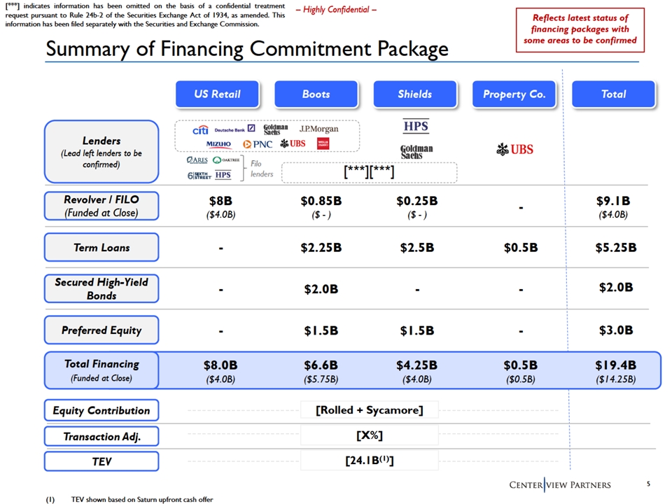 [***] indicates information has been omitted on the basis of a confidential treatment -- Highly Confidential -- request pursuant to Rule 24b-2 of the Securities Exchange Act of 1934, as amended. This Reflects latest status of information has been filed separately with the Securities and Exchange Commission. financing packages with some areas to be confirmed Current Status of Saturn’s Debt Commitment Letters ▪ Expect to recieve commitments contemplating $19.4B Total Debt, with an expected closing date funding of $14.25B (1) – US Retail - $4.0B funded ($8.0B total) • $5.0B of Asset Based Revolver Commitments (up to $2B funded at Close) • $3.0B of Asset Based Loan Commitments (up to $2B funded at Close) – International/Boots - $5.75B funded ($6.6B total) • $0.85B Asset Based Revolver Commitments Funding, • $2.25B Syndicated Term Loan B Structure • $2.0B Syndicated High Yield Bonds & Liquidity • $1.50B Privately Placed Preferred Equity – Shields - $4.0B funded ($4.25B total) (2) • $0.25B Cash Flow Based Revolver Commitments • $2.50B Privately Placed Term Loan • $1.50B Privately Placed Preferred Equity – US PropertyCo - $0.5B funded ($0.5B total) • $0.50B Syndicated Term Loan B ▪ Expect the Commitment Parties to comprise the following (single parties may span across business segments): – Asset Based Lenders: Citi, Deutsche, Goldman Sachs, JP Morgan, Mizhuo, PNC, UBS, Wells Fargo • Filo lenders include: HPS, Ares, Oaktree & Sixth Street Financing Parties – Capital Markets Investment Banks: Citi, Deutsche, Goldman Sachs, JP Morgan, Mizhuo, PNC, UBS, Wells Fargo – Privately Placed Loan Lenders: HPS, Goldman Sachs Asset Management (co-lender to HPS) – Preferred Equity Investors: with UBS likely bridging the preferred [***] 4 (1) May also include $1.0bn of AR factoring (2) Shields Revolver Commitment is expected size