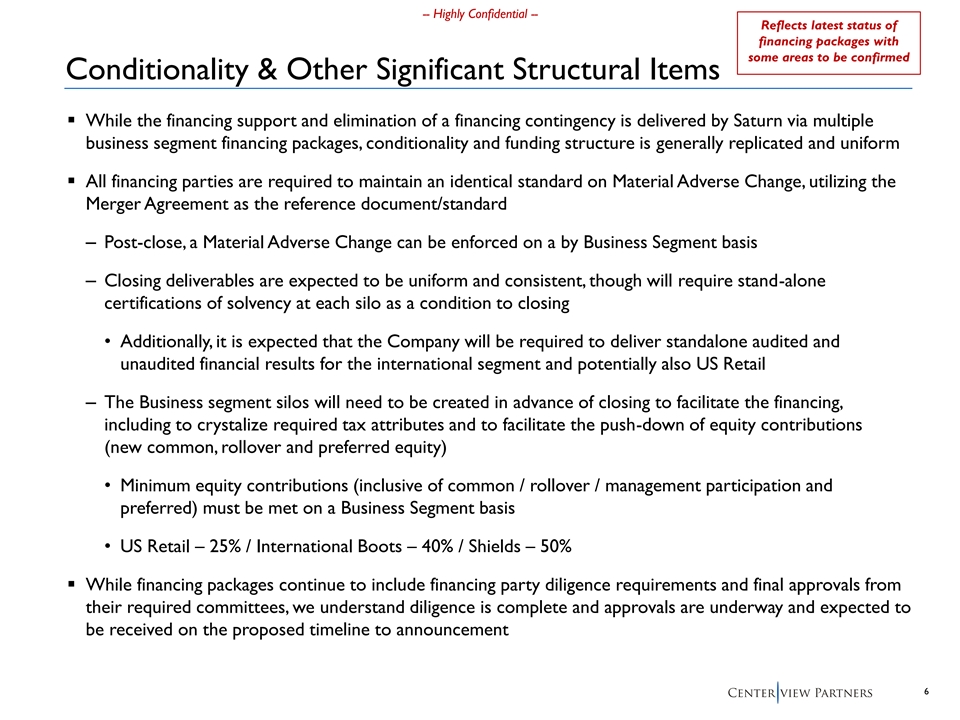 -- Highly Confidential -- Reflects latest status of financing packages with some areas to be confirmed Conditionality & Other Significant Structural Items ▪ While the financing support and elimination of a financing contingency is delivered by Saturn via multiple business segment financing packages, conditionality and funding structure is generally replicated and uniform ▪ All financing parties are required to maintain an identical standard on Material Adverse Change, utilizing the Merger Agreement as the reference document/standard – Post-close, a Material Adverse Change can be enforced on a by Business Segment basis – Closing deliverables are expected to be uniform and consistent, though will require stand-alone certifications of solvency at each silo as a condition to closing • Additionally, it is expected that the Company will be required to deliver standalone audited and unaudited financial results for the international segment and potentially also US Retail – The Business segment silos will need to be created in advance of closing to facilitate the financing, including to crystalize required tax attributes and to facilitate the push-down of equity contributions (new common, rollover and preferred equity) • Minimum equity contributions (inclusive of common / rollover / management participation and preferred) must be met on a Business Segment basis • US Retail – 25% / International Boots – 40% / Shields – 50% ▪ While financing packages continue to include financing party diligence requirements and final approvals from their required committees, we understand diligence is complete and approvals are underway and expected to be received on the proposed timeline to announcement 6