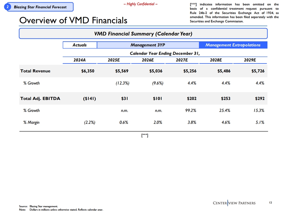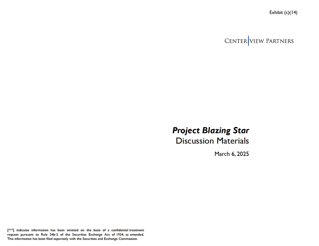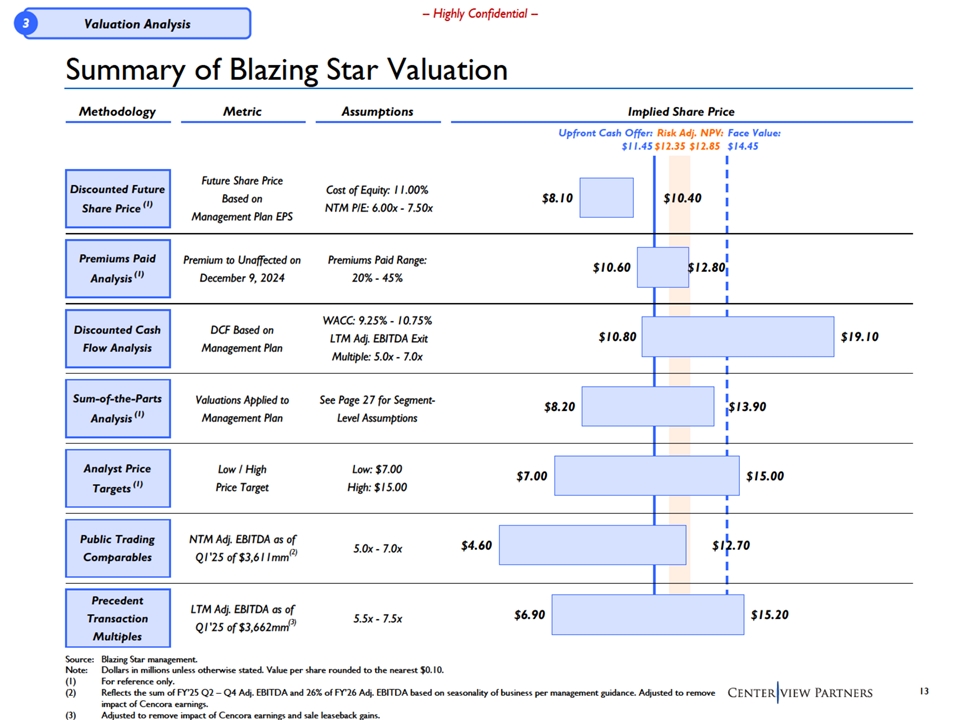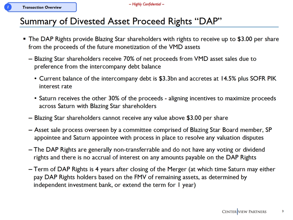 -- Highly Confidential -- Centerview Disclaimer This presentation has been prepared by Centerview Partners LLC (“Centerview”) for use solely by the Board of Directors of Blazing Star in connection with its evaluation of a proposed transaction involving Blazing Star and for no other purpose. The information contained herein is based upon information supplied by or on behalf of Blazing Star and Saturn (“Defined term for other relevant party”) and publicly available information, and portions of the information contained herein may be based upon statements, estimates and forecasts provided by Blazing Star and Saturn. Centerview has relied upon the accuracy and completeness of the foregoing information, and has not assumed any responsibility for any independent verification of such information or for any independent evaluation or appraisal of any of the assets or liabilities (contingent or otherwise) of Blazing Star or any other entity, or concerning the solvency or fair value of Blazing Star or any other entity. With respect to financial forecasts Centerview has assumed that such forecasts have been reasonably prepared on bases reflecting the best currently available estimates and judgments of the management of Blazing Star as to the future financial performance of Blazing Star, and at your direction Centerview has relied upon such forecasts, as provided by Blazing Star’s management, with respect to Blazing Star. Centerview assumes no responsibility for and expresses no view as to such forecasts or the assumptions on which they are based. The information set forth herein is based upon economic, monetary, market and other conditions as in effect on, and the information made available to us as of, the date hereof, unless indicated otherwise and Centerview assumes no obligation to update or otherwise revise these materials. The financial analysis in this presentation is complex and is not necessarily susceptible to a partial analysis or summary description. In performing this financial analysis, Centerview has considered the results of its analysis as a whole and did not necessarily attribute a particular weight to any particular portion of the analysis considered. Furthermore, selecting any portion of Centerview’s analysis, without considering the analysis as a whole, would create an incomplete view of the process underlying its financial analysis. Centerview may have deemed various assumptions more or less probable than other assumptions, so the reference ranges resulting from any particular portion of the analysis described above should not be taken to be Centerview’s view of the actual value of Blazing Star. These materials and the information contained herein are confidential, were not prepared with a view toward public disclosure, and may not be disclosed publicly or made available to third parties without the prior written consent of Centerview. These materials and any other advice, written or oral, rendered by Centerview are intended solely for the benefit and use of the Board of Directors of Blazing Star (in its capacity as such) in its consideration of the proposed transaction, and are not for the benefit of, and do not convey any rights or remedies for any holder of securities of Blazing Star or any other person. Centerview will not be responsible for and has not provided any tax, accounting, actuarial, legal or other specialist advice. These materials are not intended to provide the sole basis for evaluating the proposed transaction, and this presentation does not represent a fairness opinion, recommendation, valuation or opinion of any kind, and is necessarily incomplete and should be viewed solely in conjunction with the oral presentation provided by Centerview. 1