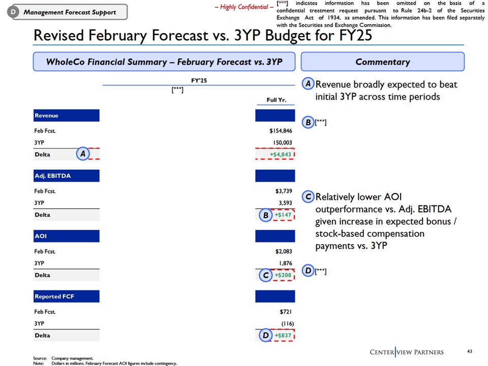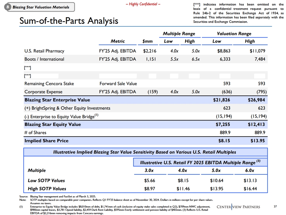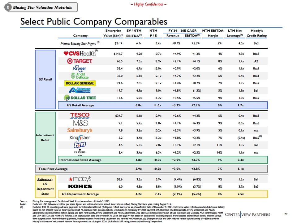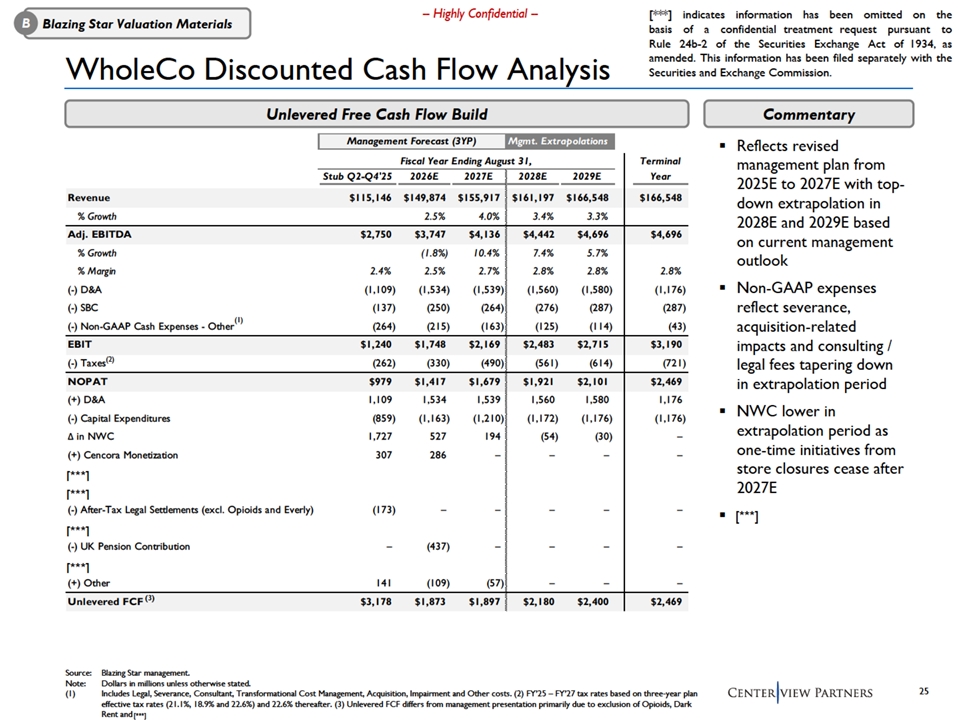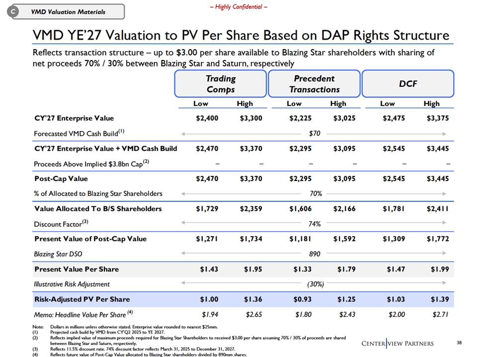 -- Highly Confidential -- Centerview Disclaimer This presentation has been prepared by Centerview Partners LLC (“Centerview”) for use solely by the Board of Directors of Blazing Star in connection with its evaluation of a proposed transaction involving Blazing Star and for no other purpose. The information contained herein is based upon information supplied by or on behalf of Blazing Star and Saturn (“Defined term for other relevant party”) and publicly available information, and portions of the information contained herein may be based upon statements, estimates and forecasts provided by Blazing Star and Saturn. Centerview has relied upon the accuracy and completeness of the foregoing information, and has not assumed any responsibility for any independent verification of such information or for any independent evaluation or appraisal of any of the assets or liabilities (contingent or otherwise) of Blazing Star or any other entity, or concerning the solvency or fair value of Blazing Star or any other entity. With respect to financial forecasts Centerview has assumed that such forecasts have been reasonably prepared on bases reflecting the best currently available estimates and judgments of the management of Blazing Star as to the future financial performance of Blazing Star, and at your direction Centerview has relied upon such forecasts, as provided by Blazing Star’s management, with respect to Blazing Star. Centerview assumes no responsibility for and expresses no view as to such forecasts or the assumptions on which they are based. The information set forth herein is based upon economic, monetary, market and other conditions as in effect on, and the information made available to us as of, the date hereof, unless indicated otherwise and Centerview assumes no obligation to update or otherwise revise these materials. The financial analysis in this presentation is complex and is not necessarily susceptible to a partial analysis or summary description. In performing this financial analysis, Centerview has considered the results of its analysis as a whole and did not necessarily attribute a particular weight to any particular portion of the analysis considered. Furthermore, selecting any portion of Centerview’s analysis, without considering the analysis as a whole, would create an incomplete view of the process underlying its financial analysis. Centerview may have deemed various assumptions more or less probable than other assumptions, so the reference ranges resulting from any particular portion of the analysis described above should not be taken to be Centerview’s view of the actual value of Blazing Star. These materials and the information contained herein are confidential, were not prepared with a view toward public disclosure, and may not be disclosed publicly or made available to third parties without the prior written consent of Centerview. These materials and any other advice, written or oral, rendered by Centerview are intended solely for the benefit and use of the Board of Directors of Blazing Star (in its capacity as such) in its consideration of the proposed transaction, and are not for the benefit of, and do not convey any rights or remedies for any holder of securities of Blazing Star or any other person. Centerview will not be responsible for and has not provided any tax, accounting, actuarial, legal or other specialist advice. These materials are not intended to provide the sole basis for evaluating the proposed transaction, and this presentation does not represent a fairness opinion, recommendation, valuation or opinion of any kind, and is necessarily incomplete and should be viewed solely in conjunction with the oral presentation provided by Centerview. 1