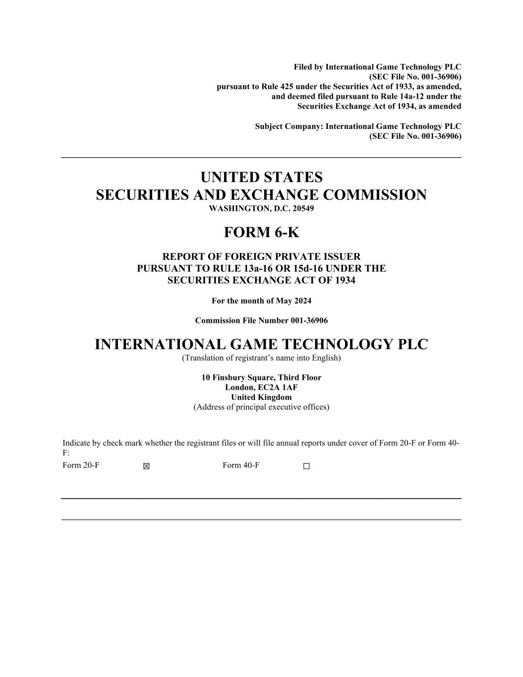 Filed by International Game Technology PLC (SEC File No. 001-36906) pursuant to Rule 425 under the Securities Act of 1933, as amended, and deemed filed pursuant to Rule 14a-12 under the Securities Exchange Act of 1934, as amended Subject Company: International Game Technology PLC (SEC File No. 001-36906) UNITED STATES SECURITIES AND EXCHANGE COMMISSION WASHINGTON, D.C. 20549 FORM 6-K REPORT OF FOREIGN PRIVATE ISSUER PURSUANT TO RULE 13a-16 OR 15d-16 UNDER THE SECURITIES EXCHANGE ACT OF 1934 For the month of May 2024 Commission File Number 001-36906 INTERNATIONAL GAME TECHNOLOGY PLC (Translation of registrant’s name into English) 10 Finsbury Square, Third Floor London, EC2A 1AF United Kingdom (Address of principal executive offices) Indicate by check mark whether the registrant files or will file annual reports under cover of Form 20-F or Form 40- F: Form 20-F ☒ Form 40-F ☐