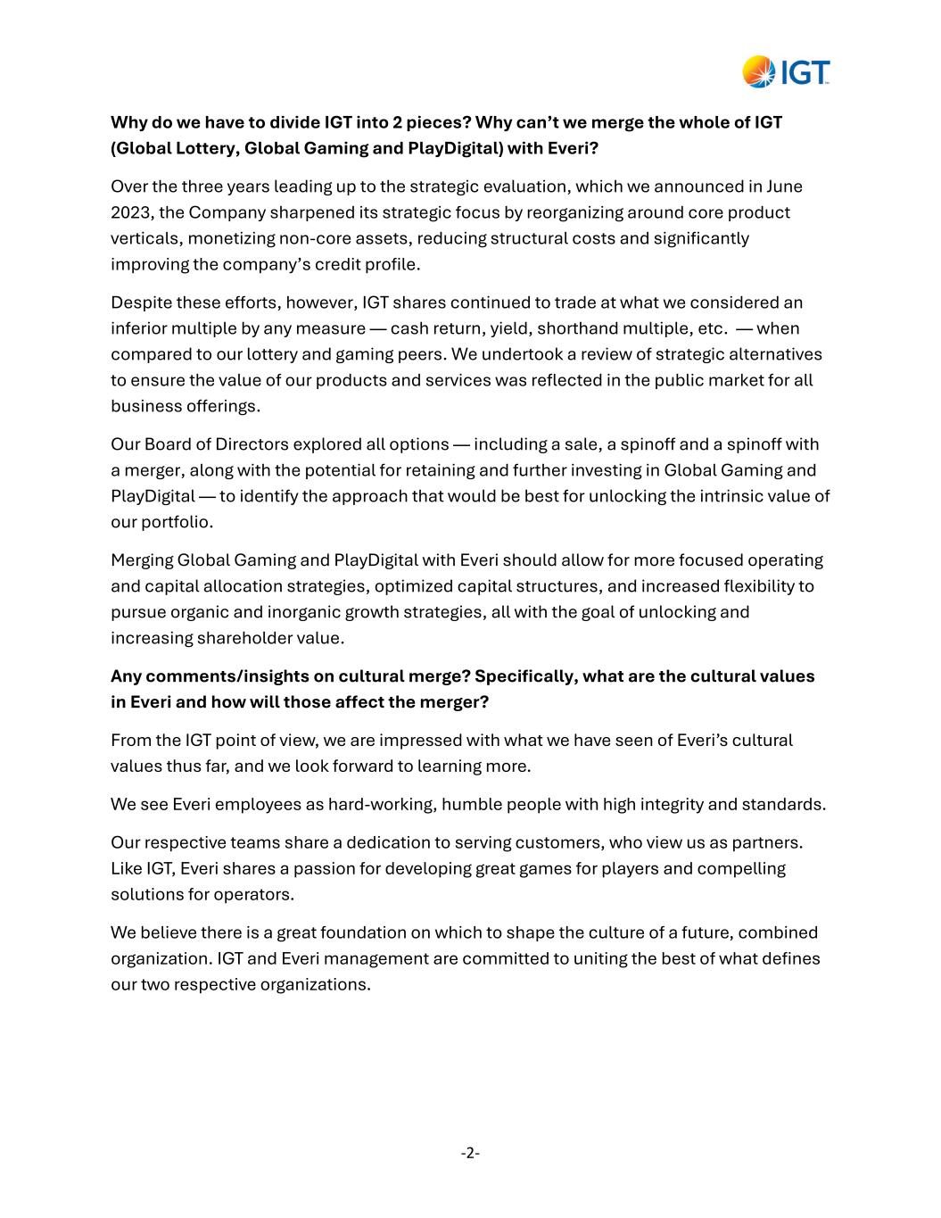 -2- Why do we have to divide IGT into 2 pieces? Why can’t we merge the whole of IGT (Global Lottery, Global Gaming and PlayDigital) with Everi? Over the three years leading up to the strategic evaluation, which we announced in June 2023, the Company sharpened its strategic focus by reorganizing around core product verticals, monetizing non-core assets, reducing structural costs and significantly improving the company’s credit profile. Despite these efforts, however, IGT shares continued to trade at what we considered an inferior multiple by any measure — cash return, yield, shorthand multiple, etc. — when compared to our lottery and gaming peers. We undertook a review of strategic alternatives to ensure the value of our products and services was reflected in the public market for all business offerings. Our Board of Directors explored all options — including a sale, a spinoff and a spinoff with a merger, along with the potential for retaining and further investing in Global Gaming and PlayDigital — to identify the approach that would be best for unlocking the intrinsic value of our portfolio. Merging Global Gaming and PlayDigital with Everi should allow for more focused operating and capital allocation strategies, optimized capital structures, and increased flexibility to pursue organic and inorganic growth strategies, all with the goal of unlocking and increasing shareholder value. Any comments/insights on cultural merge? Specifically, what are the cultural values in Everi and how will those affect the merger? From the IGT point of view, we are impressed with what we have seen of Everi’s cultural values thus far, and we look forward to learning more. We see Everi employees as hard-working, humble people with high integrity and standards. Our respective teams share a dedication to serving customers, who view us as partners. Like IGT, Everi shares a passion for developing great games for players and compelling solutions for operators. We believe there is a great foundation on which to shape the culture of a future, combined organization. IGT and Everi management are committed to uniting the best of what defines our two respective organizations.