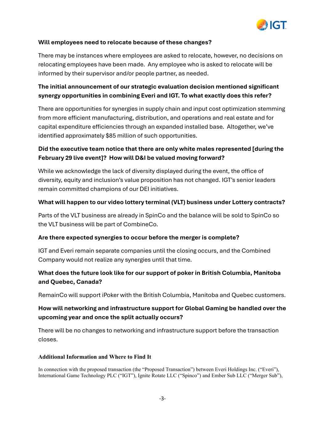 -3- Will employees need to relocate because of these changes? There may be instances where employees are asked to relocate, however, no decisions on relocating employees have been made. Any employee who is asked to relocate will be informed by their supervisor and/or people partner, as needed. The initial announcement of our strategic evaluation decision mentioned significant synergy opportunities in combining Everi and IGT. To what exactly does this refer? There are opportunities for synergies in supply chain and input cost optimization stemming from more efficient manufacturing, distribution, and operations and real estate and for capital expenditure efficiencies through an expanded installed base. Altogether, we’ve identified approximately $85 million of such opportunities. Did the executive team notice that there are only white males represented [during the February 29 live event]? How will D&I be valued moving forward? While we acknowledge the lack of diversity displayed during the event, the office of diversity, equity and inclusion’s value proposition has not changed. IGT’s senior leaders remain committed champions of our DEI initiatives. What will happen to our video lottery terminal (VLT) business under Lottery contracts? Parts of the VLT business are already in SpinCo and the balance will be sold to SpinCo so the VLT business will be part of CombineCo. Are there expected synergies to occur before the merger is complete? IGT and Everi remain separate companies until the closing occurs, and the Combined Company would not realize any synergies until that time. What does the future look like for our support of poker in British Columbia, Manitoba and Quebec, Canada? RemainCo will support iPoker with the British Columbia, Manitoba and Quebec customers. How will networking and infrastructure support for Global Gaming be handled over the upcoming year and once the split actually occurs? There will be no changes to networking and infrastructure support before the transaction closes. Additional Information and Where to Find It In connection with the proposed transaction (the “Proposed Transaction”) between Everi Holdings Inc. (“Everi”), International Game Technology PLC (“IGT”), Ignite Rotate LLC (“Spinco”) and Ember Sub LLC (“Merger Sub”),