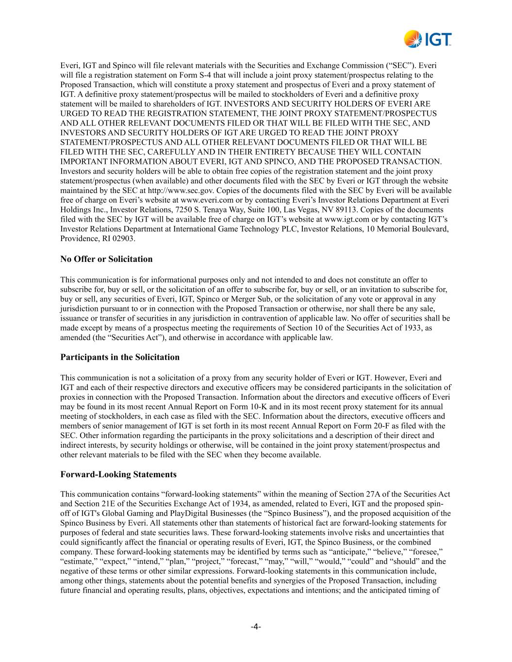 -4- Everi, IGT and Spinco will file relevant materials with the Securities and Exchange Commission (“SEC”). Everi will file a registration statement on Form S-4 that will include a joint proxy statement/prospectus relating to the Proposed Transaction, which will constitute a proxy statement and prospectus of Everi and a proxy statement of IGT. A definitive proxy statement/prospectus will be mailed to stockholders of Everi and a definitive proxy statement will be mailed to shareholders of IGT. INVESTORS AND SECURITY HOLDERS OF EVERI ARE URGED TO READ THE REGISTRATION STATEMENT, THE JOINT PROXY STATEMENT/PROSPECTUS AND ALL OTHER RELEVANT DOCUMENTS FILED OR THAT WILL BE FILED WITH THE SEC, AND INVESTORS AND SECURITY HOLDERS OF IGT ARE URGED TO READ THE JOINT PROXY STATEMENT/PROSPECTUS AND ALL OTHER RELEVANT DOCUMENTS FILED OR THAT WILL BE FILED WITH THE SEC, CAREFULLY AND IN THEIR ENTIRETY BECAUSE THEY WILL CONTAIN IMPORTANT INFORMATION ABOUT EVERI, IGT AND SPINCO, AND THE PROPOSED TRANSACTION. Investors and security holders will be able to obtain free copies of the registration statement and the joint proxy statement/prospectus (when available) and other documents filed with the SEC by Everi or IGT through the website maintained by the SEC at http://www.sec.gov. Copies of the documents filed with the SEC by Everi will be available free of charge on Everi’s website at www.everi.com or by contacting Everi’s Investor Relations Department at Everi Holdings Inc., Investor Relations, 7250 S. Tenaya Way, Suite 100, Las Vegas, NV 89113. Copies of the documents filed with the SEC by IGT will be available free of charge on IGT’s website at www.igt.com or by contacting IGT’s Investor Relations Department at International Game Technology PLC, Investor Relations, 10 Memorial Boulevard, Providence, RI 02903. No Offer or Solicitation This communication is for informational purposes only and not intended to and does not constitute an offer to subscribe for, buy or sell, or the solicitation of an offer to subscribe for, buy or sell, or an invitation to subscribe for, buy or sell, any securities of Everi, IGT, Spinco or Merger Sub, or the solicitation of any vote or approval in any jurisdiction pursuant to or in connection with the Proposed Transaction or otherwise, nor shall there be any sale, issuance or transfer of securities in any jurisdiction in contravention of applicable law. No offer of securities shall be made except by means of a prospectus meeting the requirements of Section 10 of the Securities Act of 1933, as amended (the “Securities Act”), and otherwise in accordance with applicable law. Participants in the Solicitation This communication is not a solicitation of a proxy from any security holder of Everi or IGT. However, Everi and IGT and each of their respective directors and executive officers may be considered participants in the solicitation of proxies in connection with the Proposed Transaction. Information about the directors and executive officers of Everi may be found in its most recent Annual Report on Form 10-K and in its most recent proxy statement for its annual meeting of stockholders, in each case as filed with the SEC. Information about the directors, executive officers and members of senior management of IGT is set forth in its most recent Annual Report on Form 20-F as filed with the SEC. Other information regarding the participants in the proxy solicitations and a description of their direct and indirect interests, by security holdings or otherwise, will be contained in the joint proxy statement/prospectus and other relevant materials to be filed with the SEC when they become available. Forward-Looking Statements This communication contains “forward-looking statements” within the meaning of Section 27A of the Securities Act and Section 21E of the Securities Exchange Act of 1934, as amended, related to Everi, IGT and the proposed spin- off of IGT's Global Gaming and PlayDigital Businesses (the “Spinco Business”), and the proposed acquisition of the Spinco Business by Everi. All statements other than statements of historical fact are forward-looking statements for purposes of federal and state securities laws. These forward-looking statements involve risks and uncertainties that could significantly affect the financial or operating results of Everi, IGT, the Spinco Business, or the combined company. These forward-looking statements may be identified by terms such as “anticipate,” “believe,” “foresee,” “estimate,” “expect,” “intend,” “plan,” “project,” “forecast,” “may,” “will,” “would,” “could” and “should” and the negative of these terms or other similar expressions. Forward-looking statements in this communication include, among other things, statements about the potential benefits and synergies of the Proposed Transaction, including future financial and operating results, plans, objectives, expectations and intentions; and the anticipated timing of