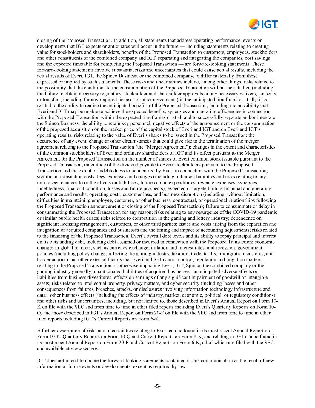 -5- closing of the Proposed Transaction. In addition, all statements that address operating performance, events or developments that IGT expects or anticipates will occur in the future — including statements relating to creating value for stockholders and shareholders, benefits of the Proposed Transaction to customers, employees, stockholders and other constituents of the combined company and IGT, separating and integrating the companies, cost savings and the expected timetable for completing the Proposed Transaction — are forward-looking statements. These forward-looking statements involve substantial risks and uncertainties that could cause actual results, including the actual results of Everi, IGT, the Spinco Business, or the combined company, to differ materially from those expressed or implied by such statements. These risks and uncertainties include, among other things, risks related to the possibility that the conditions to the consummation of the Proposed Transaction will not be satisfied (including the failure to obtain necessary regulatory, stockholder and shareholder approvals or any necessary waivers, consents, or transfers, including for any required licenses or other agreements) in the anticipated timeframe or at all; risks related to the ability to realize the anticipated benefits of the Proposed Transaction, including the possibility that Everi and IGT may be unable to achieve the expected benefits, synergies and operating efficiencies in connection with the Proposed Transaction within the expected timeframes or at all and to successfully separate and/or integrate the Spinco Business; the ability to retain key personnel; negative effects of the announcement or the consummation of the proposed acquisition on the market price of the capital stock of Everi and IGT and on Everi and IGT’s operating results; risks relating to the value of Everi’s shares to be issued in the Proposed Transaction; the occurrence of any event, change or other circumstances that could give rise to the termination of the merger agreement relating to the Proposed Transaction (the “Merger Agreement”); changes in the extent and characteristics of the common stockholders of Everi and ordinary shareholders of IGT and its effect pursuant to the Merger Agreement for the Proposed Transaction on the number of shares of Everi common stock issuable pursuant to the Proposed Transaction, magnitude of the dividend payable to Everi stockholders pursuant to the Proposed Transaction and the extent of indebtedness to be incurred by Everi in connection with the Proposed Transaction; significant transaction costs, fees, expenses and charges (including unknown liabilities and risks relating to any unforeseen changes to or the effects on liabilities, future capital expenditures, revenue, expenses, synergies, indebtedness, financial condition, losses and future prospects); expected or targeted future financial and operating performance and results; operating costs, customer loss, and business disruption (including, without limitation, difficulties in maintaining employee, customer, or other business, contractual, or operational relationships following the Proposed Transaction announcement or closing of the Proposed Transaction); failure to consummate or delay in consummating the Proposed Transaction for any reason; risks relating to any resurgence of the COVID-19 pandemic or similar public health crises; risks related to competition in the gaming and lottery industry; dependence on significant licensing arrangements, customers, or other third parties; issues and costs arising from the separation and integration of acquired companies and businesses and the timing and impact of accounting adjustments; risks related to the financing of the Proposed Transaction, Everi’s overall debt levels and its ability to repay principal and interest on its outstanding debt, including debt assumed or incurred in connection with the Proposed Transaction; economic changes in global markets, such as currency exchange, inflation and interest rates, and recession; government policies (including policy changes affecting the gaming industry, taxation, trade, tariffs, immigration, customs, and border actions) and other external factors that Everi and IGT cannot control; regulation and litigation matters relating to the Proposed Transaction or otherwise impacting Everi, IGT, Spinco, the combined company or the gaming industry generally; unanticipated liabilities of acquired businesses; unanticipated adverse effects or liabilities from business divestitures; effects on earnings of any significant impairment of goodwill or intangible assets; risks related to intellectual property, privacy matters, and cyber security (including losses and other consequences from failures, breaches, attacks, or disclosures involving information technology infrastructure and data); other business effects (including the effects of industry, market, economic, political, or regulatory conditions); and other risks and uncertainties, including, but not limited to, those described in Everi’s Annual Report on Form 10- K on file with the SEC and from time to time in other filed reports including Everi’s Quarterly Reports on Form 10- Q, and those described in IGT’s Annual Report on Form 20-F on file with the SEC and from time to time in other filed reports including IGT’s Current Reports on Form 6-K. A further description of risks and uncertainties relating to Everi can be found in its most recent Annual Report on Form 10-K, Quarterly Reports on Form 10-Q and Current Reports on Form 8-K, and relating to IGT can be found in its most recent Annual Report on Form 20-F and Current Reports on Form 6-K, all of which are filed with the SEC and available at www.sec.gov. IGT does not intend to update the forward-looking statements contained in this communication as the result of new information or future events or developments, except as required by law.