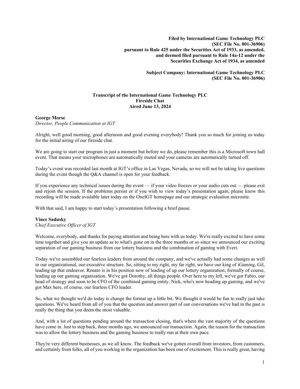 1 Filed by International Game Technology PLC (SEC File No. 001-36906) pursuant to Rule 425 under the Securities Act of 1933, as amended, and deemed filed pursuant to Rule 14a-12 under the Securities Exchange Act of 1934, as amended Subject Company: International Game Technology PLC (SEC File No. 001-36906) Transcript of the International Game Technology PLC Fireside Chat Aired June 13, 2024 George Morse Director, People Communication at IGT Alright, well good morning, good afternoon and good evening everybody! Thank you so much for joining us today for the initial airing of our fireside chat. We are going to start our program in just a moment but before we do, please remember this is a Microsoft town hall event. That means your microphones are automatically muted and your cameras are automatically turned off. Today’s event was recorded last month at IGT’s office in Las Vegas, Nevada, so we will not be taking live questions during the event though the Q&A channel is open for your feedback. If you experience any technical issues during the event — if your video freezes or your audio cuts out — please exit and rejoin the session. If the problems persist or if you wish to view today’s presentation again, please know this recording will be made available later today on the OneIGT homepage and our strategic evaluation microsite. With that said, I am happy to start today’s presentation following a brief pause. Vince Sadusky Chief Executive Officer of IGT Welcome, everybody, and thanks for paying attention and being here with us today. We're really excited to have some time together and give you an update as to what's gone on in the three months or so since we announced our exciting separation of our gaming business from our lottery business and the combination of gaming with Everi. Today we've assembled our fearless leaders from around the company, and we've actually had some changes as well in our organizational, our executive structure. So, sitting to my right, my far right, we have our king of iGaming, Gil, leading up that endeavor. Renato is in his position now of leading of up our lottery organization, formally of course, leading up our gaming organization. We've got Dorothy, all things people. Over here to my left, we've got Fabio, our head of strategy and soon to be CFO of the combined gaming entity. Nick, who's now heading up gaming, and we've got Max here, of course, our fearless CFO leader. So, what we thought we'd do today is change the format up a little bit. We thought it would be fun to really just take questions. We've heard from all of you that the question and answer part of our conversations we've had in the past is really the thing that you deem the most valuable. And, with a lot of questions pending around the transaction closing, that's where the vast majority of the questions have come in. Just to step back, three months ago, we announced our transaction. Again, the reason for the transaction was to allow the lottery business and the gaming business to really run at their own pace. They're very different businesses, as we all know. The feedback we've gotten overall from investors, from customers, and certainly from folks, all of you working in the organization has been one of excitement. This is really great, having
