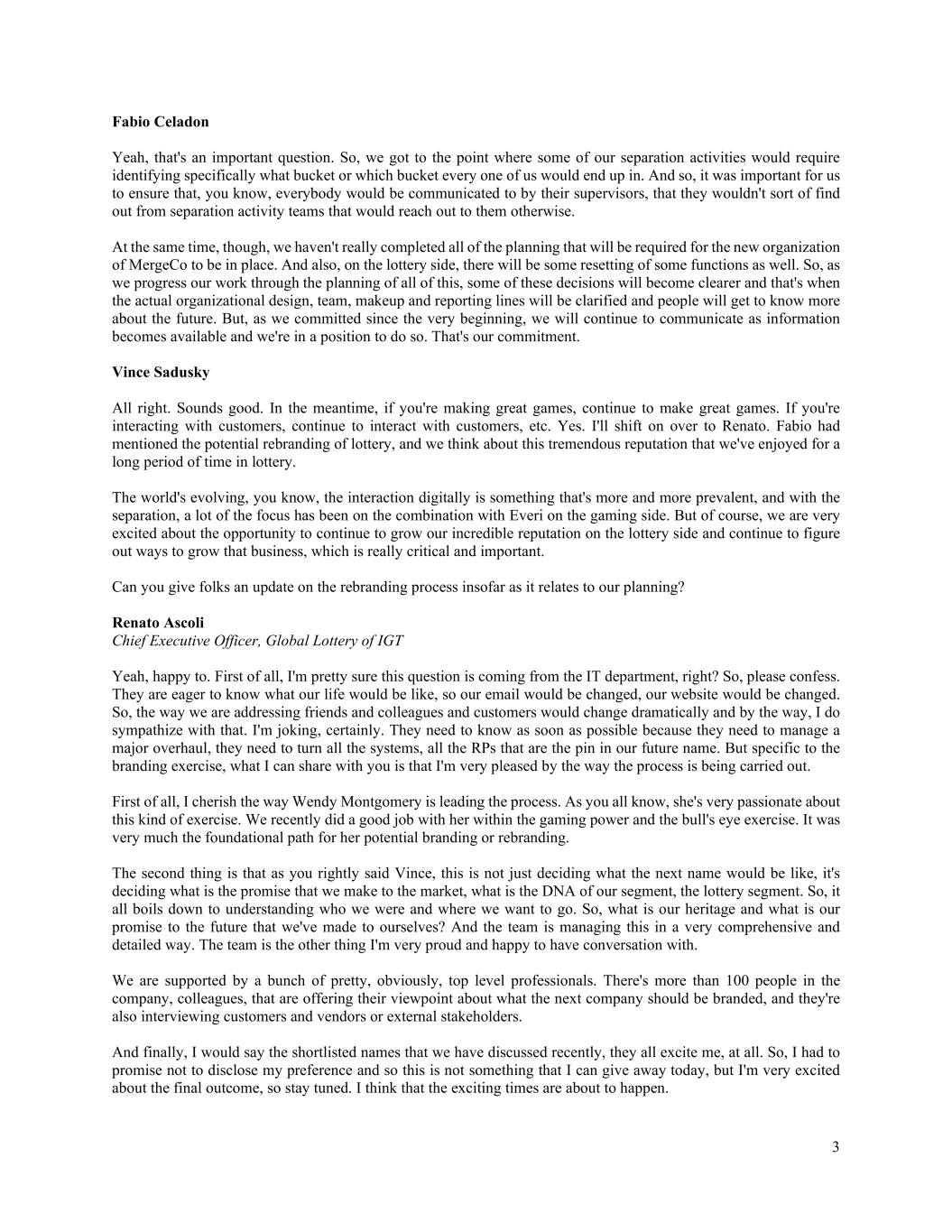 3 Fabio Celadon Yeah, that's an important question. So, we got to the point where some of our separation activities would require identifying specifically what bucket or which bucket every one of us would end up in. And so, it was important for us to ensure that, you know, everybody would be communicated to by their supervisors, that they wouldn't sort of find out from separation activity teams that would reach out to them otherwise. At the same time, though, we haven't really completed all of the planning that will be required for the new organization of MergeCo to be in place. And also, on the lottery side, there will be some resetting of some functions as well. So, as we progress our work through the planning of all of this, some of these decisions will become clearer and that's when the actual organizational design, team, makeup and reporting lines will be clarified and people will get to know more about the future. But, as we committed since the very beginning, we will continue to communicate as information becomes available and we're in a position to do so. That's our commitment. Vince Sadusky All right. Sounds good. In the meantime, if you're making great games, continue to make great games. If you're interacting with customers, continue to interact with customers, etc. Yes. I'll shift on over to Renato. Fabio had mentioned the potential rebranding of lottery, and we think about this tremendous reputation that we've enjoyed for a long period of time in lottery. The world's evolving, you know, the interaction digitally is something that's more and more prevalent, and with the separation, a lot of the focus has been on the combination with Everi on the gaming side. But of course, we are very excited about the opportunity to continue to grow our incredible reputation on the lottery side and continue to figure out ways to grow that business, which is really critical and important. Can you give folks an update on the rebranding process insofar as it relates to our planning? Renato Ascoli Chief Executive Officer, Global Lottery of IGT Yeah, happy to. First of all, I'm pretty sure this question is coming from the IT department, right? So, please confess. They are eager to know what our life would be like, so our email would be changed, our website would be changed. So, the way we are addressing friends and colleagues and customers would change dramatically and by the way, I do sympathize with that. I'm joking, certainly. They need to know as soon as possible because they need to manage a major overhaul, they need to turn all the systems, all the RPs that are the pin in our future name. But specific to the branding exercise, what I can share with you is that I'm very pleased by the way the process is being carried out. First of all, I cherish the way Wendy Montgomery is leading the process. As you all know, she's very passionate about this kind of exercise. We recently did a good job with her within the gaming power and the bull's eye exercise. It was very much the foundational path for her potential branding or rebranding. The second thing is that as you rightly said Vince, this is not just deciding what the next name would be like, it's deciding what is the promise that we make to the market, what is the DNA of our segment, the lottery segment. So, it all boils down to understanding who we were and where we want to go. So, what is our heritage and what is our promise to the future that we've made to ourselves? And the team is managing this in a very comprehensive and detailed way. The team is the other thing I'm very proud and happy to have conversation with. We are supported by a bunch of pretty, obviously, top level professionals. There's more than 100 people in the company, colleagues, that are offering their viewpoint about what the next company should be branded, and they're also interviewing customers and vendors or external stakeholders. And finally, I would say the shortlisted names that we have discussed recently, they all excite me, at all. So, I had to promise not to disclose my preference and so this is not something that I can give away today, but I'm very excited about the final outcome, so stay tuned. I think that the exciting times are about to happen.