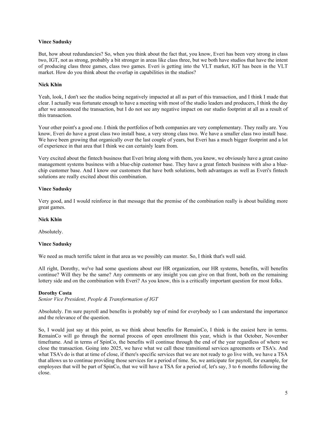 5 Vince Sadusky But, how about redundancies? So, when you think about the fact that, you know, Everi has been very strong in class two, IGT, not as strong, probably a bit stronger in areas like class three, but we both have studios that have the intent of producing class three games, class two games. Everi is getting into the VLT market, IGT has been in the VLT market. How do you think about the overlap in capabilities in the studios? Nick Khin Yeah, look, I don't see the studios being negatively impacted at all as part of this transaction, and I think I made that clear. I actually was fortunate enough to have a meeting with most of the studio leaders and producers, I think the day after we announced the transaction, but I do not see any negative impact on our studio footprint at all as a result of this transaction. Your other point's a good one. I think the portfolios of both companies are very complementary. They really are. You know, Everi do have a great class two install base, a very strong class two. We have a smaller class two install base. We have been growing that organically over the last couple of years, but Everi has a much bigger footprint and a lot of experience in that area that I think we can certainly learn from. Very excited about the fintech business that Everi bring along with them, you know, we obviously have a great casino management systems business with a blue-chip customer base. They have a great fintech business with also a blue- chip customer base. And I know our customers that have both solutions, both advantages as well as Everi's fintech solutions are really excited about this combination. Vince Sadusky Very good, and I would reinforce in that message that the premise of the combination really is about building more great games. Nick Khin Absolutely. Vince Sadusky We need as much terrific talent in that area as we possibly can muster. So, I think that's well said. All right, Dorothy, we've had some questions about our HR organization, our HR systems, benefits, will benefits continue? Will they be the same? Any comments or any insight you can give on that front, both on the remaining lottery side and on the combination with Everi? As you know, this is a critically important question for most folks. Dorothy Costa Senior Vice President, People & Transformation of IGT Absolutely. I'm sure payroll and benefits is probably top of mind for everybody so I can understand the importance and the relevance of the question. So, I would just say at this point, as we think about benefits for RemainCo, I think is the easiest here in terms. RemainCo will go through the normal process of open enrollment this year, which is that October, November timeframe. And in terms of SpinCo, the benefits will continue through the end of the year regardless of where we close the transaction. Going into 2025, we have what we call these transitional services agreements or TSA's. And what TSA's do is that at time of close, if there's specific services that we are not ready to go live with, we have a TSA that allows us to continue providing those services for a period of time. So, we anticipate for payroll, for example, for employees that will be part of SpinCo, that we will have a TSA for a period of, let's say, 3 to 6 months following the close.