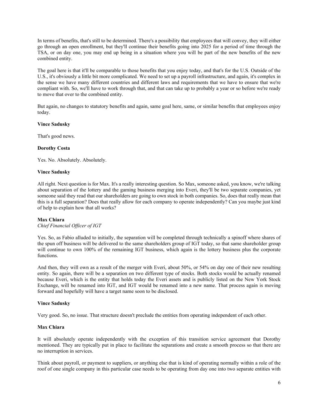 6 In terms of benefits, that's still to be determined. There's a possibility that employees that will convey, they will either go through an open enrollment, but they'll continue their benefits going into 2025 for a period of time through the TSA, or on day one, you may end up being in a situation where you will be part of the new benefits of the new combined entity. The goal here is that it'll be comparable to those benefits that you enjoy today, and that's for the U.S. Outside of the U.S., it's obviously a little bit more complicated. We need to set up a payroll infrastructure, and again, it's complex in the sense we have many different countries and different laws and requirements that we have to ensure that we're compliant with. So, we'll have to work through that, and that can take up to probably a year or so before we're ready to move that over to the combined entity. But again, no changes to statutory benefits and again, same goal here, same, or similar benefits that employees enjoy today. Vince Sadusky That's good news. Dorothy Costa Yes. No. Absolutely. Absolutely. Vince Sadusky All right. Next question is for Max. It's a really interesting question. So Max, someone asked, you know, we're talking about separation of the lottery and the gaming business merging into Everi, they'll be two separate companies, yet someone said they read that our shareholders are going to own stock in both companies. So, does that really mean that this is a full separation? Does that really allow for each company to operate independently? Can you maybe just kind of help to explain how that all works? Max Chiara Chief Financial Officer of IGT Yes. So, as Fabio alluded to initially, the separation will be completed through technically a spinoff where shares of the spun off business will be delivered to the same shareholders group of IGT today, so that same shareholder group will continue to own 100% of the remaining IGT business, which again is the lottery business plus the corporate functions. And then, they will own as a result of the merger with Everi, about 50%, or 54% on day one of their new resulting entity. So again, there will be a separation on two different type of stocks. Both stocks would be actually renamed because Everi, which is the entity that holds today the Everi assets and is publicly listed on the New York Stock Exchange, will be renamed into IGT, and IGT would be renamed into a new name. That process again is moving forward and hopefully will have a target name soon to be disclosed. Vince Sadusky Very good. So, no issue. That structure doesn't preclude the entities from operating independent of each other. Max Chiara It will absolutely operate independently with the exception of this transition service agreement that Dorothy mentioned. They are typically put in place to facilitate the separations and create a smooth process so that there are no interruption in services. Think about payroll, or payment to suppliers, or anything else that is kind of operating normally within a role of the roof of one single company in this particular case needs to be operating from day one into two separate entities with