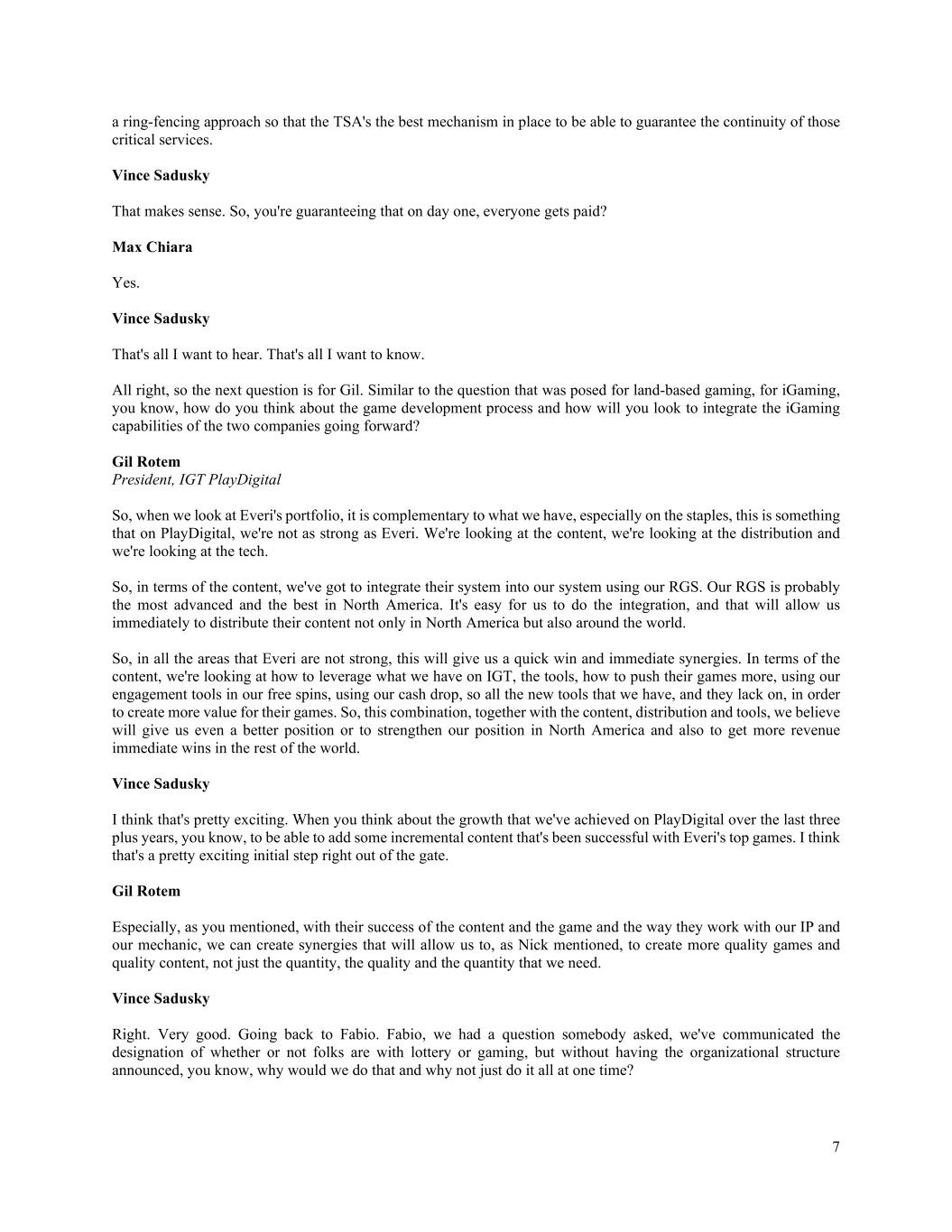 7 a ring-fencing approach so that the TSA's the best mechanism in place to be able to guarantee the continuity of those critical services. Vince Sadusky That makes sense. So, you're guaranteeing that on day one, everyone gets paid? Max Chiara Yes. Vince Sadusky That's all I want to hear. That's all I want to know. All right, so the next question is for Gil. Similar to the question that was posed for land-based gaming, for iGaming, you know, how do you think about the game development process and how will you look to integrate the iGaming capabilities of the two companies going forward? Gil Rotem President, IGT PlayDigital So, when we look at Everi's portfolio, it is complementary to what we have, especially on the staples, this is something that on PlayDigital, we're not as strong as Everi. We're looking at the content, we're looking at the distribution and we're looking at the tech. So, in terms of the content, we've got to integrate their system into our system using our RGS. Our RGS is probably the most advanced and the best in North America. It's easy for us to do the integration, and that will allow us immediately to distribute their content not only in North America but also around the world. So, in all the areas that Everi are not strong, this will give us a quick win and immediate synergies. In terms of the content, we're looking at how to leverage what we have on IGT, the tools, how to push their games more, using our engagement tools in our free spins, using our cash drop, so all the new tools that we have, and they lack on, in order to create more value for their games. So, this combination, together with the content, distribution and tools, we believe will give us even a better position or to strengthen our position in North America and also to get more revenue immediate wins in the rest of the world. Vince Sadusky I think that's pretty exciting. When you think about the growth that we've achieved on PlayDigital over the last three plus years, you know, to be able to add some incremental content that's been successful with Everi's top games. I think that's a pretty exciting initial step right out of the gate. Gil Rotem Especially, as you mentioned, with their success of the content and the game and the way they work with our IP and our mechanic, we can create synergies that will allow us to, as Nick mentioned, to create more quality games and quality content, not just the quantity, the quality and the quantity that we need. Vince Sadusky Right. Very good. Going back to Fabio. Fabio, we had a question somebody asked, we've communicated the designation of whether or not folks are with lottery or gaming, but without having the organizational structure announced, you know, why would we do that and why not just do it all at one time?