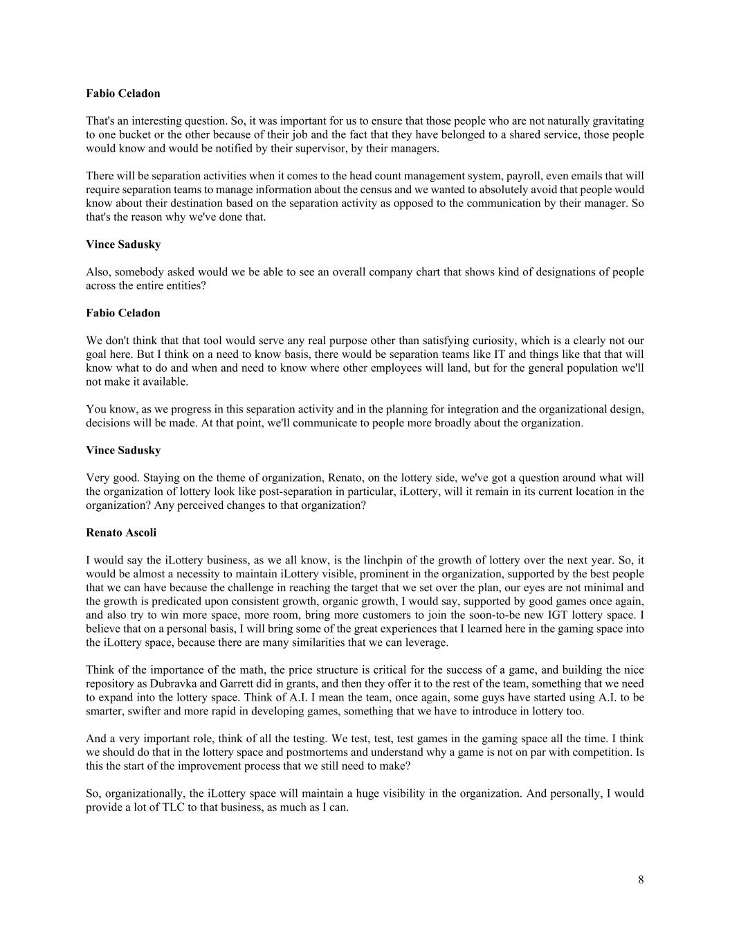8 Fabio Celadon That's an interesting question. So, it was important for us to ensure that those people who are not naturally gravitating to one bucket or the other because of their job and the fact that they have belonged to a shared service, those people would know and would be notified by their supervisor, by their managers. There will be separation activities when it comes to the head count management system, payroll, even emails that will require separation teams to manage information about the census and we wanted to absolutely avoid that people would know about their destination based on the separation activity as opposed to the communication by their manager. So that's the reason why we've done that. Vince Sadusky Also, somebody asked would we be able to see an overall company chart that shows kind of designations of people across the entire entities? Fabio Celadon We don't think that that tool would serve any real purpose other than satisfying curiosity, which is a clearly not our goal here. But I think on a need to know basis, there would be separation teams like IT and things like that that will know what to do and when and need to know where other employees will land, but for the general population we'll not make it available. You know, as we progress in this separation activity and in the planning for integration and the organizational design, decisions will be made. At that point, we'll communicate to people more broadly about the organization. Vince Sadusky Very good. Staying on the theme of organization, Renato, on the lottery side, we've got a question around what will the organization of lottery look like post-separation in particular, iLottery, will it remain in its current location in the organization? Any perceived changes to that organization? Renato Ascoli I would say the iLottery business, as we all know, is the linchpin of the growth of lottery over the next year. So, it would be almost a necessity to maintain iLottery visible, prominent in the organization, supported by the best people that we can have because the challenge in reaching the target that we set over the plan, our eyes are not minimal and the growth is predicated upon consistent growth, organic growth, I would say, supported by good games once again, and also try to win more space, more room, bring more customers to join the soon-to-be new IGT lottery space. I believe that on a personal basis, I will bring some of the great experiences that I learned here in the gaming space into the iLottery space, because there are many similarities that we can leverage. Think of the importance of the math, the price structure is critical for the success of a game, and building the nice repository as Dubravka and Garrett did in grants, and then they offer it to the rest of the team, something that we need to expand into the lottery space. Think of A.I. I mean the team, once again, some guys have started using A.I. to be smarter, swifter and more rapid in developing games, something that we have to introduce in lottery too. And a very important role, think of all the testing. We test, test, test games in the gaming space all the time. I think we should do that in the lottery space and postmortems and understand why a game is not on par with competition. Is this the start of the improvement process that we still need to make? So, organizationally, the iLottery space will maintain a huge visibility in the organization. And personally, I would provide a lot of TLC to that business, as much as I can.