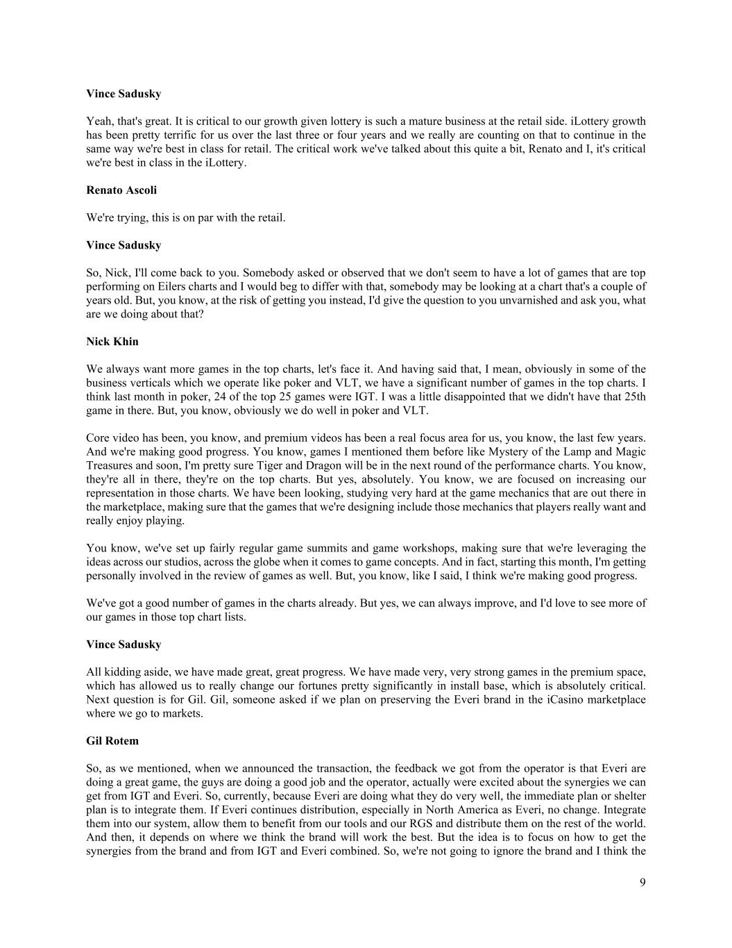 9 Vince Sadusky Yeah, that's great. It is critical to our growth given lottery is such a mature business at the retail side. iLottery growth has been pretty terrific for us over the last three or four years and we really are counting on that to continue in the same way we're best in class for retail. The critical work we've talked about this quite a bit, Renato and I, it's critical we're best in class in the iLottery. Renato Ascoli We're trying, this is on par with the retail. Vince Sadusky So, Nick, I'll come back to you. Somebody asked or observed that we don't seem to have a lot of games that are top performing on Eilers charts and I would beg to differ with that, somebody may be looking at a chart that's a couple of years old. But, you know, at the risk of getting you instead, I'd give the question to you unvarnished and ask you, what are we doing about that? Nick Khin We always want more games in the top charts, let's face it. And having said that, I mean, obviously in some of the business verticals which we operate like poker and VLT, we have a significant number of games in the top charts. I think last month in poker, 24 of the top 25 games were IGT. I was a little disappointed that we didn't have that 25th game in there. But, you know, obviously we do well in poker and VLT. Core video has been, you know, and premium videos has been a real focus area for us, you know, the last few years. And we're making good progress. You know, games I mentioned them before like Mystery of the Lamp and Magic Treasures and soon, I'm pretty sure Tiger and Dragon will be in the next round of the performance charts. You know, they're all in there, they're on the top charts. But yes, absolutely. You know, we are focused on increasing our representation in those charts. We have been looking, studying very hard at the game mechanics that are out there in the marketplace, making sure that the games that we're designing include those mechanics that players really want and really enjoy playing. You know, we've set up fairly regular game summits and game workshops, making sure that we're leveraging the ideas across our studios, across the globe when it comes to game concepts. And in fact, starting this month, I'm getting personally involved in the review of games as well. But, you know, like I said, I think we're making good progress. We've got a good number of games in the charts already. But yes, we can always improve, and I'd love to see more of our games in those top chart lists. Vince Sadusky All kidding aside, we have made great, great progress. We have made very, very strong games in the premium space, which has allowed us to really change our fortunes pretty significantly in install base, which is absolutely critical. Next question is for Gil. Gil, someone asked if we plan on preserving the Everi brand in the iCasino marketplace where we go to markets. Gil Rotem So, as we mentioned, when we announced the transaction, the feedback we got from the operator is that Everi are doing a great game, the guys are doing a good job and the operator, actually were excited about the synergies we can get from IGT and Everi. So, currently, because Everi are doing what they do very well, the immediate plan or shelter plan is to integrate them. If Everi continues distribution, especially in North America as Everi, no change. Integrate them into our system, allow them to benefit from our tools and our RGS and distribute them on the rest of the world. And then, it depends on where we think the brand will work the best. But the idea is to focus on how to get the synergies from the brand and from IGT and Everi combined. So, we're not going to ignore the brand and I think the