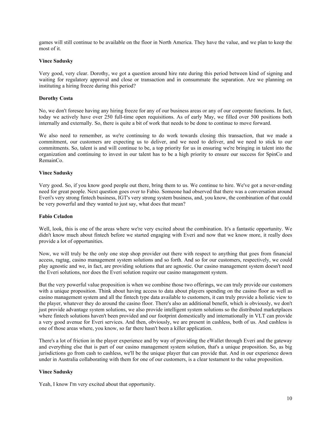 10 games will still continue to be available on the floor in North America. They have the value, and we plan to keep the most of it. Vince Sadusky Very good, very clear. Dorothy, we got a question around hire rate during this period between kind of signing and waiting for regulatory approval and close or transaction and in consummate the separation. Are we planning on instituting a hiring freeze during this period? Dorothy Costa No, we don't foresee having any hiring freeze for any of our business areas or any of our corporate functions. In fact, today we actively have over 250 full-time open requisitions. As of early May, we filled over 500 positions both internally and externally. So, there is quite a bit of work that needs to be done to continue to move forward. We also need to remember, as we're continuing to do work towards closing this transaction, that we made a commitment, our customers are expecting us to deliver, and we need to deliver, and we need to stick to our commitments. So, talent is and will continue to be, a top priority for us in ensuring we're bringing in talent into the organization and continuing to invest in our talent has to be a high priority to ensure our success for SpinCo and RemainCo. Vince Sadusky Very good. So, if you know good people out there, bring them to us. We continue to hire. We've got a never-ending need for great people. Next question goes over to Fabio. Someone had observed that there was a conversation around Everi's very strong fintech business, IGT's very strong system business, and, you know, the combination of that could be very powerful and they wanted to just say, what does that mean? Fabio Celadon Well, look, this is one of the areas where we're very excited about the combination. It's a fantastic opportunity. We didn't know much about fintech before we started engaging with Everi and now that we know more, it really does provide a lot of opportunities. Now, we will truly be the only one stop shop provider out there with respect to anything that goes from financial access, ragtag, casino management system solutions and so forth. And so for our customers, respectively, we could play agnostic and we, in fact, are providing solutions that are agnostic. Our casino management system doesn't need the Everi solutions, nor does the Everi solution require our casino management system. But the very powerful value proposition is when we combine those two offerings, we can truly provide our customers with a unique proposition. Think about having access to data about players spending on the casino floor as well as casino management system and all the fintech type data available to customers, it can truly provide a holistic view to the player, whatever they do around the casino floor. There's also an additional benefit, which is obviously, we don't just provide advantage system solutions, we also provide intelligent system solutions so the distributed marketplaces where fintech solutions haven't been provided and our footprint domestically and internationally in VLT can provide a very good avenue for Everi services. And then, obviously, we are present in cashless, both of us. And cashless is one of those areas where, you know, so far there hasn't been a killer application. There's a lot of friction in the player experience and by way of providing the eWallet through Everi and the gateway and everything else that is part of our casino management system solution, that's a unique proposition. So, as big jurisdictions go from cash to cashless, we'll be the unique player that can provide that. And in our experience down under in Australia collaborating with them for one of our customers, is a clear testament to the value proposition. Vince Sadusky Yeah, I know I'm very excited about that opportunity.