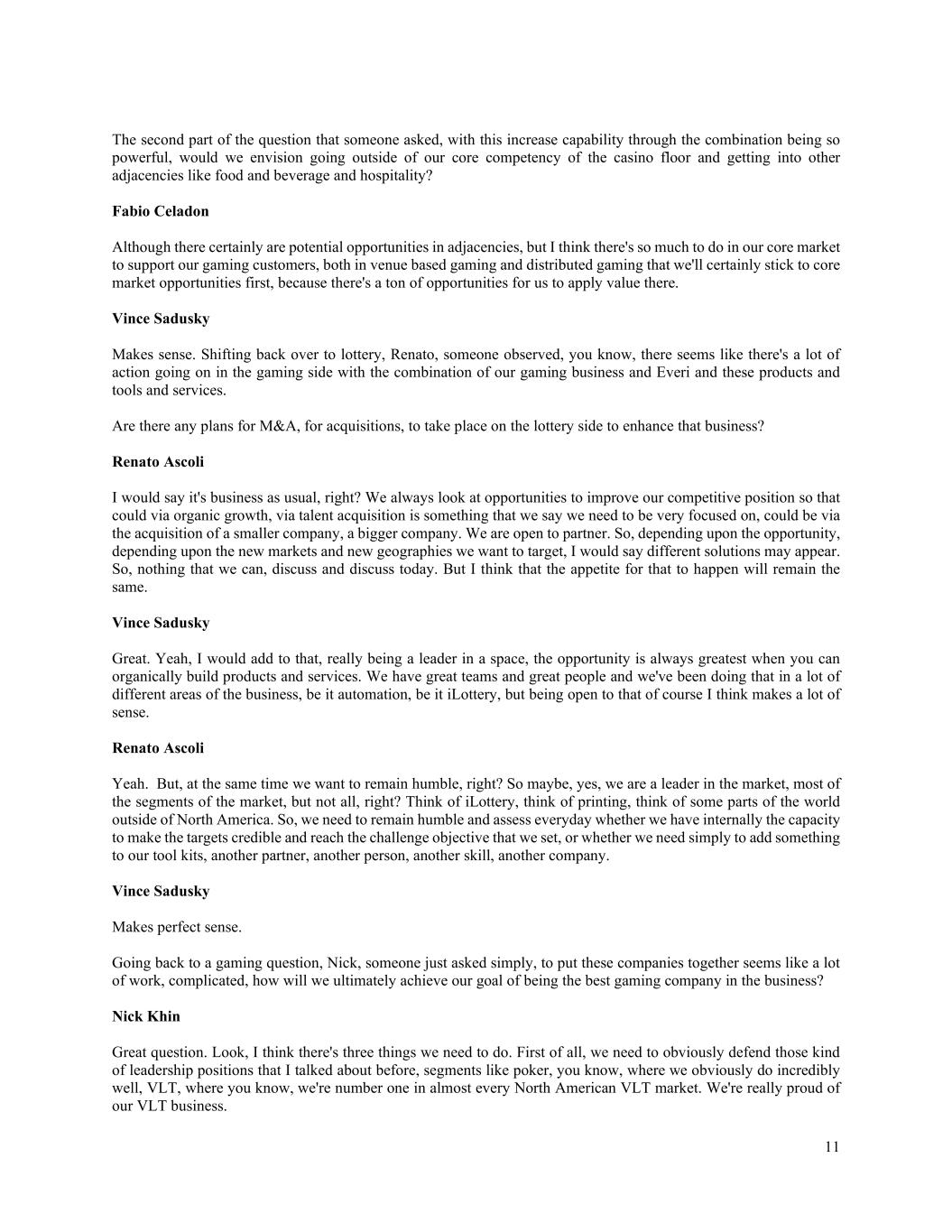 11 The second part of the question that someone asked, with this increase capability through the combination being so powerful, would we envision going outside of our core competency of the casino floor and getting into other adjacencies like food and beverage and hospitality? Fabio Celadon Although there certainly are potential opportunities in adjacencies, but I think there's so much to do in our core market to support our gaming customers, both in venue based gaming and distributed gaming that we'll certainly stick to core market opportunities first, because there's a ton of opportunities for us to apply value there. Vince Sadusky Makes sense. Shifting back over to lottery, Renato, someone observed, you know, there seems like there's a lot of action going on in the gaming side with the combination of our gaming business and Everi and these products and tools and services. Are there any plans for M&A, for acquisitions, to take place on the lottery side to enhance that business? Renato Ascoli I would say it's business as usual, right? We always look at opportunities to improve our competitive position so that could via organic growth, via talent acquisition is something that we say we need to be very focused on, could be via the acquisition of a smaller company, a bigger company. We are open to partner. So, depending upon the opportunity, depending upon the new markets and new geographies we want to target, I would say different solutions may appear. So, nothing that we can, discuss and discuss today. But I think that the appetite for that to happen will remain the same. Vince Sadusky Great. Yeah, I would add to that, really being a leader in a space, the opportunity is always greatest when you can organically build products and services. We have great teams and great people and we've been doing that in a lot of different areas of the business, be it automation, be it iLottery, but being open to that of course I think makes a lot of sense. Renato Ascoli Yeah. But, at the same time we want to remain humble, right? So maybe, yes, we are a leader in the market, most of the segments of the market, but not all, right? Think of iLottery, think of printing, think of some parts of the world outside of North America. So, we need to remain humble and assess everyday whether we have internally the capacity to make the targets credible and reach the challenge objective that we set, or whether we need simply to add something to our tool kits, another partner, another person, another skill, another company. Vince Sadusky Makes perfect sense. Going back to a gaming question, Nick, someone just asked simply, to put these companies together seems like a lot of work, complicated, how will we ultimately achieve our goal of being the best gaming company in the business? Nick Khin Great question. Look, I think there's three things we need to do. First of all, we need to obviously defend those kind of leadership positions that I talked about before, segments like poker, you know, where we obviously do incredibly well, VLT, where you know, we're number one in almost every North American VLT market. We're really proud of our VLT business.