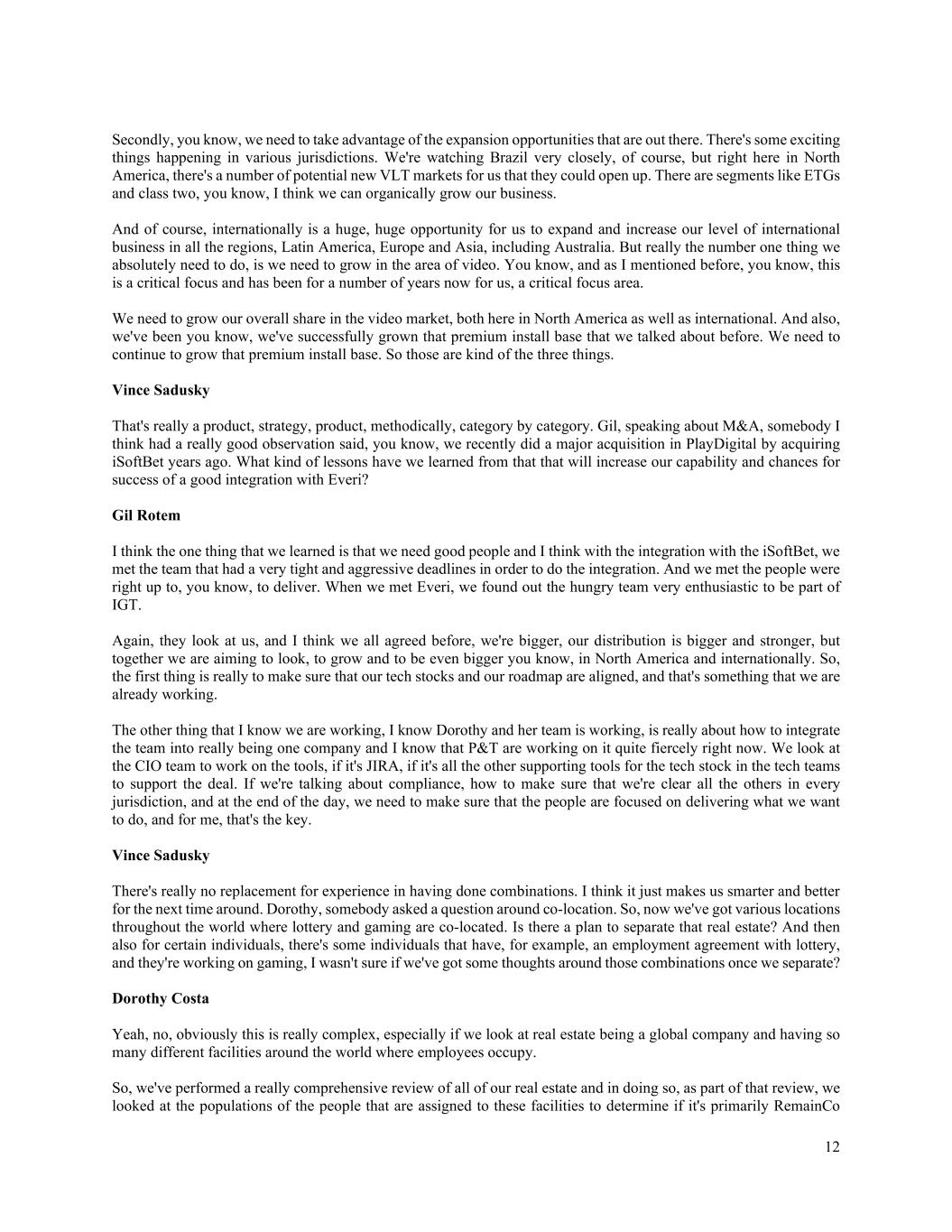 12 Secondly, you know, we need to take advantage of the expansion opportunities that are out there. There's some exciting things happening in various jurisdictions. We're watching Brazil very closely, of course, but right here in North America, there's a number of potential new VLT markets for us that they could open up. There are segments like ETGs and class two, you know, I think we can organically grow our business. And of course, internationally is a huge, huge opportunity for us to expand and increase our level of international business in all the regions, Latin America, Europe and Asia, including Australia. But really the number one thing we absolutely need to do, is we need to grow in the area of video. You know, and as I mentioned before, you know, this is a critical focus and has been for a number of years now for us, a critical focus area. We need to grow our overall share in the video market, both here in North America as well as international. And also, we've been you know, we've successfully grown that premium install base that we talked about before. We need to continue to grow that premium install base. So those are kind of the three things. Vince Sadusky That's really a product, strategy, product, methodically, category by category. Gil, speaking about M&A, somebody I think had a really good observation said, you know, we recently did a major acquisition in PlayDigital by acquiring iSoftBet years ago. What kind of lessons have we learned from that that will increase our capability and chances for success of a good integration with Everi? Gil Rotem I think the one thing that we learned is that we need good people and I think with the integration with the iSoftBet, we met the team that had a very tight and aggressive deadlines in order to do the integration. And we met the people were right up to, you know, to deliver. When we met Everi, we found out the hungry team very enthusiastic to be part of IGT. Again, they look at us, and I think we all agreed before, we're bigger, our distribution is bigger and stronger, but together we are aiming to look, to grow and to be even bigger you know, in North America and internationally. So, the first thing is really to make sure that our tech stocks and our roadmap are aligned, and that's something that we are already working. The other thing that I know we are working, I know Dorothy and her team is working, is really about how to integrate the team into really being one company and I know that P&T are working on it quite fiercely right now. We look at the CIO team to work on the tools, if it's JIRA, if it's all the other supporting tools for the tech stock in the tech teams to support the deal. If we're talking about compliance, how to make sure that we're clear all the others in every jurisdiction, and at the end of the day, we need to make sure that the people are focused on delivering what we want to do, and for me, that's the key. Vince Sadusky There's really no replacement for experience in having done combinations. I think it just makes us smarter and better for the next time around. Dorothy, somebody asked a question around co-location. So, now we've got various locations throughout the world where lottery and gaming are co-located. Is there a plan to separate that real estate? And then also for certain individuals, there's some individuals that have, for example, an employment agreement with lottery, and they're working on gaming, I wasn't sure if we've got some thoughts around those combinations once we separate? Dorothy Costa Yeah, no, obviously this is really complex, especially if we look at real estate being a global company and having so many different facilities around the world where employees occupy. So, we've performed a really comprehensive review of all of our real estate and in doing so, as part of that review, we looked at the populations of the people that are assigned to these facilities to determine if it's primarily RemainCo