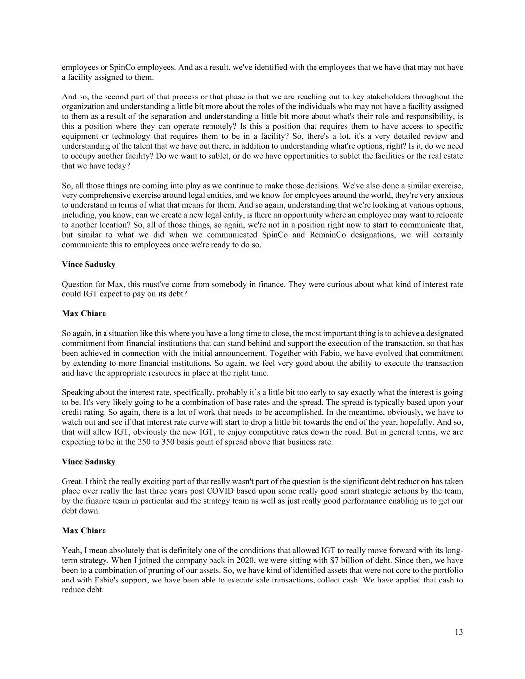 13 employees or SpinCo employees. And as a result, we've identified with the employees that we have that may not have a facility assigned to them. And so, the second part of that process or that phase is that we are reaching out to key stakeholders throughout the organization and understanding a little bit more about the roles of the individuals who may not have a facility assigned to them as a result of the separation and understanding a little bit more about what's their role and responsibility, is this a position where they can operate remotely? Is this a position that requires them to have access to specific equipment or technology that requires them to be in a facility? So, there's a lot, it's a very detailed review and understanding of the talent that we have out there, in addition to understanding what're options, right? Is it, do we need to occupy another facility? Do we want to sublet, or do we have opportunities to sublet the facilities or the real estate that we have today? So, all those things are coming into play as we continue to make those decisions. We've also done a similar exercise, very comprehensive exercise around legal entities, and we know for employees around the world, they're very anxious to understand in terms of what that means for them. And so again, understanding that we're looking at various options, including, you know, can we create a new legal entity, is there an opportunity where an employee may want to relocate to another location? So, all of those things, so again, we're not in a position right now to start to communicate that, but similar to what we did when we communicated SpinCo and RemainCo designations, we will certainly communicate this to employees once we're ready to do so. Vince Sadusky Question for Max, this must've come from somebody in finance. They were curious about what kind of interest rate could IGT expect to pay on its debt? Max Chiara So again, in a situation like this where you have a long time to close, the most important thing is to achieve a designated commitment from financial institutions that can stand behind and support the execution of the transaction, so that has been achieved in connection with the initial announcement. Together with Fabio, we have evolved that commitment by extending to more financial institutions. So again, we feel very good about the ability to execute the transaction and have the appropriate resources in place at the right time. Speaking about the interest rate, specifically, probably it’s a little bit too early to say exactly what the interest is going to be. It's very likely going to be a combination of base rates and the spread. The spread is typically based upon your credit rating. So again, there is a lot of work that needs to be accomplished. In the meantime, obviously, we have to watch out and see if that interest rate curve will start to drop a little bit towards the end of the year, hopefully. And so, that will allow IGT, obviously the new IGT, to enjoy competitive rates down the road. But in general terms, we are expecting to be in the 250 to 350 basis point of spread above that business rate. Vince Sadusky Great. I think the really exciting part of that really wasn't part of the question is the significant debt reduction has taken place over really the last three years post COVID based upon some really good smart strategic actions by the team, by the finance team in particular and the strategy team as well as just really good performance enabling us to get our debt down. Max Chiara Yeah, I mean absolutely that is definitely one of the conditions that allowed IGT to really move forward with its long- term strategy. When I joined the company back in 2020, we were sitting with $7 billion of debt. Since then, we have been to a combination of pruning of our assets. So, we have kind of identified assets that were not core to the portfolio and with Fabio's support, we have been able to execute sale transactions, collect cash. We have applied that cash to reduce debt.