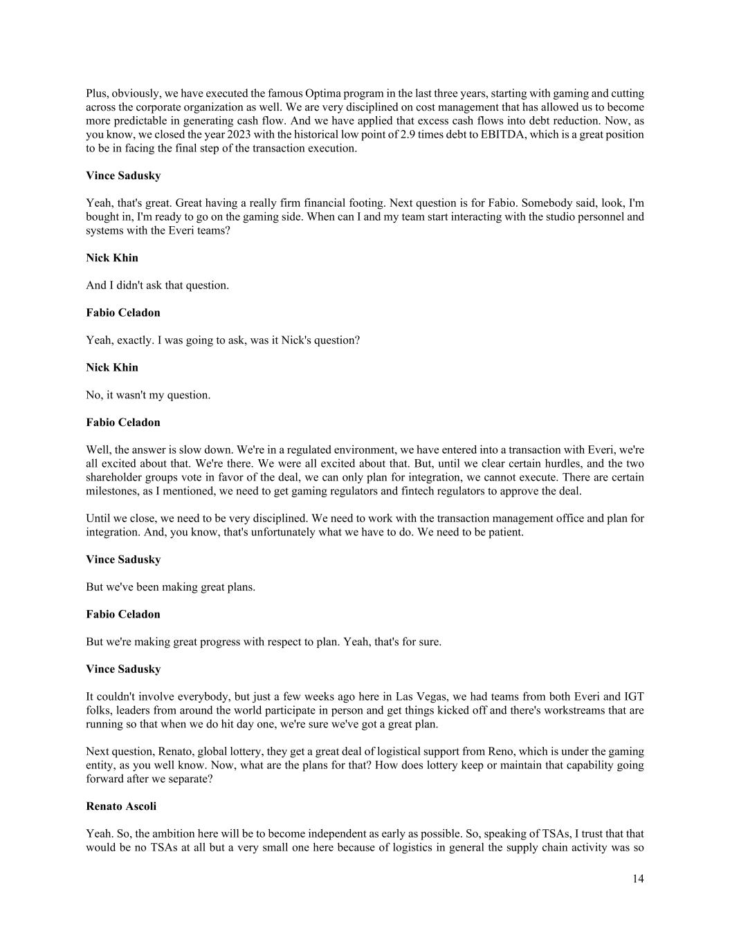 14 Plus, obviously, we have executed the famous Optima program in the last three years, starting with gaming and cutting across the corporate organization as well. We are very disciplined on cost management that has allowed us to become more predictable in generating cash flow. And we have applied that excess cash flows into debt reduction. Now, as you know, we closed the year 2023 with the historical low point of 2.9 times debt to EBITDA, which is a great position to be in facing the final step of the transaction execution. Vince Sadusky Yeah, that's great. Great having a really firm financial footing. Next question is for Fabio. Somebody said, look, I'm bought in, I'm ready to go on the gaming side. When can I and my team start interacting with the studio personnel and systems with the Everi teams? Nick Khin And I didn't ask that question. Fabio Celadon Yeah, exactly. I was going to ask, was it Nick's question? Nick Khin No, it wasn't my question. Fabio Celadon Well, the answer is slow down. We're in a regulated environment, we have entered into a transaction with Everi, we're all excited about that. We're there. We were all excited about that. But, until we clear certain hurdles, and the two shareholder groups vote in favor of the deal, we can only plan for integration, we cannot execute. There are certain milestones, as I mentioned, we need to get gaming regulators and fintech regulators to approve the deal. Until we close, we need to be very disciplined. We need to work with the transaction management office and plan for integration. And, you know, that's unfortunately what we have to do. We need to be patient. Vince Sadusky But we've been making great plans. Fabio Celadon But we're making great progress with respect to plan. Yeah, that's for sure. Vince Sadusky It couldn't involve everybody, but just a few weeks ago here in Las Vegas, we had teams from both Everi and IGT folks, leaders from around the world participate in person and get things kicked off and there's workstreams that are running so that when we do hit day one, we're sure we've got a great plan. Next question, Renato, global lottery, they get a great deal of logistical support from Reno, which is under the gaming entity, as you well know. Now, what are the plans for that? How does lottery keep or maintain that capability going forward after we separate? Renato Ascoli Yeah. So, the ambition here will be to become independent as early as possible. So, speaking of TSAs, I trust that that would be no TSAs at all but a very small one here because of logistics in general the supply chain activity was so