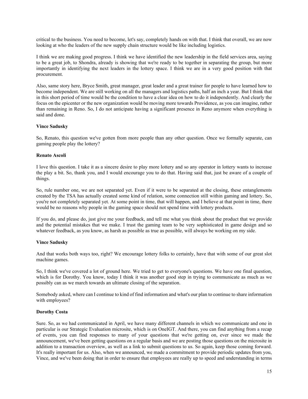15 critical to the business. You need to become, let's say, completely hands on with that. I think that overall, we are now looking at who the leaders of the new supply chain structure would be like including logistics. I think we are making good progress. I think we have identified the new leadership in the field services area, saying to be a great job, to Shondra, already is showing that we're ready to be together in separating the group, but more importantly in identifying the next leaders in the lottery space. I think we are in a very good position with that procurement. Also, same story here, Bryce Smith, great manager, great leader and a great trainer for people to have learned how to become independent. We are still working on all the managers and logistics paths, half an inch a year. But I think that in this short period of time would be the condition to have a clear idea on how to do it independently. And clearly the focus on the epicenter or the new organization would be moving more towards Providence, as you can imagine, rather than remaining in Reno. So, I do not anticipate having a significant presence in Reno anymore when everything is said and done. Vince Sadusky So, Renato, this question we've gotten from more people than any other question. Once we formally separate, can gaming people play the lottery? Renato Ascoli I love this question. I take it as a sincere desire to play more lottery and so any operator in lottery wants to increase the play a bit. So, thank you, and I would encourage you to do that. Having said that, just be aware of a couple of things. So, rule number one, we are not separated yet. Even if it were to be separated at the closing, these entanglements created by the TSA has actually created some kind of relation, some connection still within gaming and lottery. So, you're not completely separated yet. At some point in time, that will happen, and I believe at that point in time, there would be no reasons why people in the gaming space should not spend time with lottery products. If you do, and please do, just give me your feedback, and tell me what you think about the product that we provide and the potential mistakes that we make. I trust the gaming team to be very sophisticated in game design and so whatever feedback, as you know, as harsh as possible as true as possible, will always be working on my side. Vince Sadusky And that works both ways too, right? We encourage lottery folks to certainly, have that with some of our great slot machine games. So, I think we've covered a lot of ground here. We tried to get to everyone's questions. We have one final question, which is for Dorothy. You know, today I think it was another good step in trying to communicate as much as we possibly can as we march towards an ultimate closing of the separation. Somebody asked, where can I continue to kind of find information and what's our plan to continue to share information with employees? Dorothy Costa Sure. So, as we had communicated in April, we have many different channels in which we communicate and one in particular is our Strategic Evaluation microsite, which is on OneIGT. And there, you can find anything from a recap of events, you can find responses to many of your questions that we're getting on, ever since we made the announcement, we've been getting questions on a regular basis and we are posting those questions on the microsite in addition to a transaction overview, as well as a link to submit questions to us. So again, keep those coming forward. It's really important for us. Also, when we announced, we made a commitment to provide periodic updates from you, Vince, and we've been doing that in order to ensure that employees are really up to speed and understanding in terms