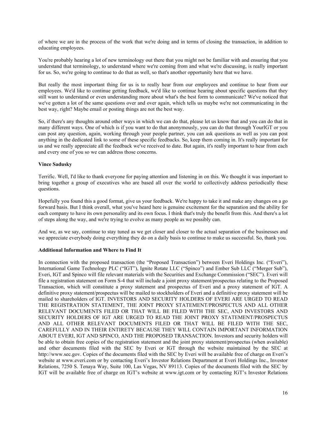 16 of where we are in the process of the work that we're doing and in terms of closing the transaction, in addition to educating employees. You're probably hearing a lot of new terminology out there that you might not be familiar with and ensuring that you understand that terminology, to understand where we're coming from and what we're discussing, is really important for us. So, we're going to continue to do that as well, so that's another opportunity here that we have. But really the most important thing for us is to really hear from our employees and continue to hear from our employees. We'd like to continue getting feedback, we'd like to continue hearing about specific questions that they still want to understand or even understanding more about what's the best form to communicate? We've noticed that we've gotten a lot of the same questions over and over again, which tells us maybe we're not communicating in the best way, right? Maybe email or posting things are not the best way. So, if there's any thoughts around other ways in which we can do that, please let us know that and you can do that in many different ways. One of which is if you want to do that anonymously, you can do that through YourIGT or you can post any question, again, working through your people partner, you can ask questions as well as you can post anything in the dedicated link to some of these specific feedbacks. So, keep them coming in. It's really important for us and we really appreciate all the feedback we've received to date. But again, it's really important to hear from each and every one of you so we can address those concerns. Vince Sadusky Terrific. Well, I'd like to thank everyone for paying attention and listening in on this. We thought it was important to bring together a group of executives who are based all over the world to collectively address periodically these questions. Hopefully you found this a good format, give us your feedback. We're happy to take it and make any changes on a go forward basis. But I think overall, what you've heard here is genuine excitement for the separation and the ability for each company to have its own personality and its own focus. I think that's truly the benefit from this. And there's a lot of steps along the way, and we're trying to evolve as many people as we possibly can. And we, as we say, continue to stay tuned as we get closer and closer to the actual separation of the businesses and we appreciate everybody doing everything they do on a daily basis to continue to make us successful. So, thank you. Additional Information and Where to Find It In connection with the proposed transaction (the “Proposed Transaction”) between Everi Holdings Inc. (“Everi”), International Game Technology PLC (“IGT”), Ignite Rotate LLC (“Spinco”) and Ember Sub LLC (“Merger Sub”), Everi, IGT and Spinco will file relevant materials with the Securities and Exchange Commission (“SEC”). Everi will file a registration statement on Form S-4 that will include a joint proxy statement/prospectus relating to the Proposed Transaction, which will constitute a proxy statement and prospectus of Everi and a proxy statement of IGT. A definitive proxy statement/prospectus will be mailed to stockholders of Everi and a definitive proxy statement will be mailed to shareholders of IGT. INVESTORS AND SECURITY HOLDERS OF EVERI ARE URGED TO READ THE REGISTRATION STATEMENT, THE JOINT PROXY STATEMENT/PROSPECTUS AND ALL OTHER RELEVANT DOCUMENTS FILED OR THAT WILL BE FILED WITH THE SEC, AND INVESTORS AND SECURITY HOLDERS OF IGT ARE URGED TO READ THE JOINT PROXY STATEMENT/PROSPECTUS AND ALL OTHER RELEVANT DOCUMENTS FILED OR THAT WILL BE FILED WITH THE SEC, CAREFULLY AND IN THEIR ENTIRETY BECAUSE THEY WILL CONTAIN IMPORTANT INFORMATION ABOUT EVERI, IGT AND SPINCO, AND THE PROPOSED TRANSACTION. Investors and security holders will be able to obtain free copies of the registration statement and the joint proxy statement/prospectus (when available) and other documents filed with the SEC by Everi or IGT through the website maintained by the SEC at http://www.sec.gov. Copies of the documents filed with the SEC by Everi will be available free of charge on Everi’s website at www.everi.com or by contacting Everi’s Investor Relations Department at Everi Holdings Inc., Investor Relations, 7250 S. Tenaya Way, Suite 100, Las Vegas, NV 89113. Copies of the documents filed with the SEC by IGT will be available free of charge on IGT’s website at www.igt.com or by contacting IGT’s Investor Relations