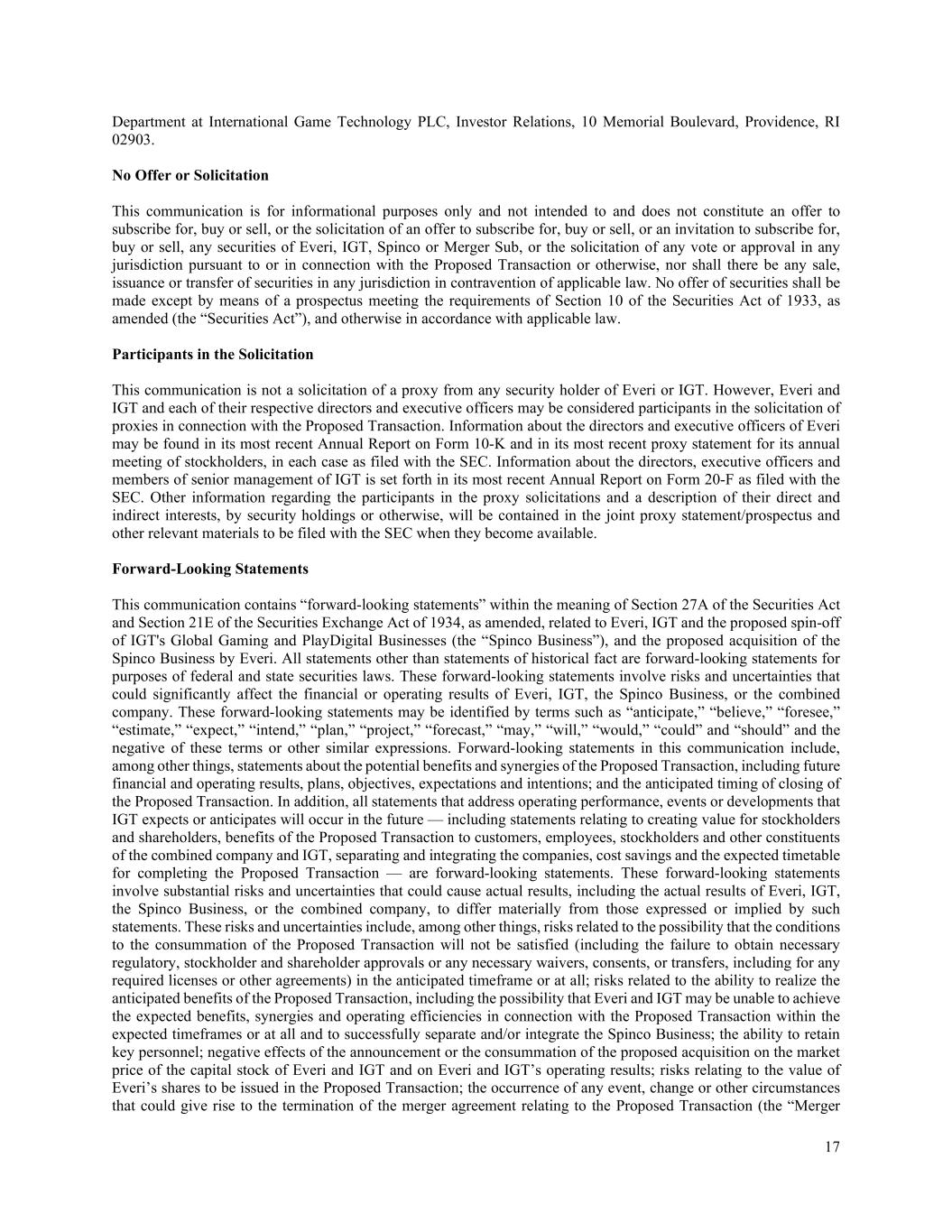 17 Department at International Game Technology PLC, Investor Relations, 10 Memorial Boulevard, Providence, RI 02903. No Offer or Solicitation This communication is for informational purposes only and not intended to and does not constitute an offer to subscribe for, buy or sell, or the solicitation of an offer to subscribe for, buy or sell, or an invitation to subscribe for, buy or sell, any securities of Everi, IGT, Spinco or Merger Sub, or the solicitation of any vote or approval in any jurisdiction pursuant to or in connection with the Proposed Transaction or otherwise, nor shall there be any sale, issuance or transfer of securities in any jurisdiction in contravention of applicable law. No offer of securities shall be made except by means of a prospectus meeting the requirements of Section 10 of the Securities Act of 1933, as amended (the “Securities Act”), and otherwise in accordance with applicable law. Participants in the Solicitation This communication is not a solicitation of a proxy from any security holder of Everi or IGT. However, Everi and IGT and each of their respective directors and executive officers may be considered participants in the solicitation of proxies in connection with the Proposed Transaction. Information about the directors and executive officers of Everi may be found in its most recent Annual Report on Form 10-K and in its most recent proxy statement for its annual meeting of stockholders, in each case as filed with the SEC. Information about the directors, executive officers and members of senior management of IGT is set forth in its most recent Annual Report on Form 20-F as filed with the SEC. Other information regarding the participants in the proxy solicitations and a description of their direct and indirect interests, by security holdings or otherwise, will be contained in the joint proxy statement/prospectus and other relevant materials to be filed with the SEC when they become available. Forward-Looking Statements This communication contains “forward-looking statements” within the meaning of Section 27A of the Securities Act and Section 21E of the Securities Exchange Act of 1934, as amended, related to Everi, IGT and the proposed spin-off of IGT's Global Gaming and PlayDigital Businesses (the “Spinco Business”), and the proposed acquisition of the Spinco Business by Everi. All statements other than statements of historical fact are forward-looking statements for purposes of federal and state securities laws. These forward-looking statements involve risks and uncertainties that could significantly affect the financial or operating results of Everi, IGT, the Spinco Business, or the combined company. These forward-looking statements may be identified by terms such as “anticipate,” “believe,” “foresee,” “estimate,” “expect,” “intend,” “plan,” “project,” “forecast,” “may,” “will,” “would,” “could” and “should” and the negative of these terms or other similar expressions. Forward-looking statements in this communication include, among other things, statements about the potential benefits and synergies of the Proposed Transaction, including future financial and operating results, plans, objectives, expectations and intentions; and the anticipated timing of closing of the Proposed Transaction. In addition, all statements that address operating performance, events or developments that IGT expects or anticipates will occur in the future — including statements relating to creating value for stockholders and shareholders, benefits of the Proposed Transaction to customers, employees, stockholders and other constituents of the combined company and IGT, separating and integrating the companies, cost savings and the expected timetable for completing the Proposed Transaction — are forward-looking statements. These forward-looking statements involve substantial risks and uncertainties that could cause actual results, including the actual results of Everi, IGT, the Spinco Business, or the combined company, to differ materially from those expressed or implied by such statements. These risks and uncertainties include, among other things, risks related to the possibility that the conditions to the consummation of the Proposed Transaction will not be satisfied (including the failure to obtain necessary regulatory, stockholder and shareholder approvals or any necessary waivers, consents, or transfers, including for any required licenses or other agreements) in the anticipated timeframe or at all; risks related to the ability to realize the anticipated benefits of the Proposed Transaction, including the possibility that Everi and IGT may be unable to achieve the expected benefits, synergies and operating efficiencies in connection with the Proposed Transaction within the expected timeframes or at all and to successfully separate and/or integrate the Spinco Business; the ability to retain key personnel; negative effects of the announcement or the consummation of the proposed acquisition on the market price of the capital stock of Everi and IGT and on Everi and IGT’s operating results; risks relating to the value of Everi’s shares to be issued in the Proposed Transaction; the occurrence of any event, change or other circumstances that could give rise to the termination of the merger agreement relating to the Proposed Transaction (the “Merger