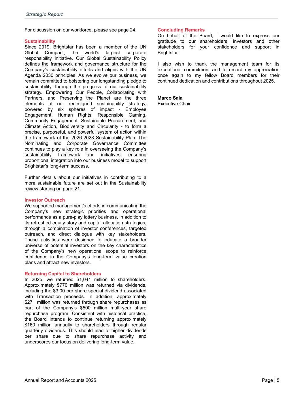 For discussion on our workforce, please see page 24. Sustainability Since 2019, Brightstar has been a member of the UN Global Compact, the world’s largest corporate responsibility initiative. Our Global Sustainability Policy defines the framework and governance structure for the Company’s sustainability efforts and aligns with the UN Agenda 2030 principles. As we evolve our business, we remain committed to bolstering our longstanding pledge to sustainability, through the progress of our sustainability strategy. Empowering Our People, Collaborating with Partners, and Preserving the Planet are the three elements of our redesigned sustainability strategy, powered by six spheres of impact - Employee Engagement, Human Rights, Responsible Gaming, Community Engagement, Sustainable Procurement, and Climate Action, Biodiversity and Circularity - to form a precise, purposeful, and powerful system of action within the framework of the 2026-2028 Sustainability Plan. The Nominating and Corporate Governance Committee continues to play a key role in overseeing the Company’s sustainability framework and initiatives, ensuring proportional integration into our business model to support Brightstar’s long-term success. Further details about our initiatives in contributing to a more sustainable future are set out in the Sustainability review starting on page 21. Investor Outreach We supported management’s efforts in communicating the Company’s new strategic priorities and operational performance as a pure-play lottery business, in addition to its refreshed equity story and capital allocation strategies, through a combination of investor conferences, targeted outreach, and direct dialogue with key stakeholders. These activities were designed to educate a broader universe of potential investors on the key characteristics of the Company’s new operational scope to reinforce confidence in the Company’s long-term value creation plans and attract new investors. Returning Capital to Shareholders In 2025, we returned $1,041 million to shareholders. Approximately $770 million was returned via dividends, including the $3.00 per share special dividend associated with Transaction proceeds. In addition, approximately $271 million was returned through share repurchases as part of the Company’s $500 million multi-year share repurchase program. Consistent with historical practice, the Board intends to continue returning approximately $160 million annually to shareholders through regular quarterly dividends. This should lead to higher dividends per share due to share repurchase activity and underscores our focus on delivering long-term value. Concluding Remarks On behalf of the Board, I would like to express our gratitude to our shareholders, investors and other stakeholders for your confidence and support in Brightstar. I also wish to thank the management team for its exceptional commitment and to record my appreciation once again to my fellow Board members for their continued dedication and contributions throughout 2025. Marco Sala Executive Chair Strategic Report Annual Report and Accounts 2025 Page | 5