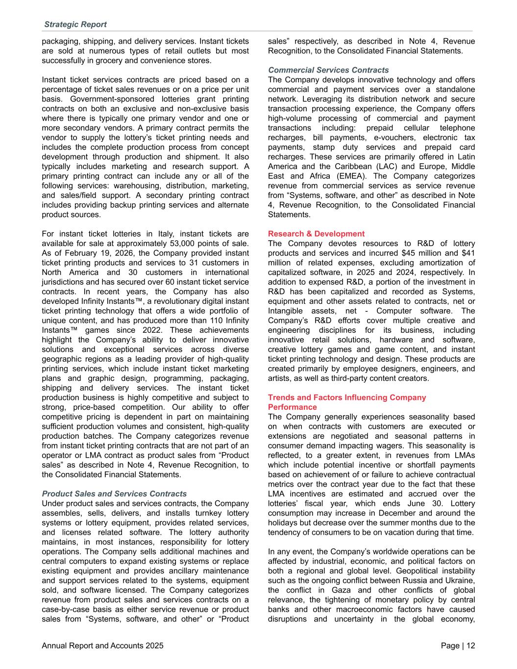 packaging, shipping, and delivery services. Instant tickets are sold at numerous types of retail outlets but most successfully in grocery and convenience stores. Instant ticket services contracts are priced based on a percentage of ticket sales revenues or on a price per unit basis. Government-sponsored lotteries grant printing contracts on both an exclusive and non-exclusive basis where there is typically one primary vendor and one or more secondary vendors. A primary contract permits the vendor to supply the lottery’s ticket printing needs and includes the complete production process from concept development through production and shipment. It also typically includes marketing and research support. A primary printing contract can include any or all of the following services: warehousing, distribution, marketing, and sales/field support. A secondary printing contract includes providing backup printing services and alternate product sources. For instant ticket lotteries in Italy, instant tickets are available for sale at approximately 53,000 points of sale. As of February 19, 2026, the Company provided instant ticket printing products and services to 31 customers in North America and 30 customers in international jurisdictions and has secured over 60 instant ticket service contracts. In recent years, the Company has also developed Infinity Instants™, a revolutionary digital instant ticket printing technology that offers a wide portfolio of unique content, and has produced more than 110 Infinity Instants™ games since 2022. These achievements highlight the Company’s ability to deliver innovative solutions and exceptional services across diverse geographic regions as a leading provider of high-quality printing services, which include instant ticket marketing plans and graphic design, programming, packaging, shipping and delivery services. The instant ticket production business is highly competitive and subject to strong, price-based competition. Our ability to offer competitive pricing is dependent in part on maintaining sufficient production volumes and consistent, high-quality production batches. The Company categorizes revenue from instant ticket printing contracts that are not part of an operator or LMA contract as product sales from “Product sales” as described in Note 4, Revenue Recognition, to the Consolidated Financial Statements. Product Sales and Services Contracts Under product sales and services contracts, the Company assembles, sells, delivers, and installs turnkey lottery systems or lottery equipment, provides related services, and licenses related software. The lottery authority maintains, in most instances, responsibility for lottery operations. The Company sells additional machines and central computers to expand existing systems or replace existing equipment and provides ancillary maintenance and support services related to the systems, equipment sold, and software licensed. The Company categorizes revenue from product sales and services contracts on a case-by-case basis as either service revenue or product sales from “Systems, software, and other” or “Product sales” respectively, as described in Note 4, Revenue Recognition, to the Consolidated Financial Statements. Commercial Services Contracts The Company develops innovative technology and offers commercial and payment services over a standalone network. Leveraging its distribution network and secure transaction processing experience, the Company offers high-volume processing of commercial and payment transactions including: prepaid cellular telephone recharges, bill payments, e-vouchers, electronic tax payments, stamp duty services and prepaid card recharges. These services are primarily offered in Latin America and the Caribbean (LAC) and Europe, Middle East and Africa (EMEA). The Company categorizes revenue from commercial services as service revenue from “Systems, software, and other” as described in Note 4, Revenue Recognition, to the Consolidated Financial Statements. Research & Development The Company devotes resources to R&D of lottery products and services and incurred $45 million and $41 million of related expenses, excluding amortization of capitalized software, in 2025 and 2024, respectively. In addition to expensed R&D, a portion of the investment in R&D has been capitalized and recorded as Systems, equipment and other assets related to contracts, net or Intangible assets, net - Computer software. The Company’s R&D efforts cover multiple creative and engineering disciplines for its business, including innovative retail solutions, hardware and software, creative lottery games and game content, and instant ticket printing technology and design. These products are created primarily by employee designers, engineers, and artists, as well as third-party content creators. Trends and Factors Influencing Company Performance The Company generally experiences seasonality based on when contracts with customers are executed or extensions are negotiated and seasonal patterns in consumer demand impacting wagers. This seasonality is reflected, to a greater extent, in revenues from LMAs which include potential incentive or shortfall payments based on achievement of or failure to achieve contractual metrics over the contract year due to the fact that these LMA incentives are estimated and accrued over the lotteries’ fiscal year, which ends June 30. Lottery consumption may increase in December and around the holidays but decrease over the summer months due to the tendency of consumers to be on vacation during that time. In any event, the Company’s worldwide operations can be affected by industrial, economic, and political factors on both a regional and global level. Geopolitical instability such as the ongoing conflict between Russia and Ukraine, the conflict in Gaza and other conflicts of global relevance, the tightening of monetary policy by central banks and other macroeconomic factors have cau
