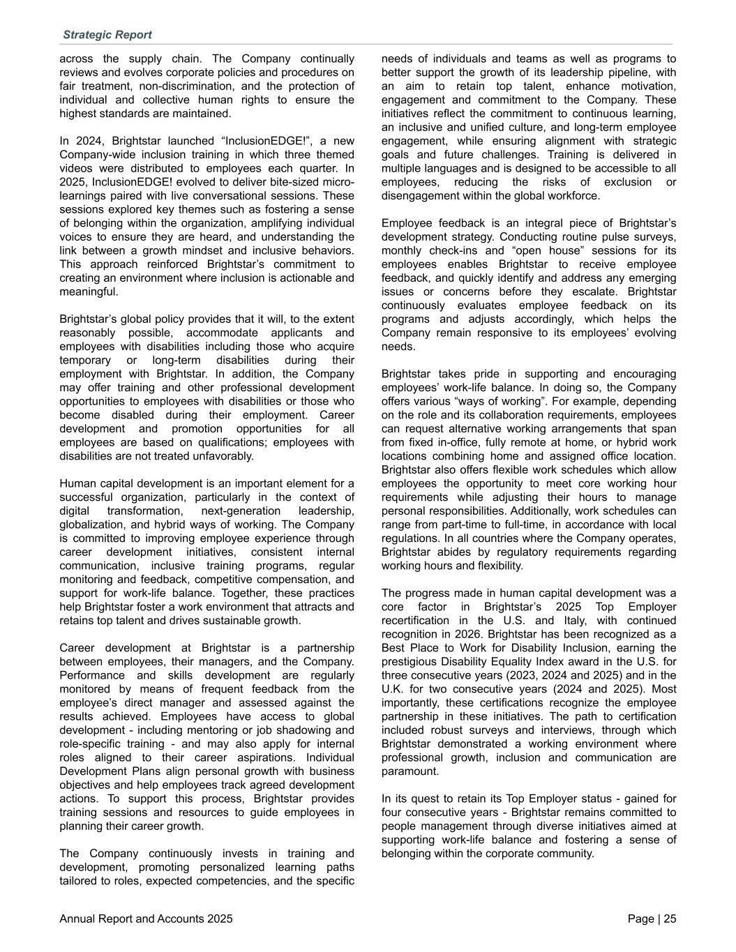 across the supply chain. The Company continually reviews and evolves corporate policies and procedures on fair treatment, non-discrimination, and the protection of individual and collective human rights to ensure the highest standards are maintained. In 2024, Brightstar launched “InclusionEDGE!”, a new Company-wide inclusion training in which three themed videos were distributed to employees each quarter. In 2025, InclusionEDGE! evolved to deliver bite-sized micro- learnings paired with live conversational sessions. These sessions explored key themes such as fostering a sense of belonging within the organization, amplifying individual voices to ensure they are heard, and understanding the link between a growth mindset and inclusive behaviors. This approach reinforced Brightstar’s commitment to creating an environment where inclusion is actionable and meaningful. Brightstar’s global policy provides that it will, to the extent reasonably possible, accommodate applicants and employees with disabilities including those who acquire temporary or long-term disabilities during their employment with Brightstar. In addition, the Company may offer training and other professional development opportunities to employees with disabilities or those who become disabled during their employment. Career development and promotion opportunities for all employees are based on qualifications; employees with disabilities are not treated unfavorably. Human capital development is an important element for a successful organization, particularly in the context of digital transformation, next-generation leadership, globalization, and hybrid ways of working. The Company is committed to improving employee experience through career development initiatives, consistent internal communication, inclusive training programs, regular monitoring and feedback, competitive compensation, and support for work-life balance. Together, these practices help Brightstar foster a work environment that attracts and retains top talent and drives sustainable growth. Career development at Brightstar is a partnership between employees, their managers, and the Company. Performance and skills development are regularly monitored by means of frequent feedback from the employee’s direct manager and assessed against the results achieved. Employees have access to global development - including mentoring or job shadowing and role-specific training - and may also apply for internal roles aligned to their career aspirations. Individual Development Plans align personal growth with business objectives and help employees track agreed development actions. To support this process, Brightstar provides training sessions and resources to guide employees in planning their career growth. The Company continuously invests in training and development, promoting personalized learning paths tailored to roles, expected competencies, and the specific needs of individuals and teams as well as programs to better support the growth of its leadership pipeline, with an aim to retain top talent, enhance motivation, engagement and commitment to the Company. These initiatives reflect the commitment to continuous learning, an inclusive and unified culture, and long-term employee engagement, while ensuring alignment with strategic goals and future challenges. Training is delivered in multiple languages and is designed to be accessible to all employees, reducing the risks of exclusion or disengagement within the global workforce. Employee feedback is an integral piece of Brightstar’s development strategy. Conducting routine pulse surveys, monthly check-ins and “open house” sessions for its employees enables Brightstar to receive employee feedback, and quickly identify and address any emerging issues or concerns before they escalate. Brightstar continuously evaluates employee feedback on its programs and adjusts accordingly, which helps the Company remain responsive to its employees’ evolving needs. Brightstar takes pride in supporting and encouraging employees’ work-life balance. In doing so, the Company offers various “ways of working”. For example, depending on the role and its collaboration requirements, employees can request alternative working arrangements that span from fixed in-office, fully remote at home, or hybrid work locations combining home and assigned office location. Brightstar also offers flexible work schedules which allow employees the opportunity to meet core working hour requirements while adjusting their hours to manage personal responsibilities. Additionally, work schedules can range from part-time to full-time, in accordance with local regulations. In all countries where the Company operates, Brightstar abides by regulatory requirements regarding working hours and flexibility. The progress made in human capital development was a core factor in Brightstar’s 2025 Top Employer recertification in the U.S. and Italy, with continued recognition in 2026. Brightstar has been recognized as a Best Place to Work for Disability Inclusion, earning the prestigious Disability Equality Index award in the U.S. for three consecutive years (2023, 2024 and 2025) and in the U.K. for two consecutive years (2024 and 2025). Most importantly, these certifications recognize the employee partnership in these initiatives. The path to certification included robust surveys and interviews, through which Brightstar demonstrated a working environment where professional growth, inclusion and communication are paramount. In its quest to retain its Top Employer status - gained for four consecutive years - Brightstar remains committed to people management through diverse initiatives aimed at supporting work-life balance and fostering a sense of belonging within the corporate community. Strategic Report Annual Report and Accounts 2025 Page | 25