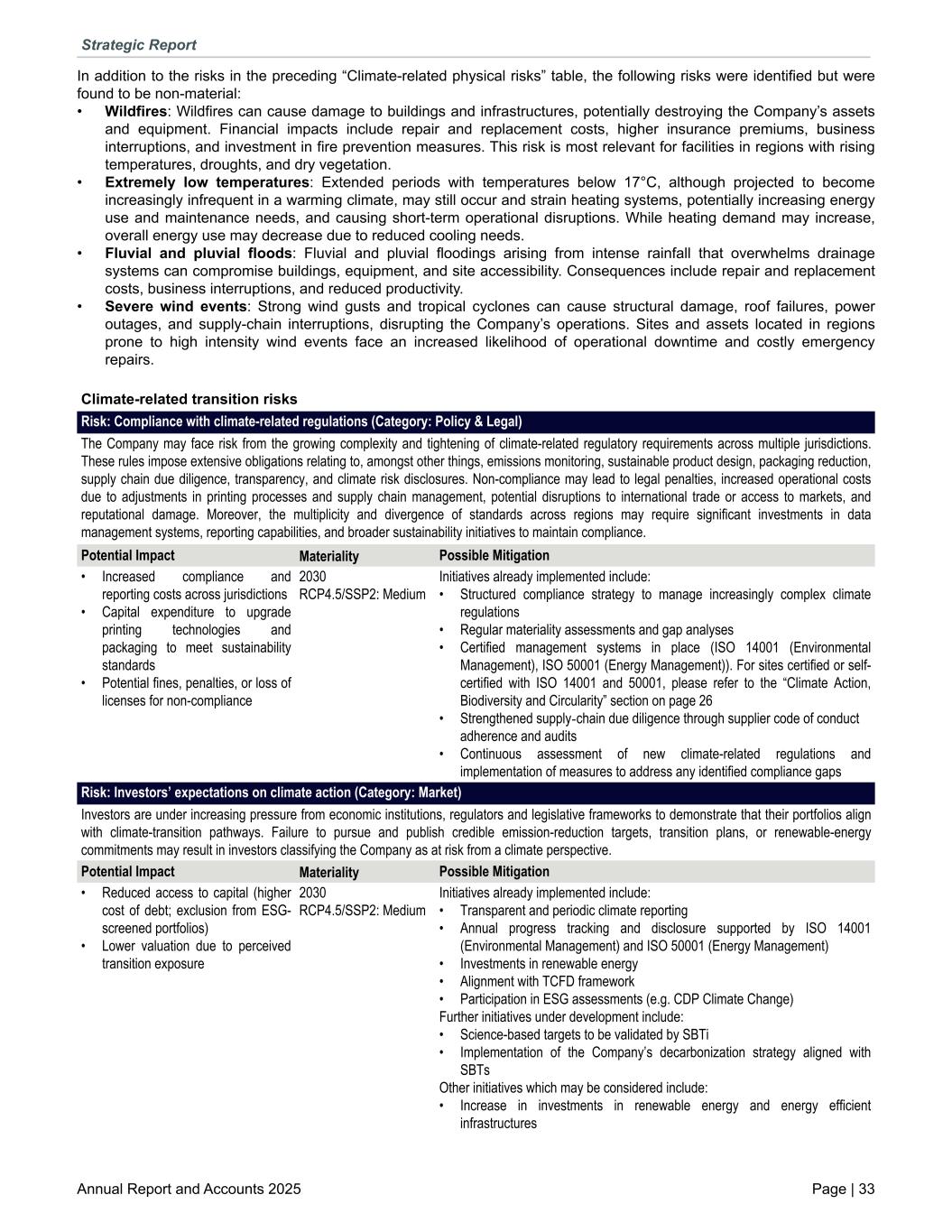 In addition to the risks in the preceding “Climate-related physical risks” table, the following risks were identified but were found to be non-material: • Wildfires: Wildfires can cause damage to buildings and infrastructures, potentially destroying the Company’s assets and equipment. Financial impacts include repair and replacement costs, higher insurance premiums, business interruptions, and investment in fire prevention measures. This risk is most relevant for facilities in regions with rising temperatures, droughts, and dry vegetation. • Extremely low temperatures: Extended periods with temperatures below 17°C, although projected to become increasingly infrequent in a warming climate, may still occur and strain heating systems, potentially increasing energy use and maintenance needs, and causing short-term operational disruptions. While heating demand may increase, overall energy use may decrease due to reduced cooling needs. • Fluvial and pluvial floods: Fluvial and pluvial floodings arising from intense rainfall that overwhelms drainage systems can compromise buildings, equipment, and site accessibility. Consequences include repair and replacement costs, business interruptions, and reduced productivity. • Severe wind events: Strong wind gusts and tropical cyclones can cause structural damage, roof failures, power outages, and supply-chain interruptions, disrupting the Company’s operations. Sites and assets located in regions prone to high intensity wind events face an increased likelihood of operational downtime and costly emergency repairs. Climate-related transition risks Risk: Compliance with climate-related regulations (Category: Policy & Legal) The Company may face risk from the growing complexity and tightening of climate-related regulatory requirements across multiple jurisdictions. These rules impose extensive obligations relating to, amongst other things, emissions monitoring, sustainable product design, packaging reduction, supply chain due diligence, transparency, and climate risk disclosures. Non-compliance may lead to legal penalties, increased operational costs due to adjustments in printing processes and supply chain management, potential disruptions to international trade or access to markets, and reputational damage. Moreover, the multiplicity and divergence of standards across regions may require significant investments in data management systems, reporting capabilities, and broader sustainability initiatives to maintain compliance. Potential Impact Materiality Possible Mitigation • Increased compliance and reporting costs across jurisdictions • Capital expenditure to upgrade printing technologies and packaging to meet sustainability standards • Potential fines, penalties, or loss of licenses for non-compliance 2030 RCP4.5/SSP2: Medium Initiatives already implemented include: • Structured compliance strategy to manage increasingly complex climate regulations • Regular materiality assessments and gap analyses • Certified management systems in place (ISO 14001 (Environmental Management), ISO 50001 (Energy Management)). For sites certified or self- certified with ISO 14001 and 50001, please refer to the “Climate Action, Biodiversity and Circularity” section on page 26 • Strengthened supply-chain due diligence through supplier code of conduct adherence and audits • Continuous assessment of new climate-related regulations and implementation of measures to address any identified compliance gaps Risk: Investors’ expectations on climate action (Category: Market) Investors are under increasing pressure from economic institutions, regulators and legislative frameworks to demonstrate that their portfolios align with climate-transition pathways. Failure to pursue and publish credible emission-reduction targets, transition plans, or renewable-energy commitments may result in investors classifying the Company as at risk from a climate perspective. Potential Impact Materiality Possible Mitigation • Reduced access to capital (higher cost of debt; exclusion from ESG- screened portfolios) • Lower valuation due to perceived transition exposure 2030 RCP4.5/SSP2: Medium Initiatives already implemented include: • Transparent and periodic climate reporting • Annual progress tracking and disclosure supported by ISO 14001 (Environmental Management) and ISO 50001 (Energy Management) • Investments in renewable energy • Alignment with TCFD framework • Participation in ESG assessments (e.g. CDP Climate Change) Further initiatives under development include: • Science-based targets to be validated by SBTi • Implementation of the Company’s decarbonization strategy aligned with SBTs Other initiatives which may be considered include: • Increase in investments in renewable energy and energy efficient infrastructures Strategic Report Annual Report and Accounts 2025 Page | 33