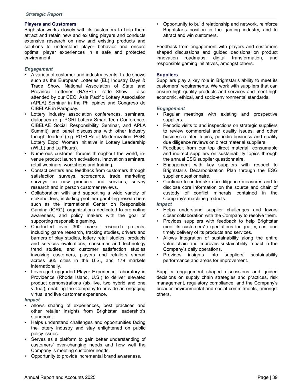Players and Customers Brightstar works closely with its customers to help them attract and retain new and existing players and conducts extensive research on new and existing products and solutions to understand player behavior and ensure optimal player experiences in a safe and protected environment. Engagement • A variety of customer and industry events, trade shows such as the European Lotteries (EL) Industry Days & Trade Show, National Association of State and Provincial Lotteries (NASPL) Trade Show - also attended by our CEO, Asia Pacific Lottery Association (APLA) Seminar in the Philippines and Congreso de CIBELAE in Paraguay. • Lottery industry association conferences, seminars, dialogues (e.g. PGRI Lottery Smart-Tech Conference, CIBELAE Social Responsibility Seminar, and APLA Summit) and panel discussions with other industry thought leaders (e.g. PGRI Retail Modernization, PGRI Lottery Expo, Women Initiative in Lottery Leadership (WILL) and La Fleurs). • Numerous customer forums throughout the world, in- venue product launch activations, innovation seminars, retail webinars, workshops and training. • Contact centers and feedback from customers through satisfaction surveys, scorecards, trade marketing surveys on new products and services, survey research and in person customer reviews. • Collaboration with and supporting a wide variety of stakeholders, including problem gambling researchers such as the International Center on Responsible Gaming (ICRG), organizations dedicated to promoting awareness, and policy makers with the goal of supporting responsible gaming. • Conducted over 300 market research projects, including game research, tracking studies, drivers and barriers of play studies, lottery retail studies, products and services evaluations, consumer and technology trend studies, and customer satisfaction studies involving customers, players and retailers spread across 665 cities in the U.S., and 179 markets internationally. • Leveraged upgraded Player Experience Laboratory in Providence (Rhode Island, U.S.) to deliver elevated product demonstrations (six live, two hybrid and one virtual), enabling the Company to provide an engaging virtual and live customer experience. Impact • Allows sharing of experiences, best practices and other retailer insights from Brightstar leadership’s standpoint. • Helps understand challenges and opportunities facing the lottery industry and stay enlightened on public policy issues. • Serves as a platform to gain better understanding of customers’ ever-changing needs and how well the Company is meeting customer needs. • Opportunity to provide incremental brand awareness. • Opportunity to build relationship and network, reinforce Brightstar’s position in the gaming industry, and to attract and win customers. Feedback from engagement with players and customers shaped discussions and guided decisions on product innovation roadmaps, digital transformation, and responsible gaming initiatives, amongst others. Suppliers Suppliers play a key role in Brightstar’s ability to meet its customers’ requirements. We work with suppliers that can ensure high quality products and services and meet high economic, ethical, and socio-environmental standards. Engagement • Regular meetings with existing and prospective suppliers. • Periodic visits to and inspections on strategic suppliers to review commercial and quality issues, and other business-related topics; periodic business and quality due diligence reviews on direct material suppliers. • Feedback from our top direct material, consumable and indirect suppliers on sustainability topics through the annual ESG supplier questionnaire. • Engagement with key suppliers with respect to Brightstar’s Decarbonization Plan through the ESG supplier questionnaire. • Continue to undertake due diligence measures and to disclose core information on the source and chain of custody of conflict minerals contained in the Company’s machine products. Impact • Helps understand supplier challenges and favors closer collaboration with the Company to resolve them. • Provides suppliers with feedback to help Brightstar meet its customers’ expectations for quality, cost and timely delivery of its products and services. • Allows integration of sustainability along the entire value chain and improves sustainability impact in the Company’s daily operations. • Provides insights into suppliers’ sustainability performance and areas for improvement. Supplier engagement shaped discussions and guided decisions on supply chain strategies and practices, risk management, regulatory compliance, and the Company's broader environmental and social commitments, amongst others. Strategic Report Annual Report and Accounts 2025 Page | 39