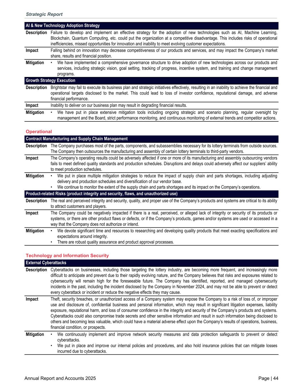 AI & New Technology Adoption Strategy Description Failure to develop and implement an effective strategy for the adoption of new technologies such as AI, Machine Learning, Blockchain, Quantum Computing, etc. could put the organization at a competitive disadvantage. This includes risks of operational inefficiencies, missed opportunities for innovation and inability to meet evolving customer expectations. Impact Falling behind on innovation may decrease competitiveness of our products and services, and may impact the Company’s market share, results and financial position. Mitigation • We have implemented a comprehensive governance structure to drive adoption of new technologies across our products and services, including strategic vision, goal setting, tracking of progress, incentive system, and training and change management programs. Growth Strategy Execution Description Brightstar may fail to execute its business plan and strategic initiatives effectively, resulting in an inability to achieve the financial and operational targets disclosed to the market. This could lead to loss of investor confidence, reputational damage, and adverse financial performance. Impact Inability to deliver on our business plan may result in degrading financial results. Mitigation • We have put in place extensive mitigation tools including ongoing strategic and scenario planning, regular oversight by management and the Board, strict performance monitoring, and continuous monitoring of external trends and competitor actions. Operational Contract Manufacturing and Supply Chain Management Description The Company purchases most of the parts, components, and subassemblies necessary for its lottery terminals from outside sources. The Company then outsources the manufacturing and assembly of certain lottery terminals to third-party vendors. Impact The Company’s operating results could be adversely affected if one or more of its manufacturing and assembly outsourcing vendors fails to meet defined quality standards and production schedules. Disruptions and delays could adversely affect our suppliers’ ability to meet production schedules. Mitigation • We put in place multiple mitigation strategies to reduce the impact of supply chain and parts shortages, including adjusting delivery and production schedules and diversification of our vendor base. • We continue to monitor the extent of the supply chain and parts shortages and its impact on the Company’s operations. Product-related Risks (product integrity and security, flaws, and unauthorized use) Description The real and perceived integrity and security, quality, and proper use of the Company’s products and systems are critical to its ability to attract customers and players. Impact The Company could be negatively impacted if there is a real, perceived, or alleged lack of integrity or security of its products or systems, or there are other product flaws or defects, or if the Company’s products, games and/or systems are used or accessed in a way that the Company does not authorize or intend. Mitigation • We devote significant time and resources to researching and developing quality products that meet exacting specifications and expectations around integrity. • There are robust quality assurance and product approval processes. Technology and Information Security External Cyberattacks Description Cyberattacks on businesses, including those targeting the lottery industry, are becoming more frequent, and increasingly more difficult to anticipate and prevent due to their rapidly evolving nature, and the Company believes that risks and exposures related to cybersecurity will remain high for the foreseeable future. The Company has identified, reported, and managed cybersecurity incidents in the past, including the incident disclosed by the Company in November 2024, and may not be able to prevent or detect every cyberattack or incident or reduce the negative effects they may cause. Impact Theft, security breaches, or unauthorized access of a Company system may expose the Company to a risk of loss of, or improper use and disclosure of, confidential business and personal information, which may result in significant litigation expenses, liability exposure, reputational harm, and loss of consumer confidence in the integrity and security of the Company’s products and systems. Cyberattacks could also compromise trade secrets and other sensitive information and result in such information being disclosed to others and becoming less valuable, which could have a material adverse effect upon the Company’s results of operations, business, financial condition, or prospects. Mitigation • We continuously implement and improve network security measures and data protection safeguards to prevent or detect cyberattacks. • We put in place and improve our internal policies and procedures, and also hold insurance policies that can mitigate losses incurred due to cyberattacks. Strategic Report Annual Report and Accounts 2025 Page | 44