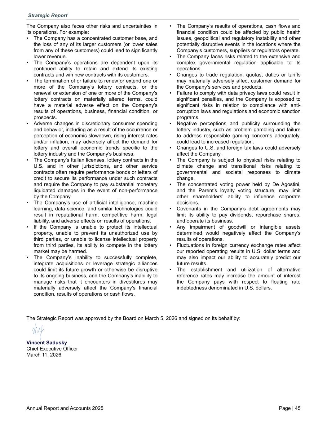 The Company also faces other risks and uncertainties in its operations. For example: • The Company has a concentrated customer base, and the loss of any of its larger customers (or lower sales from any of these customers) could lead to significantly lower revenue. • The Company’s operations are dependent upon its continued ability to retain and extend its existing contracts and win new contracts with its customers. • The termination of or failure to renew or extend one or more of the Company’s lottery contracts, or the renewal or extension of one or more of the Company’s lottery contracts on materially altered terms, could have a material adverse effect on the Company’s results of operations, business, financial condition, or prospects. • Adverse changes in discretionary consumer spending and behavior, including as a result of the occurrence or perception of economic slowdown, rising interest rates and/or inflation, may adversely affect the demand for lottery and overall economic trends specific to the lottery industry and the Company’s business. • The Company’s Italian licenses, lottery contracts in the U.S. and in other jurisdictions, and other service contracts often require performance bonds or letters of credit to secure its performance under such contracts and require the Company to pay substantial monetary liquidated damages in the event of non-performance by the Company. • The Company’s use of artificial intelligence, machine learning, data science, and similar technologies could result in reputational harm, competitive harm, legal liability, and adverse effects on results of operations. • If the Company is unable to protect its intellectual property, unable to prevent its unauthorized use by third parties, or unable to license intellectual property from third parties, its ability to compete in the lottery market may be harmed. • The Company’s inability to successfully complete, integrate acquisitions or leverage strategic alliances could limit its future growth or otherwise be disruptive to its ongoing business, and the Company’s inability to manage risks that it encounters in divestitures may materially adversely affect the Company’s financial condition, results of operations or cash flows. • The Company’s results of operations, cash flows and financial condition could be affected by public health issues, geopolitical and regulatory instability and other potentially disruptive events in the locations where the Company’s customers, suppliers or regulators operate. • The Company faces risks related to the extensive and complex governmental regulation applicable to its operations. • Changes to trade regulation, quotas, duties or tariffs may materially adversely affect customer demand for the Company’s services and products. • Failure to comply with data privacy laws could result in significant penalties, and the Company is exposed to significant risks in relation to compliance with anti- corruption laws and regulations and economic sanction programs. • Negative perceptions and publicity surrounding the lottery industry, such as problem gambling and failure to address responsible gaming concerns adequately, could lead to increased regulation. • Changes to U.S. and foreign tax laws could adversely affect the Company. • The Company is subject to physical risks relating to climate change and transitional risks relating to governmental and societal responses to climate change. • The concentrated voting power held by De Agostini, and the Parent’s loyalty voting structure, may limit other shareholders’ ability to influence corporate decisions. • Covenants in the Company’s debt agreements may limit its ability to pay dividends, repurchase shares, and operate its business. • Any impairment of goodwill or intangible assets determined would negatively affect the Company’s results of operations. • Fluctuations in foreign currency exchange rates affect our reported operating results in U.S. dollar terms and may also impact our ability to accurately predict our future results. • The establishment and utilization of alternative reference rates may increase the amount of interest the Company pays with respect to floating rate indebtedness denominated in U.S. dollars. The Strategic Report was approved by the Board on March 5, 2026 and signed on its behalf by: Vincent Sadusky Chief Executive Officer March 11, 2026 Strategic Report Annual Report and Accounts 2025 Page | 45