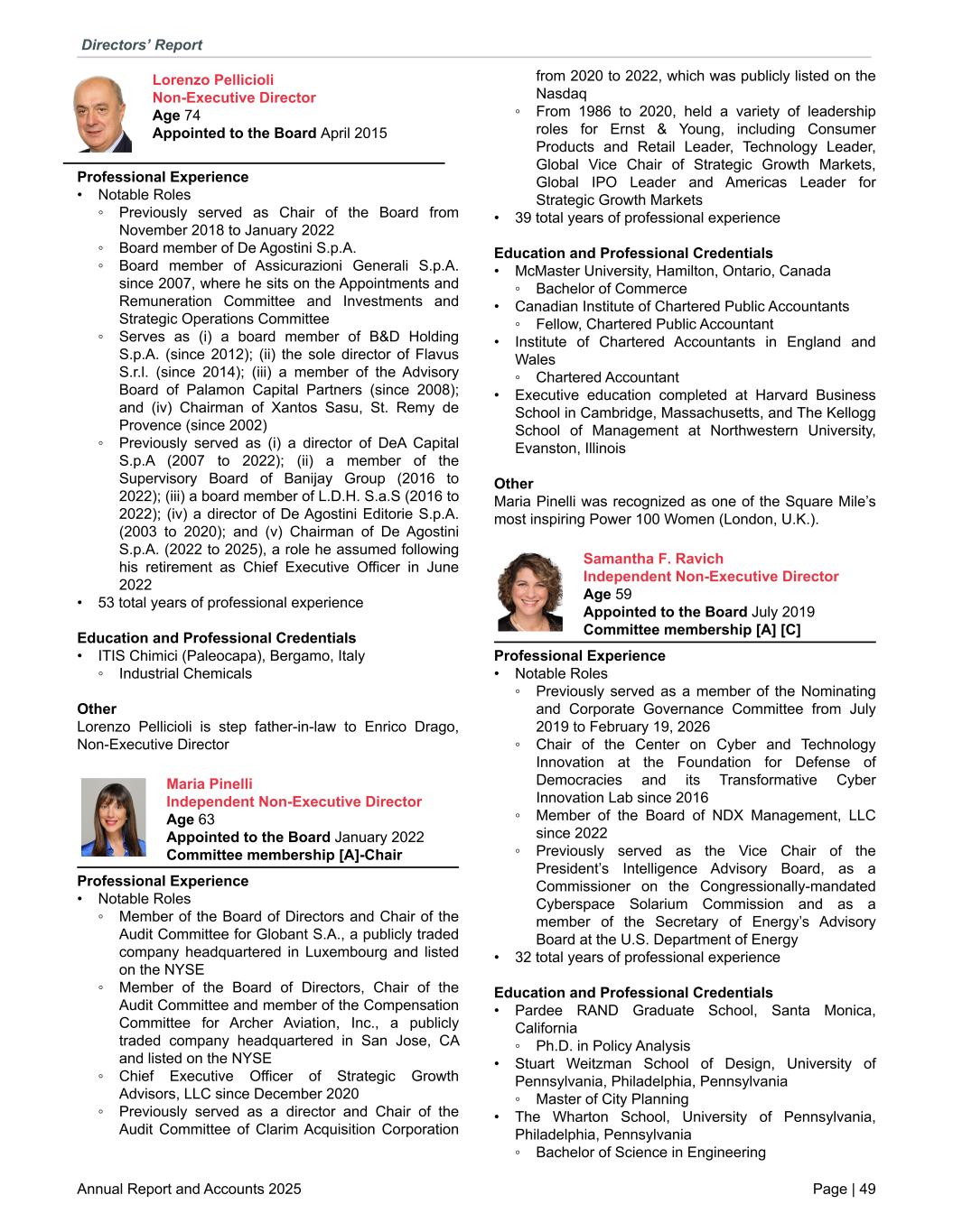 Lorenzo Pellicioli Non-Executive Director Age 74 Appointed to the Board April 2015 Professional Experience • Notable Roles ◦ Previously served as Chair of the Board from November 2018 to January 2022 ◦ Board member of De Agostini S.p.A. ◦ Board member of Assicurazioni Generali S.p.A. since 2007, where he sits on the Appointments and Remuneration Committee and Investments and Strategic Operations Committee ◦ Serves as (i) a board member of B&D Holding S.p.A. (since 2012); (ii) the sole director of Flavus S.r.l. (since 2014); (iii) a member of the Advisory Board of Palamon Capital Partners (since 2008); and (iv) Chairman of Xantos Sasu, St. Remy de Provence (since 2002) ◦ Previously served as (i) a director of DeA Capital S.p.A (2007 to 2022); (ii) a member of the Supervisory Board of Banijay Group (2016 to 2022); (iii) a board member of L.D.H. S.a.S (2016 to 2022); (iv) a director of De Agostini Editorie S.p.A. (2003 to 2020); and (v) Chairman of De Agostini S.p.A. (2022 to 2025), a role he assumed following his retirement as Chief Executive Officer in June 2022 • 53 total years of professional experience Education and Professional Credentials • ITIS Chimici (Paleocapa), Bergamo, Italy ◦ Industrial Chemicals Other Lorenzo Pellicioli is step father-in-law to Enrico Drago, Non-Executive Director Maria Pinelli Independent Non-Executive Director Age 63 Appointed to the Board January 2022 Committee membership [A]-Chair Professional Experience • Notable Roles ◦ Member of the Board of Directors and Chair of the Audit Committee for Globant S.A., a publicly traded company headquartered in Luxembourg and listed on the NYSE ◦ Member of the Board of Directors, Chair of the Audit Committee and member of the Compensation Committee for Archer Aviation, Inc., a publicly traded company headquartered in San Jose, CA and listed on the NYSE ◦ Chief Executive Officer of Strategic Growth Advisors, LLC since December 2020 ◦ Previously served as a director and Chair of the Audit Committee of Clarim Acquisition Corporation from 2020 to 2022, which was publicly listed on the Nasdaq ◦ From 1986 to 2020, held a variety of leadership roles for Ernst & Young, including Consumer Products and Retail Leader, Technology Leader, Global Vice Chair of Strategic Growth Markets, Global IPO Leader and Americas Leader for Strategic Growth Markets • 39 total years of professional experience Education and Professional Credentials • McMaster University, Hamilton, Ontario, Canada ◦ Bachelor of Commerce • Canadian Institute of Chartered Public Accountants ◦ Fellow, Chartered Public Accountant • Institute of Chartered Accountants in England and Wales ◦ Chartered Accountant • Executive education completed at Harvard Business School in Cambridge, Massachusetts, and The Kellogg School of Management at Northwestern University, Evanston, Illinois Other Maria Pinelli was recognized as one of the Square Mile’s most inspiring Power 100 Women (London, U.K.). Samantha F. Ravich Independent Non-Executive Director Age 59 Appointed to the Board July 2019 Committee membership [A] [C] Professional Experience • Notable Roles ◦ Previously served as a member of the Nominating and Corporate Governance Committee from July 2019 to February 19, 2026 ◦ Chair of the Center on Cyber and Technology Innovation at the Foundation for Defense of Democracies and its Transformative Cyber Innovation Lab since 2016 ◦ Member of the Board of NDX Management, LLC since 2022 ◦ Previously served as the Vice Chair of the President’s Intelligence Advisory Board, as a Commissioner on the Congressionally-mandated Cyberspace Solarium Commission and as a member of the Secretary of Energy’s Advisory Board at the U.S. Department of Energy • 32 total years of professional experience Education and Professional Credentials • Pardee RAND Graduate School, Santa Monica, California ◦ Ph.D. in Policy Analysis • Stuart Weitzman School of Design, University of Pennsylvania, Philadelphia, Pennsylvania ◦ Master of City Planning • The Wharton School, University of Pennsylvania, Philadelphia, Pennsylvania ◦ Bachelor of Science in Engineering Directors’ Report Annual Report and Accounts 2025 Page | 49
