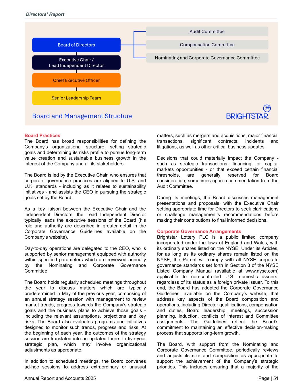 Board Practices The Board has broad responsibilities for defining the Company’s organizational structure, setting strategic goals and determining its risks profile to pursue long-term value creation and sustainable business growth in the interest of the Company and all its stakeholders. The Board is led by the Executive Chair, who ensures that corporate governance practices are aligned to U.S. and U.K. standards - including as it relates to sustainability initiatives - and assists the CEO in pursuing the strategic goals set by the Board. As a key liaison between the Executive Chair and the independent Directors, the Lead Independent Director typically leads the executive sessions of the Board (his role and authority are described in greater detail in the Corporate Governance Guidelines available on the Company’s website). Day-to-day operations are delegated to the CEO, who is supported by senior management equipped with authority within specified parameters which are reviewed annually by the Nominating and Corporate Governance Committee. The Board holds regularly scheduled meetings throughout the year to discuss matters which are typically predetermined in May of the previous year, comprising of an annual strategy session with management to review market trends, progress towards the Company’s strategic goals and the business plans to achieve those goals - including the relevant assumptions, projections and key risks. The Board also evaluates programs and initiatives designed to monitor such trends, progress and risks. At the beginning of each year, the outcomes of the strategy session are translated into an updated three- to five-year strategic plan, which may involve organizational adjustments as appropriate. In addition to scheduled meetings, the Board convenes ad-hoc sessions to address extraordinary or unusual matters, such as mergers and acquisitions, major financial transactions, significant contracts, incidents and litigations, as well as other critical business updates. Decisions that could materially impact the Company - such as strategic transactions, financing, or capital markets opportunities - or that exceed certain financial thresholds, are generally reserved for Board consideration, sometimes upon recommendation from the Audit Committee. During its meetings, the Board discusses management presentations and proposals, with the Executive Chair setting appropriate time for Directors to seek clarifications or challenge management’s recommendations before making their contributions to final informed decisions. Corporate Governance Arrangements Brightstar Lottery PLC is a public limited company incorporated under the laws of England and Wales, with its ordinary shares listed on the NYSE. Under its Articles, for as long as its ordinary shares remain listed on the NYSE, the Parent will comply with all NYSE corporate governance standards set forth in Section 3 of the NYSE Listed Company Manual (available at www.nyse.com) applicable to non-controlled U.S. domestic issuers, regardless of its status as a foreign private issuer. To this end, the Board has adopted the Corporate Governance Guidelines, available on the Company’s website, that address key aspects of the Board composition and operations, including Director qualifications, compensation and duties, Board leadership, meetings, succession planning, induction, conflicts of interest and Committee assignments. The Guidelines reflect the Board’s commitment to maintaining an effective decision-making process that supports long-term growth. The Board, with support from the Nominating and Corporate Governance Committee, periodically reviews and adjusts its size and composition as appropriate to support the achievement of the Company’s strategic priorities. This includes ensuring that a majority of the Directors’ Report Annual Report and Accounts 2025 Page | 51
