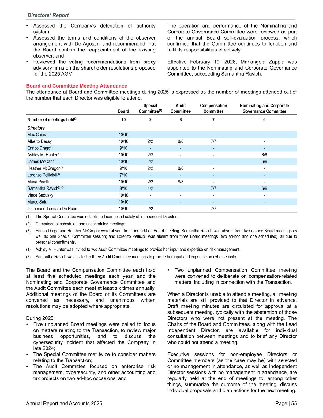 • Assessed the Company’s delegation of authority system; • Assessed the terms and conditions of the observer arrangement with De Agostini and recommended that the Board confirm the reappointment of the existing observer; and • Reviewed the voting recommendations from proxy advisory firms on the shareholder resolutions proposed for the 2025 AGM. The operation and performance of the Nominating and Corporate Governance Committee were reviewed as part of the annual Board self-evaluation process, which confirmed that the Committee continues to function and fulfil its responsibilities effectively. Effective February 19, 2026, Mariangela Zappia was appointed to the Nominating and Corporate Governance Committee, succeeding Samantha Ravich. Board and Committee Meeting Attendance The attendance at Board and Committee meetings during 2025 is expressed as the number of meetings attended out of the number that each Director was eligible to attend. Number of meetings held(2) 10 2 8 7 6 Directors Max Chiara 10/10 - - - - Alberto Dessy 10/10 2/2 8/8 7/7 - Enrico Drago(3) 9/10 - - - - Ashley M. Hunter(4) 10/10 2/2 - - 6/6 James McCann 10/10 2/2 - - 6/6 Heather McGregor(3) 9/10 2/2 8/8 - - Lorenzo Pellicioli(3) 7/10 - - - - Maria Pinelli 10/10 2/2 8/8 - - Samantha Ravich(3)(5) 8/10 1/2 - 7/7 6/6 Vince Sadusky 10/10 - - - - Marco Sala 10/10 - - - - Gianmario Tondato Da Ruos 10/10 2/2 - 7/7 - Board Special Committee(1) Audit Committee Compensation Committee Nominating and Corporate Governance Committee (1) The Special Committee was established composed solely of independent Directors. (2) Comprised of scheduled and unscheduled meetings. (3) Enrico Drago and Heather McGregor were absent from one ad-hoc Board meeting; Samantha Ravich was absent from two ad-hoc Board meetings as well as one Special Committee session; and Lorenzo Pellicioli was absent from three Board meetings (two ad-hoc and one scheduled), all due to personal commitments. (4) Ashley M. Hunter was invited to two Audit Committee meetings to provide her input and expertise on risk management. (5) Samantha Ravich was invited to three Audit Committee meetings to provide her input and expertise on cybersecurity. The Board and the Compensation Committee each hold at least five scheduled meetings each year, and the Nominating and Corporate Governance Committee and the Audit Committee each meet at least six times annually. Additional meetings of the Board or its Committees are convened as necessary, and unanimous written resolutions may be adopted where appropriate. During 2025: • Five unplanned Board meetings were called to focus on matters relating to the Transaction, to review major business opportunities, and to discuss the cybersecurity incident that affected the Company in late 2024; • The Special Committee met twice to consider matters relating to the Transaction; • The Audit Committee focused on enterprise risk management, cybersecurity, and other accounting and tax projects on two ad-hoc occasions; and • Two unplanned Compensation Committee meeting were convened to deliberate on compensation-related matters, including in connection with the Transaction. When a Director is unable to attend a meeting, all meeting materials are still provided to that Director in advance. Draft meeting minutes are circulated for approval at a subsequent meeting, typically with the abstention of those Directors who were not present at the meeting. The Chairs of the Board and Committees, along with the Lead Independent Director, are available for individual consultation between meetings and to brief any Director who could not attend a meeting. Executive sessions for non-employee Directors or Committee members (as the case may be) with selected or no management in attendance, as well as Independent Director sessions with no management in attendance, are regularly held at the end of meetings to, among other things, summarize the outcome of the meeting, discuss individual proposals and plan actions for the next meeting. Directors’ Report Annual Report and Accounts 2025 Page | 55