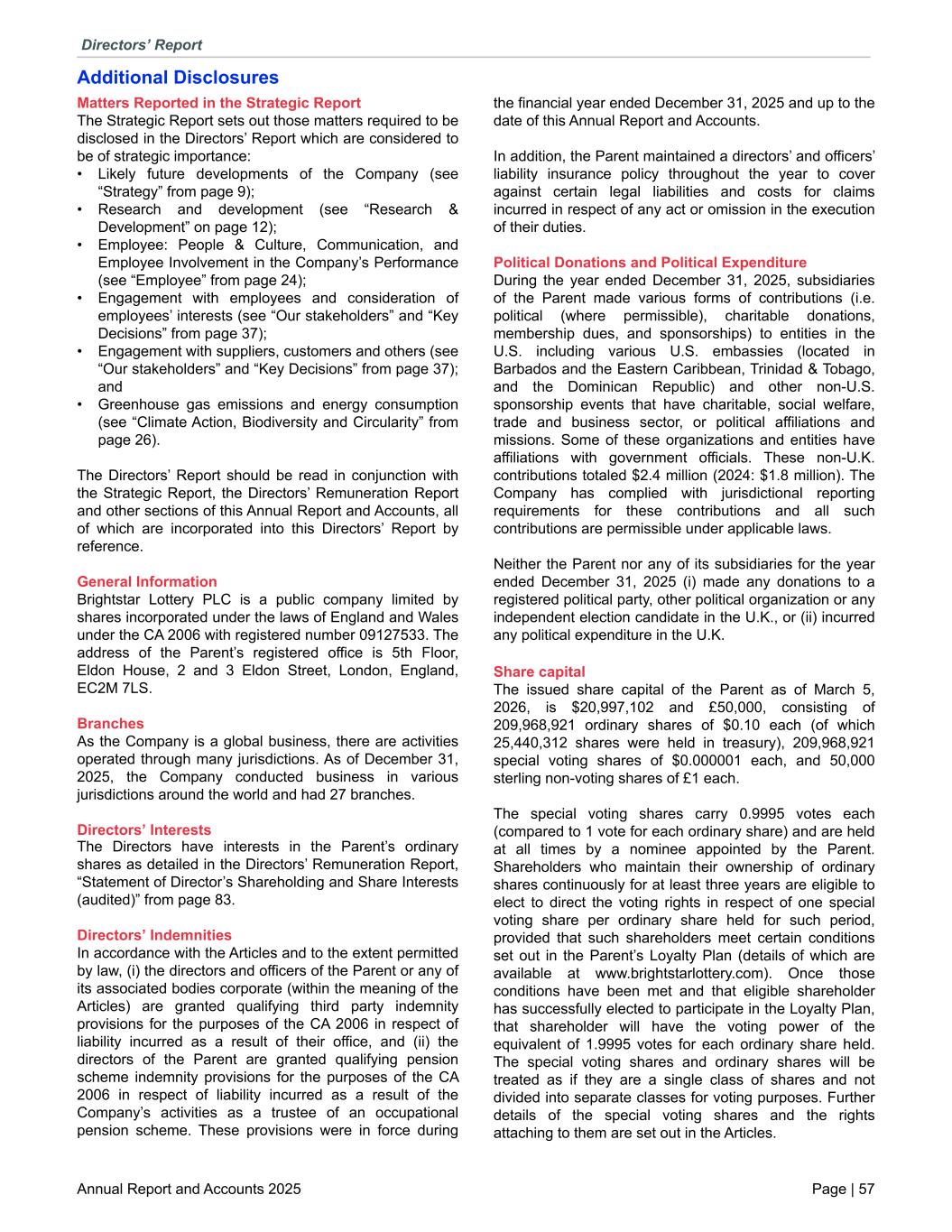 Additional Disclosures Matters Reported in the Strategic Report The Strategic Report sets out those matters required to be disclosed in the Directors’ Report which are considered to be of strategic importance: • Likely future developments of the Company (see “Strategy” from page 9); • Research and development (see “Research & Development” on page 12); • Employee: People & Culture, Communication, and Employee Involvement in the Company’s Performance (see “Employee” from page 24); • Engagement with employees and consideration of employees’ interests (see “Our stakeholders” and “Key Decisions” from page 37); • Engagement with suppliers, customers and others (see “Our stakeholders” and “Key Decisions” from page 37); and • Greenhouse gas emissions and energy consumption (see “Climate Action, Biodiversity and Circularity” from page 26). The Directors’ Report should be read in conjunction with the Strategic Report, the Directors’ Remuneration Report and other sections of this Annual Report and Accounts, all of which are incorporated into this Directors’ Report by reference. General Information Brightstar Lottery PLC is a public company limited by shares incorporated under the laws of England and Wales under the CA 2006 with registered number 09127533. The address of the Parent’s registered office is 5th Floor, Eldon House, 2 and 3 Eldon Street, London, England, EC2M 7LS. Branches As the Company is a global business, there are activities operated through many jurisdictions. As of December 31, 2025, the Company conducted business in various jurisdictions around the world and had 27 branches. Directors’ Interests The Directors have interests in the Parent’s ordinary shares as detailed in the Directors’ Remuneration Report, “Statement of Director’s Shareholding and Share Interests (audited)” from page 83. Directors’ Indemnities In accordance with the Articles and to the extent permitted by law, (i) the directors and officers of the Parent or any of its associated bodies corporate (within the meaning of the Articles) are granted qualifying third party indemnity provisions for the purposes of the CA 2006 in respect of liability incurred as a result of their office, and (ii) the directors of the Parent are granted qualifying pension scheme indemnity provisions for the purposes of the CA 2006 in respect of liability incurred as a result of the Company’s activities as a trustee of an occupational pension scheme. These provisions were in force during the financial year ended December 31, 2025 and up to the date of this Annual Report and Accounts. In addition, the Parent maintained a directors’ and officers’ liability insurance policy throughout the year to cover against certain legal liabilities and costs for claims incurred in respect of any act or omission in the execution of their duties. Political Donations and Political Expenditure During the year ended December 31, 2025, subsidiaries of the Parent made various forms of contributions (i.e. political (where permissible), charitable donations, membership dues, and sponsorships) to entities in the U.S. including various U.S. embassies (located in Barbados and the Eastern Caribbean, Trinidad & Tobago, and the Dominican Republic) and other non-U.S. sponsorship events that have charitable, social welfare, trade and business sector, or political affiliations and missions. Some of these organizations and entities have affiliations with government officials. These non-U.K. contributions totaled $2.4 million (2024: $1.8 million). The Company has complied with jurisdictional reporting requirements for these contributions and all such contributions are permissible under applicable laws. Neither the Parent nor any of its subsidiaries for the year ended December 31, 2025 (i) made any donations to a registered political party, other political organization or any independent election candidate in the U.K., or (ii) incurred any political expenditure in the U.K. Share capital The issued share capital of the Parent as of March 5, 2026, is $20,997,102 and £50,000, consisting of 209,968,921 ordinary shares of $0.10 each (of which 25,440,312 shares were held in treasury), 209,968,921 special voting shares of $0.000001 each, and 50,000 sterling non-voting shares of £1 each. The special voting shares carry 0.9995 votes each (compared to 1 vote for each ordinary share) and are held at all times by a nominee appointed by the Parent. Shareholders who maintain their ownership of ordinary shares continuously for at least three years are eligible to elect to direct the voting rights in respect of one special voting share per ordinary share held for such period, provided that such shareholders meet certain conditions set out in the Parent’s Loyalty Plan (details of which are available at www.brightstarlottery.com). Once those conditions have been met and that eligible shareholder has successfully elected to participate in the Loyalty Plan, that shareholder will have the voting power of the equivalent of 1.9995 votes for each ordinary share held. The special voting shares and ordinary shares will be treated as if they are a single class of shares and not divided into separate classes for voting purposes. Further details of the special voting shares and the rights attaching to them are set out in the Articles. Directors’ Report Annual Report and Accounts 2025 Page | 57
