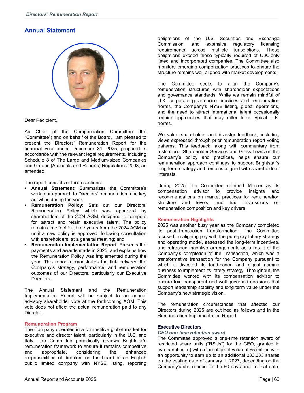 Annual Statement Dear Recipient, As Chair of the Compensation Committee (the “Committee”) and on behalf of the Board, I am pleased to present the Directors’ Remuneration Report for the financial year ended December 31, 2025, prepared in accordance with the relevant legal requirements, including Schedule 8 of The Large and Medium-sized Companies and Groups (Accounts and Reports) Regulations 2008, as amended. The report consists of three sections: • Annual Statement: Summarizes the Committee’s work, our approach to Directors’ remuneration, and key activities during the year; • Remuneration Policy: Sets out our Directors’ Remuneration Policy which was approved by shareholders at the 2024 AGM, designed to compete for, attract and retain executive talent. The policy remains in effect for three years from the 2024 AGM or until a new policy is approved, following consultation with shareholders, at a general meeting; and • Remuneration Implementation Report: Presents the payments and awards made in 2025, and explains how the Remuneration Policy was implemented during the year. This report demonstrates the link between the Company’s strategy, performance, and remuneration outcomes of our Directors, particularly our Executive Directors. The Annual Statement and the Remuneration Implementation Report will be subject to an annual advisory shareholder vote at the forthcoming AGM. This vote does not affect the actual remuneration paid to any Director. Remuneration Program The Company operates in a competitive global market for executive and director talent, particularly in the U.S. and Italy. The Committee periodically reviews Brightstar’s remuneration framework to ensure it remains competitive and appropriate, considering the enhanced responsibilities of directors on the board of an English public limited company with NYSE listing, reporting obligations of the U.S. Securities and Exchange Commission, and extensive regulatory licensing requirements across multiple jurisdictions. These obligations exceed those typically required of U.K.-only listed and incorporated companies. The Committee also monitors emerging compensation practices to ensure the structure remains well-aligned with market developments. The Committee seeks to align the Company’s remuneration structures with shareholder expectations and governance standards. While we remain mindful of U.K. corporate governance practices and remuneration norms, the Company’s NYSE listing, global operations, and the need to attract international talent occasionally require approaches that may differ from typical U.K. norms. We value shareholder and investor feedback, including views expressed through prior remuneration report voting patterns. This feedback, along with commentary from Institutional Shareholder Services and Glass Lewis on the Company’s policy and practices, helps ensure our remuneration approach continues to support Brightstar’s long-term strategy and remains aligned with shareholders’ interests. During 2025, the Committee retained Mercer as its compensation advisor to provide insights and recommendations on market practices for remuneration structure and levels, and had discussions on remuneration composition and key drivers. Remuneration Highlights 2025 was another busy year as the Company completed its post-Transaction transformation. The Committee focused on aligning pay with the pure-play lottery strategy and operating model, assessed the long-term incentives, and refreshed incentive arrangements as a result of the Company’s completion of the Transaction, which was a transformative transaction for the Company pursuant to which it divested its land-based and digital gaming business to implement its lottery strategy. Throughout, the Committee worked with its compensation advisor to ensure fair, transparent and well-governed decisions that support leadership stability and long-term value under the Company’s new strategic vision. The remuneration circumstances that affected our Directors during 2025 are outlined as follows and in the Remuneration Implementation Report. Executive Directors CEO one-time retention award The Committee approved a one-time retention award of restricted share units (“RSUs”) for the CEO, granted in two tranches: (i) with a target grant value of $5 million with an opportunity to earn up to an additional 233,333 shares on the vesting date of January 1, 2027, depending on the Company’s share price for the 60 days prior to that date, Directors’ Remuneration Report Annual Report and Accounts 2025 Page | 60