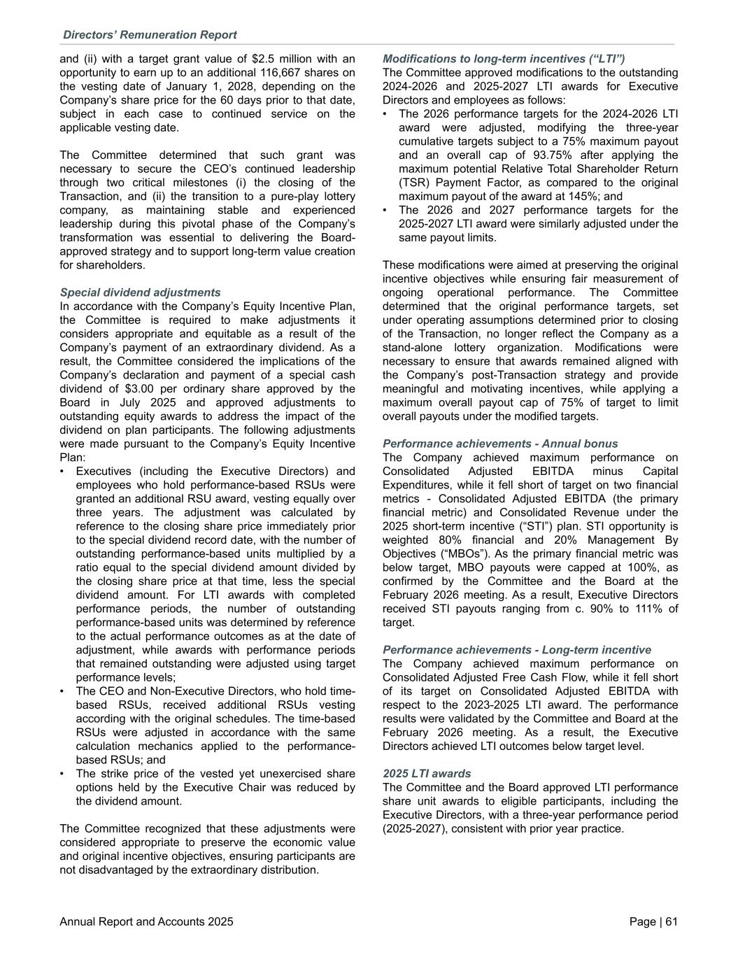 and (ii) with a target grant value of $2.5 million with an opportunity to earn up to an additional 116,667 shares on the vesting date of January 1, 2028, depending on the Company’s share price for the 60 days prior to that date, subject in each case to continued service on the applicable vesting date. The Committee determined that such grant was necessary to secure the CEO’s continued leadership through two critical milestones (i) the closing of the Transaction, and (ii) the transition to a pure-play lottery company, as maintaining stable and experienced leadership during this pivotal phase of the Company’s transformation was essential to delivering the Board- approved strategy and to support long-term value creation for shareholders. Special dividend adjustments In accordance with the Company’s Equity Incentive Plan, the Committee is required to make adjustments it considers appropriate and equitable as a result of the Company’s payment of an extraordinary dividend. As a result, the Committee considered the implications of the Company’s declaration and payment of a special cash dividend of $3.00 per ordinary share approved by the Board in July 2025 and approved adjustments to outstanding equity awards to address the impact of the dividend on plan participants. The following adjustments were made pursuant to the Company’s Equity Incentive Plan: • Executives (including the Executive Directors) and employees who hold performance-based RSUs were granted an additional RSU award, vesting equally over three years. The adjustment was calculated by reference to the closing share price immediately prior to the special dividend record date, with the number of outstanding performance-based units multiplied by a ratio equal to the special dividend amount divided by the closing share price at that time, less the special dividend amount. For LTI awards with completed performance periods, the number of outstanding performance-based units was determined by reference to the actual performance outcomes as at the date of adjustment, while awards with performance periods that remained outstanding were adjusted using target performance levels; • The CEO and Non-Executive Directors, who hold time- based RSUs, received additional RSUs vesting according with the original schedules. The time-based RSUs were adjusted in accordance with the same calculation mechanics applied to the performance- based RSUs; and • The strike price of the vested yet unexercised share options held by the Executive Chair was reduced by the dividend amount. The Committee recognized that these adjustments were considered appropriate to preserve the economic value and original incentive objectives, ensuring participants are not disadvantaged by the extraordinary distribution. Modifications to long-term incentives (“LTI”) The Committee approved modifications to the outstanding 2024-2026 and 2025-2027 LTI awards for Executive Directors and employees as follows: • The 2026 performance targets for the 2024-2026 LTI award were adjusted, modifying the three-year cumulative targets subject to a 75% maximum payout and an overall cap of 93.75% after applying the maximum potential Relative Total Shareholder Return (TSR) Payment Factor, as compared to the original maximum payout of the award at 145%; and • The 2026 and 2027 performance targets for the 2025-2027 LTI award were similarly adjusted under the same payout limits. These modifications were aimed at preserving the original incentive objectives while ensuring fair measurement of ongoing operational performance. The Committee determined that the original performance targets, set under operating assumptions determined prior to closing of the Transaction, no longer reflect the Company as a stand-alone lottery organization. Modifications were necessary to ensure that awards remained aligned with the Company’s post-Transaction strategy and provide meaningful and motivating incentives, while applying a maximum overall payout cap of 75% of target to limit overall payouts under the modified targets. Performance achievements - Annual bonus The Company achieved maximum performance on Consolidated Adjusted EBITDA minus Capital Expenditures, while it fell short of target on two financial metrics - Consolidated Adjusted EBITDA (the primary financial metric) and Consolidated Revenue under the 2025 short-term incentive (“STI”) plan. STI opportunity is weighted 80% financial and 20% Management By Objectives (“MBOs”). As the primary financial metric was below target, MBO payouts were capped at 100%, as confirmed by the Committee and the Board at the February 2026 meeting. As a result, Executive Directors received STI payouts ranging from c. 90% to 111% of target. Performance achievements - Long-term incentive The Company achieved maximum performance on Consolidated Adjusted Free Cash Flow, while it fell short of its target on Consolidated Adjusted EBITDA with respect to the 2023-2025 LTI award. The performance results were validated by the Committee and Board at the February 2026 meeting. As a result, the Executive Directors achieved LTI outcomes below target level. 2025 LTI awards The Committee and the Board approved LTI performance share unit awards to eligible participants, including the Executive Directors, with a three-year performance period (2025-2027), consistent with prior year practice. Directors’ Remuneration Report Annual Report and Accounts 2025 Page | 61