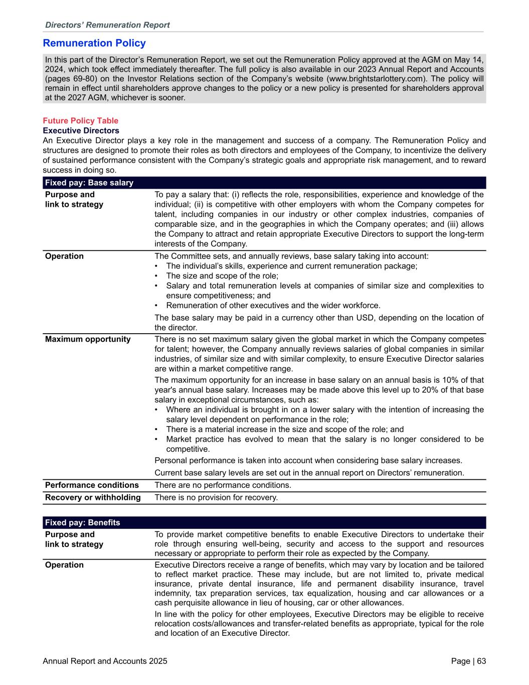 Remuneration Policy In this part of the Director’s Remuneration Report, we set out the Remuneration Policy approved at the AGM on May 14, 2024, which took effect immediately thereafter. The full policy is also available in our 2023 Annual Report and Accounts (pages 69-80) on the Investor Relations section of the Company’s website (www.brightstarlottery.com). The policy will remain in effect until shareholders approve changes to the policy or a new policy is presented for shareholders approval at the 2027 AGM, whichever is sooner. Future Policy Table Executive Directors An Executive Director plays a key role in the management and success of a company. The Remuneration Policy and structures are designed to promote their roles as both directors and employees of the Company, to incentivize the delivery of sustained performance consistent with the Company’s strategic goals and appropriate risk management, and to reward success in doing so. Fixed pay: Base salary Purpose and link to strategy To pay a salary that: (i) reflects the role, responsibilities, experience and knowledge of the individual; (ii) is competitive with other employers with whom the Company competes for talent, including companies in our industry or other complex industries, companies of comparable size, and in the geographies in which the Company operates; and (iii) allows the Company to attract and retain appropriate Executive Directors to support the long-term interests of the Company. Operation The Committee sets, and annually reviews, base salary taking into account: • The individual’s skills, experience and current remuneration package; • The size and scope of the role; • Salary and total remuneration levels at companies of similar size and complexities to ensure competitiveness; and • Remuneration of other executives and the wider workforce. The base salary may be paid in a currency other than USD, depending on the location of the director. Maximum opportunity There is no set maximum salary given the global market in which the Company competes for talent; however, the Company annually reviews salaries of global companies in similar industries, of similar size and with similar complexity, to ensure Executive Director salaries are within a market competitive range. The maximum opportunity for an increase in base salary on an annual basis is 10% of that year's annual base salary. Increases may be made above this level up to 20% of that base salary in exceptional circumstances, such as: • Where an individual is brought in on a lower salary with the intention of increasing the salary level dependent on performance in the role; • There is a material increase in the size and scope of the role; and • Market practice has evolved to mean that the salary is no longer considered to be competitive. Personal performance is taken into account when considering base salary increases. Current base salary levels are set out in the annual report on Directors’ remuneration. Performance conditions There are no performance conditions. Recovery or withholding There is no provision for recovery. Fixed pay: Benefits Purpose and link to strategy To provide market competitive benefits to enable Executive Directors to undertake their role through ensuring well-being, security and access to the support and resources necessary or appropriate to perform their role as expected by the Company. Operation Executive Directors receive a range of benefits, which may vary by location and be tailored to reflect market practice. These may include, but are not limited to, private medical insurance, private dental insurance, life and permanent disability insurance, travel indemnity, tax preparation services, tax equalization, housing and car allowances or a cash perquisite allowance in lieu of housing, car or other allowances. In line with the policy for other employees, Executive Directors may be eligible to receive relocation costs/allowances and transfer-related benefits as appropriate, typical for the role and location of an Executive Director. Directors’ Remuneration Report Annual Report and Accounts 2025 Page | 63