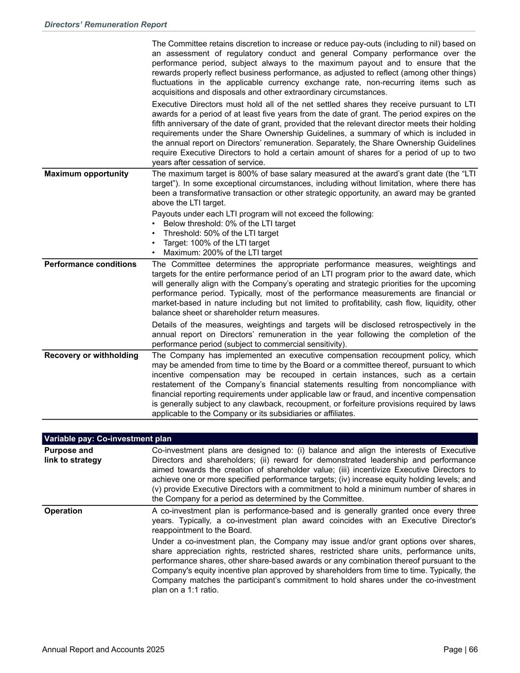 The Committee retains discretion to increase or reduce pay-outs (including to nil) based on an assessment of regulatory conduct and general Company performance over the performance period, subject always to the maximum payout and to ensure that the rewards properly reflect business performance, as adjusted to reflect (among other things) fluctuations in the applicable currency exchange rate, non-recurring items such as acquisitions and disposals and other extraordinary circumstances. Executive Directors must hold all of the net settled shares they receive pursuant to LTI awards for a period of at least five years from the date of grant. The period expires on the fifth anniversary of the date of grant, provided that the relevant director meets their holding requirements under the Share Ownership Guidelines, a summary of which is included in the annual report on Directors’ remuneration. Separately, the Share Ownership Guidelines require Executive Directors to hold a certain amount of shares for a period of up to two years after cessation of service. Maximum opportunity The maximum target is 800% of base salary measured at the award’s grant date (the “LTI target”). In some exceptional circumstances, including without limitation, where there has been a transformative transaction or other strategic opportunity, an award may be granted above the LTI target. Payouts under each LTI program will not exceed the following: • Below threshold: 0% of the LTI target • Threshold: 50% of the LTI target • Target: 100% of the LTI target • Maximum: 200% of the LTI target Performance conditions The Committee determines the appropriate performance measures, weightings and targets for the entire performance period of an LTI program prior to the award date, which will generally align with the Company’s operating and strategic priorities for the upcoming performance period. Typically, most of the performance measurements are financial or market-based in nature including but not limited to profitability, cash flow, liquidity, other balance sheet or shareholder return measures. Details of the measures, weightings and targets will be disclosed retrospectively in the annual report on Directors’ remuneration in the year following the completion of the performance period (subject to commercial sensitivity). Recovery or withholding The Company has implemented an executive compensation recoupment policy, which may be amended from time to time by the Board or a committee thereof, pursuant to which incentive compensation may be recouped in certain instances, such as a certain restatement of the Company’s financial statements resulting from noncompliance with financial reporting requirements under applicable law or fraud, and incentive compensation is generally subject to any clawback, recoupment, or forfeiture provisions required by laws applicable to the Company or its subsidiaries or affiliates. Variable pay: Co-investment plan Purpose and link to strategy Co-investment plans are designed to: (i) balance and align the interests of Executive Directors and shareholders; (ii) reward for demonstrated leadership and performance aimed towards the creation of shareholder value; (iii) incentivize Executive Directors to achieve one or more specified performance targets; (iv) increase equity holding levels; and (v) provide Executive Directors with a commitment to hold a minimum number of shares in the Company for a period as determined by the Committee. Operation A co-investment plan is performance-based and is generally granted once every three years. Typically, a co-investment plan award coincides with an Executive Director's reappointment to the Board. Under a co-investment plan, the Company may issue and/or grant options over shares, share appreciation rights, restricted shares, restricted share units, performance units, performance shares, other share-based awards or any combination thereof pursuant to the Company's equity incentive plan approved by shareholders from time to time. Typically, the Company matches the participant’s commitment to hold shares under the co-investment plan on a 1:1 ratio. Directors’ Remuneration Report Annual Report and Accounts 2025 Page | 66
