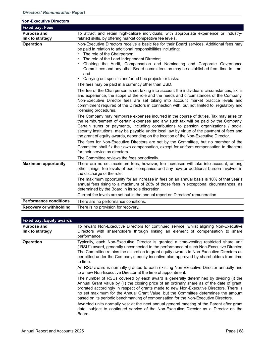 Non-Executive Directors Fixed pay: Fees Purpose and link to strategy To attract and retain high-calibre individuals, with appropriate experience or industry- related skills, by offering market competitive fee levels. Operation Non-Executive Directors receive a basic fee for their Board services. Additional fees may be paid in relation to additional responsibilities including: • The role of the Chairperson; • The role of the Lead Independent Director; • Chairing the Audit, Compensation and Nominating and Corporate Governance Committees and any other Board committees as may be established from time to time; and • Carrying out specific and/or ad hoc projects or tasks. The fees may be paid in a currency other than USD. The fee of the Chairperson is set taking into account the individual’s circumstances, skills and experience, the scope of the role and the needs and circumstances of the Company. Non-Executive Director fees are set taking into account market practice levels and commitment required of the Directors in connection with, but not limited to, regulatory and licensing procedures. The Company may reimburse expenses incurred in the course of duties. Tax may arise on the reimbursement of certain expenses and any such tax will be paid by the Company. Certain sums or payments, including contributions to pension organizations / social security institutions, may be payable under local law by virtue of the payment of fees and the grant of equity awards, depending on the location of the Non-Executive Director. The fees for Non-Executive Directors are set by the Committee, but no member of the Committee shall fix their own compensation, except for uniform compensation to directors for their service as directors. The Committee reviews the fees periodically. Maximum opportunity There are no set maximum fees; however, fee increases will take into account, among other things, fee levels of peer companies and any new or additional burden involved in the discharge of the role. The maximum opportunity for an increase in fees on an annual basis is 10% of that year’s annual fees rising to a maximum of 20% of those fees in exceptional circumstances, as determined by the Board in its sole discretion. Current fee levels are set out in the annual report on Directors’ remuneration. Performance conditions There are no performance conditions. Recovery or withholding There is no provision for recovery. Fixed pay: Equity awards Purpose and link to strategy To reward Non-Executive Directors for continued service, whilst aligning Non-Executive Directors with shareholders through linking an element of compensation to share performance. Operation Typically, each Non-Executive Director is granted a time-vesting restricted share unit (“RSU”) award, generally unconnected to the performance of such Non-Executive Director. The Committee retains the discretion to grant equity awards to Non-Executive Directors as permitted under the Company’s equity incentive plan approved by shareholders from time to time. An RSU award is normally granted to each existing Non-Executive Director annually and to a new Non-Executive Director at the time of appointment. The number of RSUs covered by each award is generally determined by dividing (i) the Annual Grant Value by (ii) the closing price of an ordinary share as of the date of grant, prorated accordingly in respect of grants made to new Non-Executive Directors. There is no set maximum for the Annual Grant Value, but the Committee determines the amount based on its periodic benchmarking of compensation for the Non-Executive Directors. Awarded units normally vest at the next annual general meeting of the Parent after grant date, subject to continued service of the Non-Executive Director as a Director on the Board. Directors’ Remuneration Report Annual Report and Accounts 2025 Page | 68